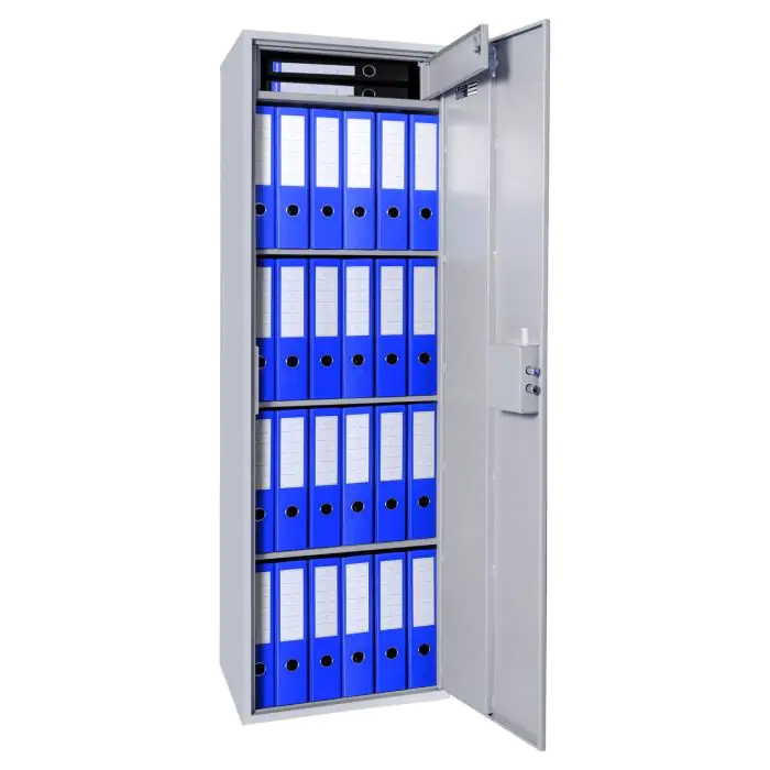 Griffon B.152.K це офісний сейф для зберігання документів, грошей та цінностей у квартирах і офісах. Бюджетна модель із міцною сталевою конструкцією та односторонньою ригельною системою замикання. Замок ключовий SK 106/4 (Україна). Усередині є трейзер, 3 полиці; передбачені анкерні отвори для кріплення до стіни.