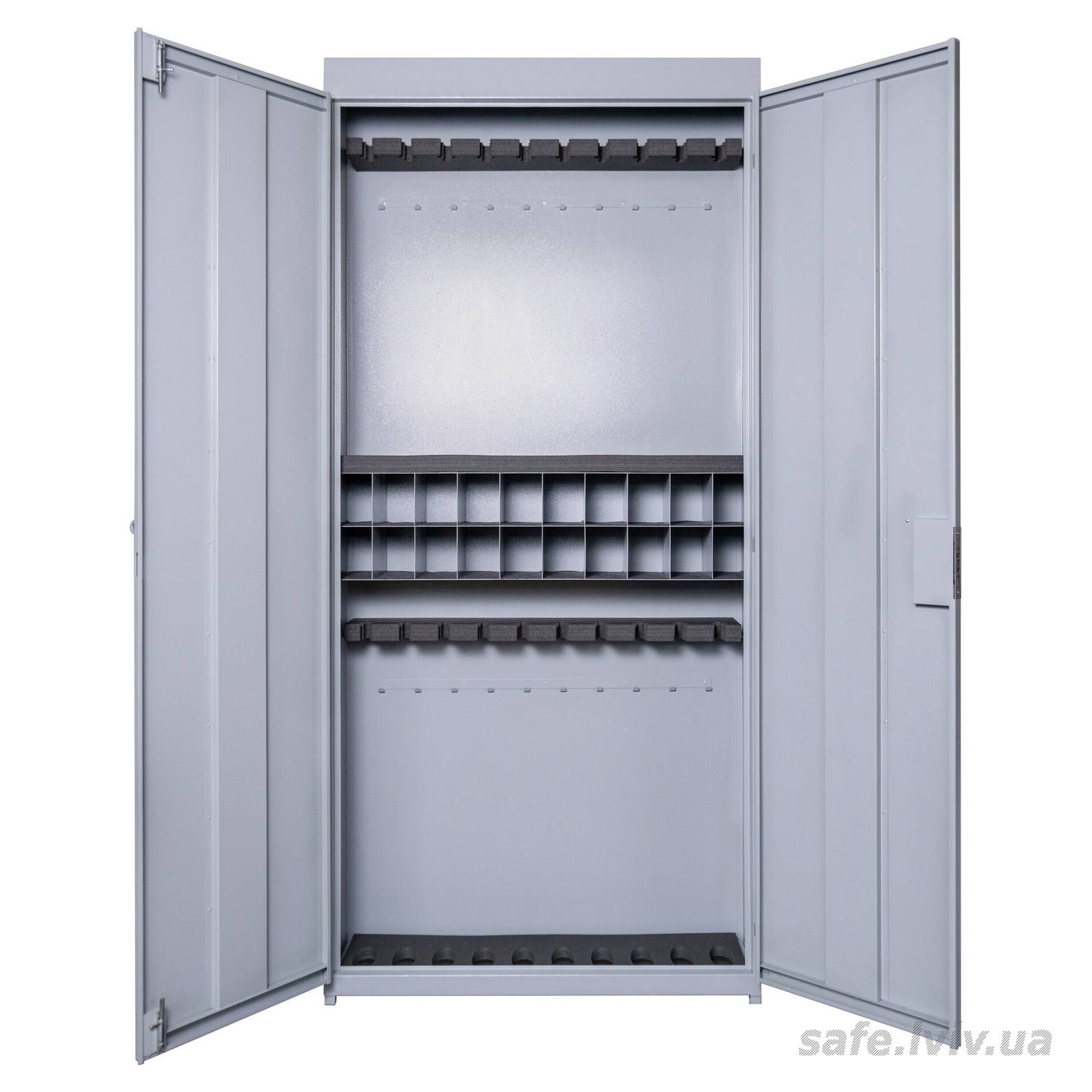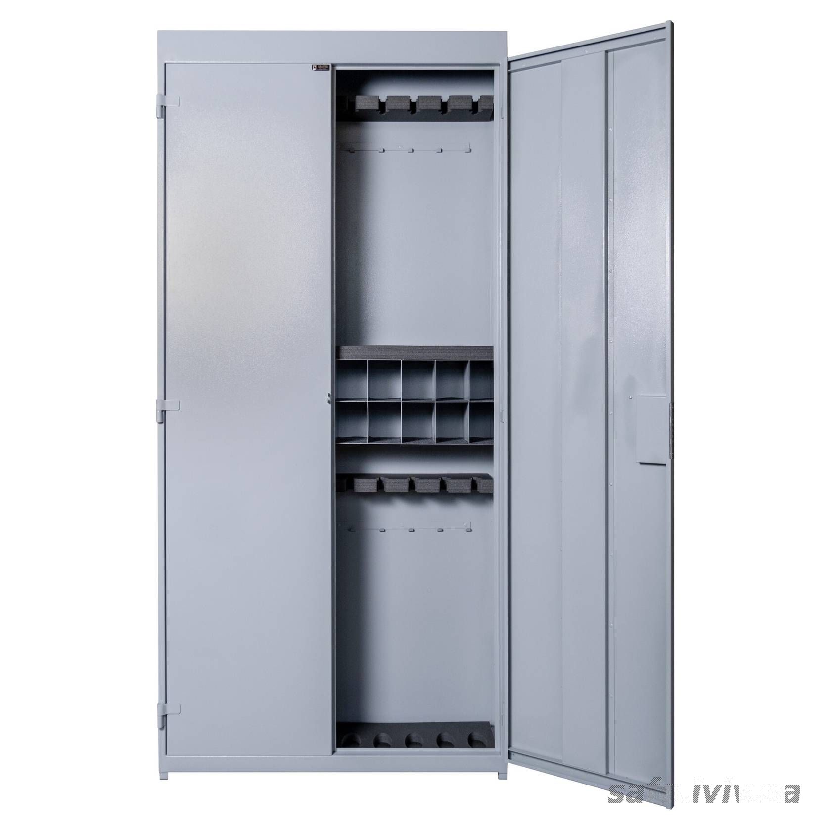Griffon CA.230 це металева шафа для зберігання стрілецької зброї, призначена для компактного та акуратного розміщення зброї у сховищі, тирі або на підприємстві. Конструкція з листової сталі: корпус 1,5 мм, двері 2 мм. Усередині встановлені ложементи з мʼякого пружного матеріалу, що не вбирає вологу та олію і не дряпає зброю. Замок ключовий SK 106/4 (Україна). Порошкове покриття, колір сірий.