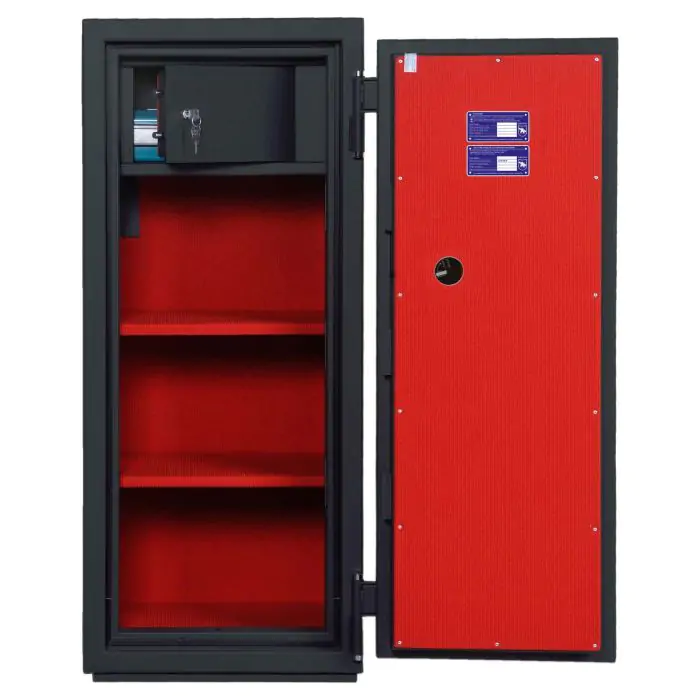 Griffon CL.II.120.K.C це сейф вогнезламостійкий, для грошей, для документів, для офісу. Рекомендований ліміт зберігання грошей - до 32 млн грн. Конструкція корпусу 40 мм (сталь - зламостійкий бетон - сталь), дверей 104 мм (сталь - зламостійкий бетон - сталь), ригельна система тристороння, 5 ригелів Ø 25 мм, пасивний ригель зі сторони петель та замок - ключовий STUV (Німеччина) VdS Class 1 (A), кодовий механічний La GARD (США) VdS Class 1 (A).