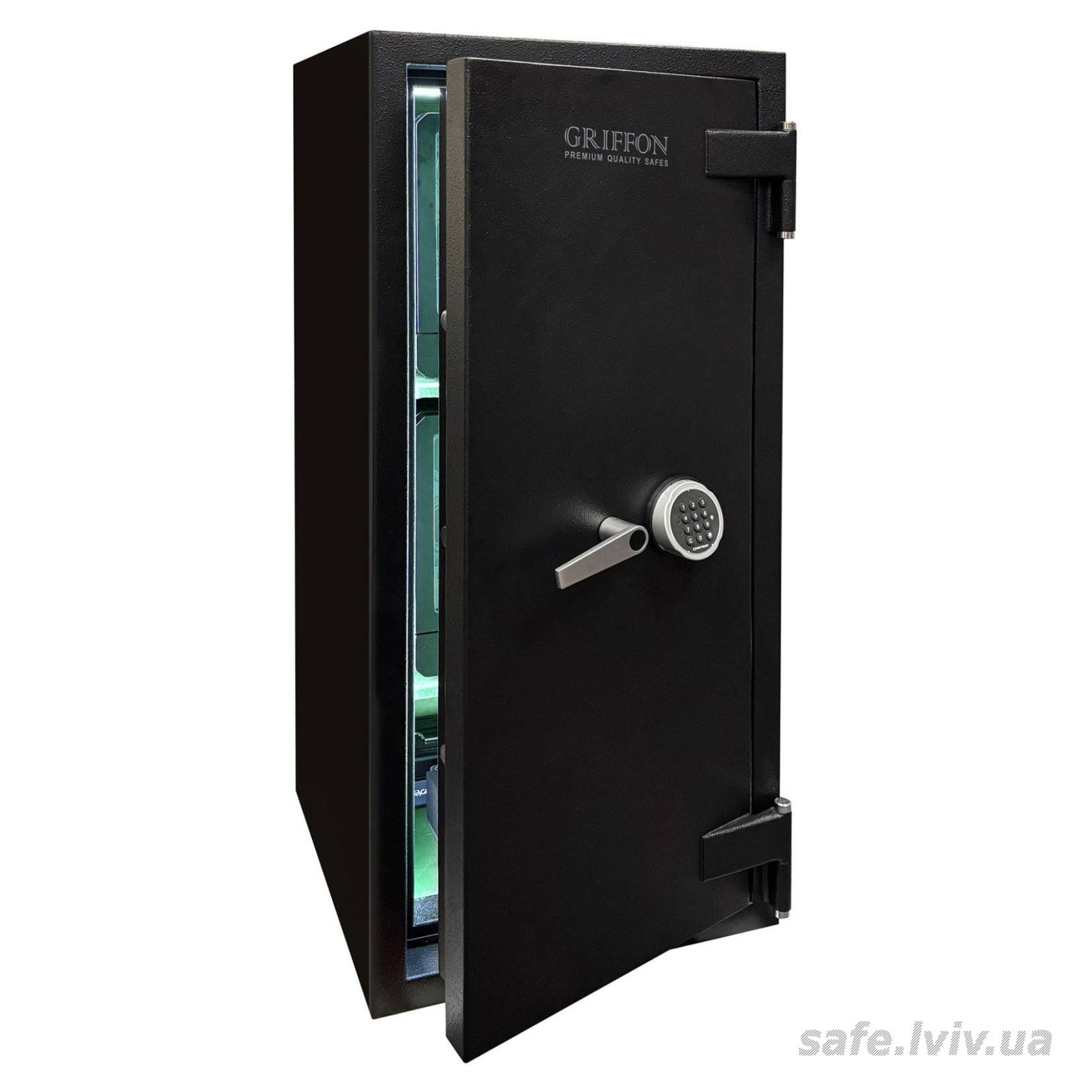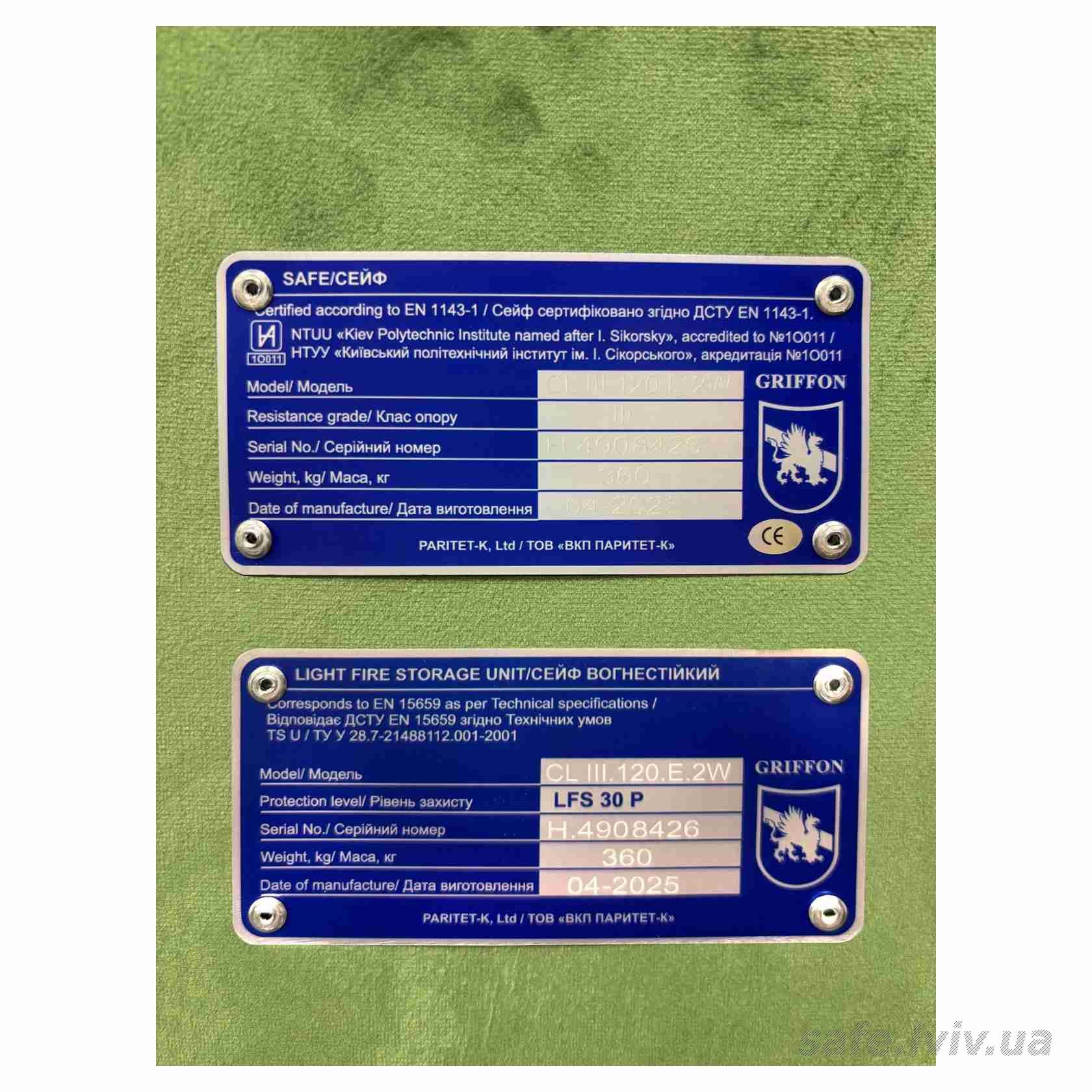 Griffon CL.III.120.E.2W це сертифікований за третім класом опору до зламу сейф, призначений для зберігання грошей, коштовностей і документів у банках, офісах та приватних будинках. Зламостійкість забезпечується конструкцією корпусу 40 мм (сталь - зламостійкий бетон - сталь), дверей 104 мм (сталь - зламостійкий бетон - сталь), ригельною системою тристороння, 7 ригелів Ø 25 мм та замком (електронний M-LOCKS (Нідерланди) VdS Class 2 (B)). Рекомендовані ліміти зберігання - до 8 000 мінімальних зарплат для особистого користування та до 4 000 для комерційного.