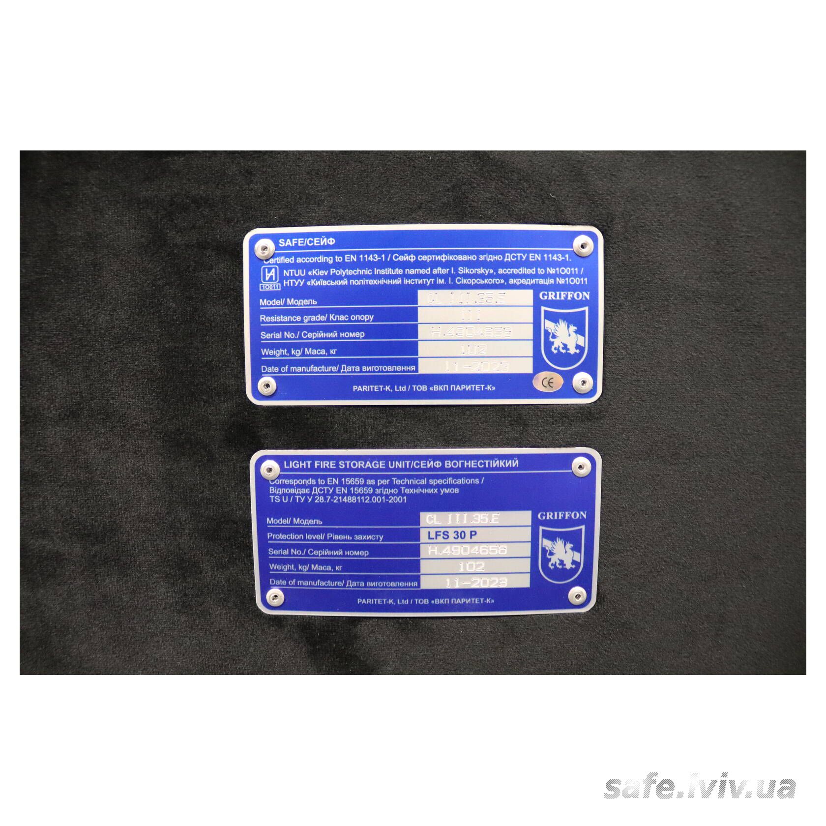 Griffon CL.III.35.E Black Gold це сертифікований за третім класом опору до зламу сейф, призначений для зберігання грошей, коштовностей і документів у банках, офісах та приватних будинках. Зламостійкість забезпечується конструкцією корпусу 40 мм (сталь - зламостійкий бетон - сталь), дверей 104 мм (сталь - зламостійкий бетон - сталь), ригельною системою тристороння, 6 ригелів Ø 25 мм та замком (електронний Easthouse (Китай) VdS Class 2 (B)). Рекомендовані ліміти зберігання - до 8 000 мінімальних зарплат для особистого користування та до 4 000 для комерційного.