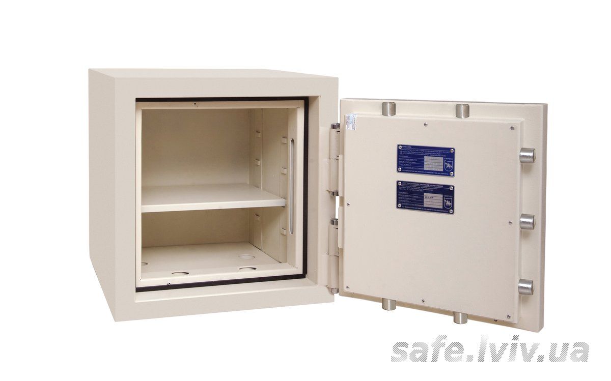 - Конструкція: корпус 40 мм (сталь - зламостійкий бетон - сталь), двері 104 мм (сталь - зламостійкий бетон - сталь); ригельна система тристороння, 7 ригелів Ø 25 мм.