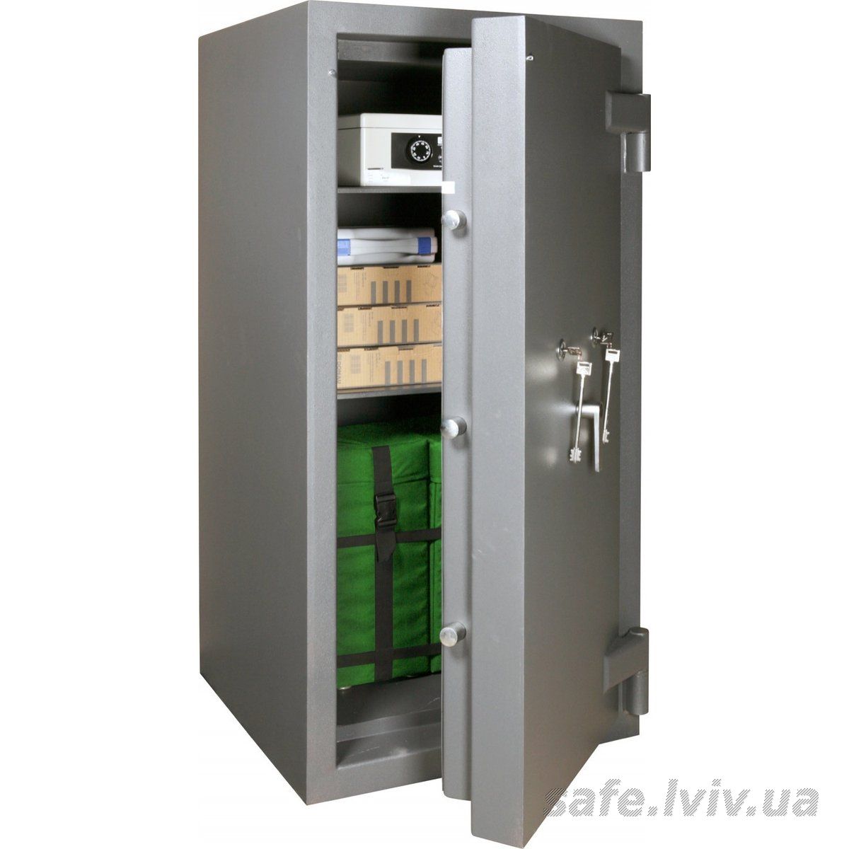 - Конструкція: корпус 100 мм (сталь - зламостійкий бетон - сталь), двері 100 мм (сталь - зламостійкий бетон - сталь); ригельна система тристороння, 5 ригелів Ø 25 мм.