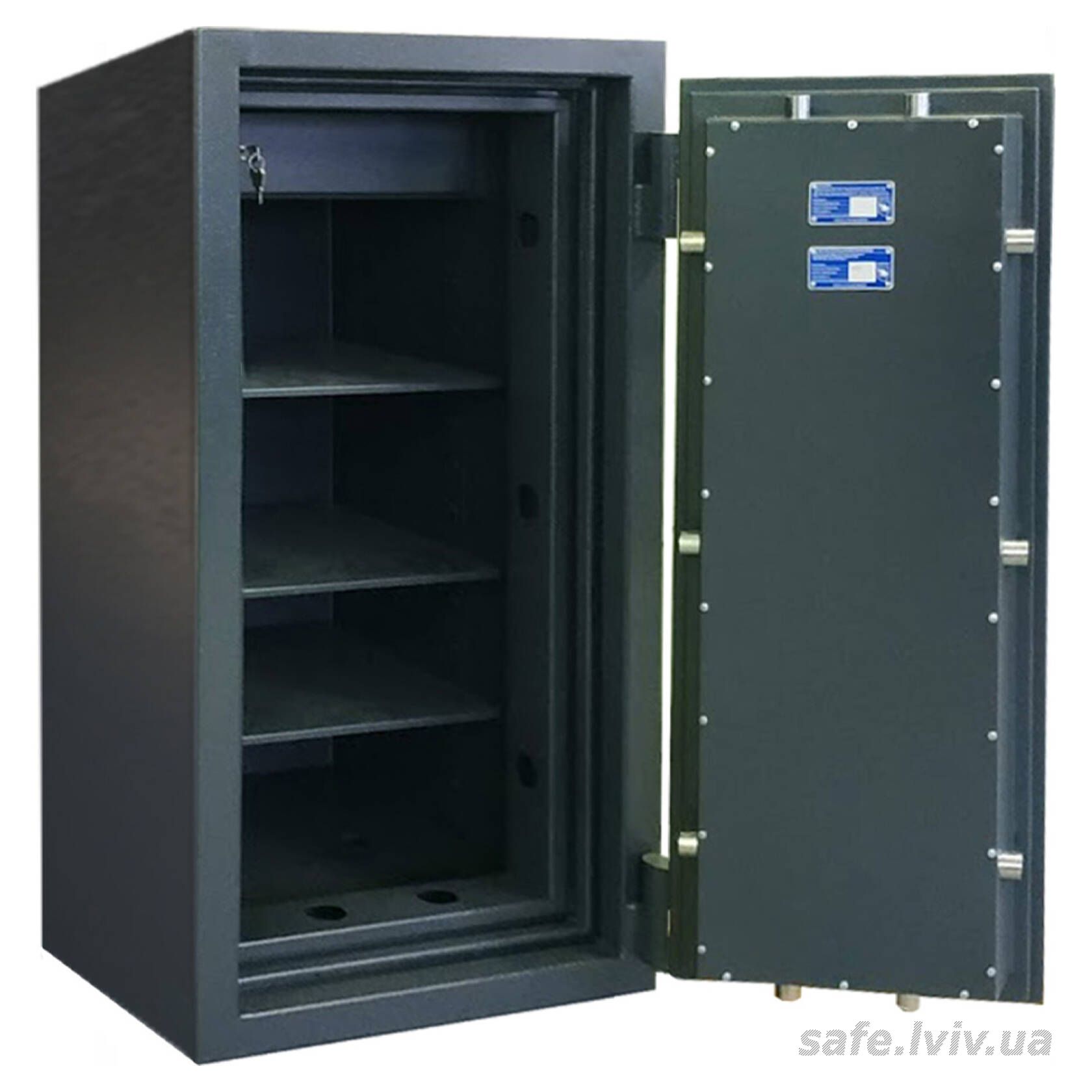 - Конструкція: корпус 80 мм (сталь - зламостійкий бетон - сталь), двері 80 мм (сталь - зламостійкий бетон - сталь); ригельна система чотиристороння, 10 ригелів Ø 25 мм.