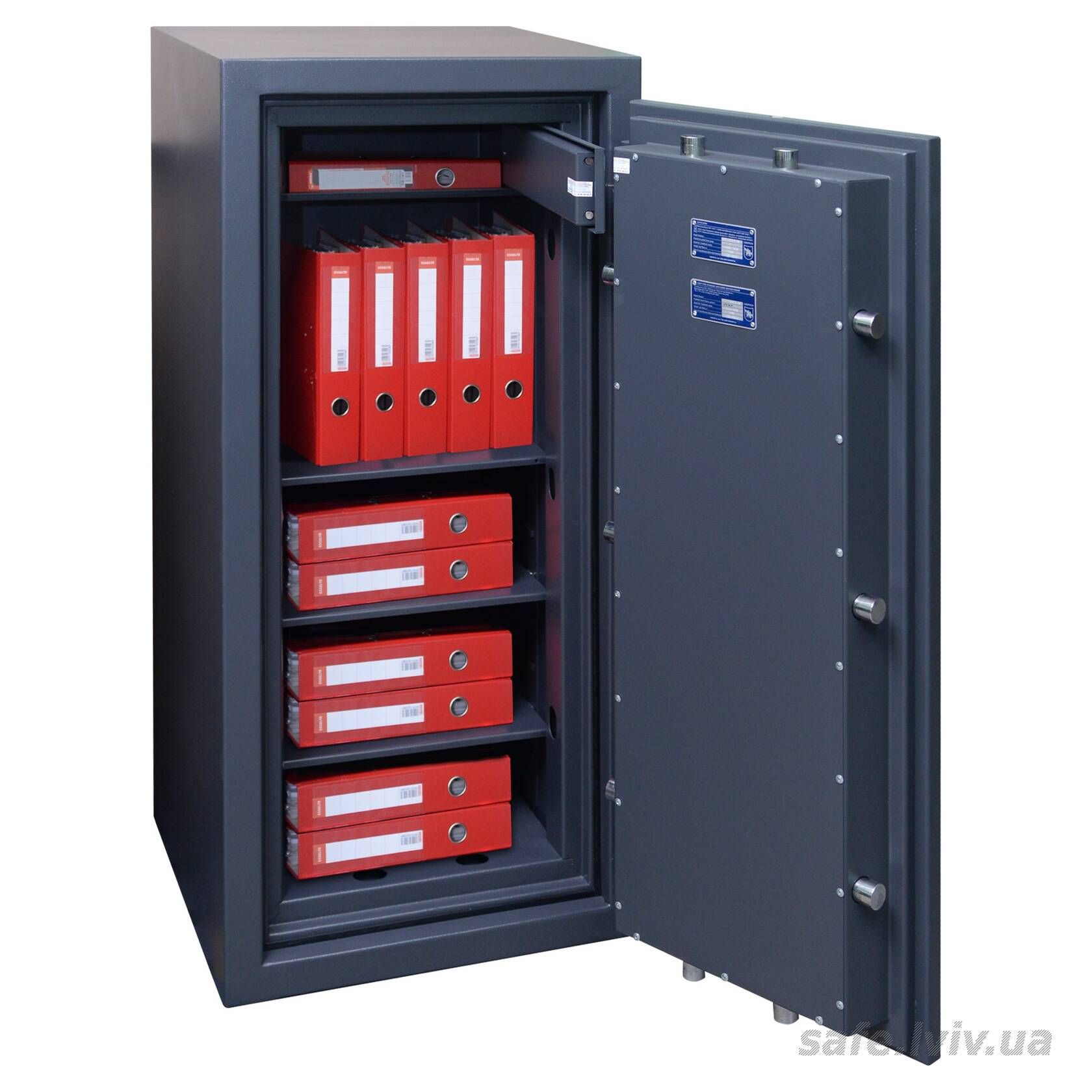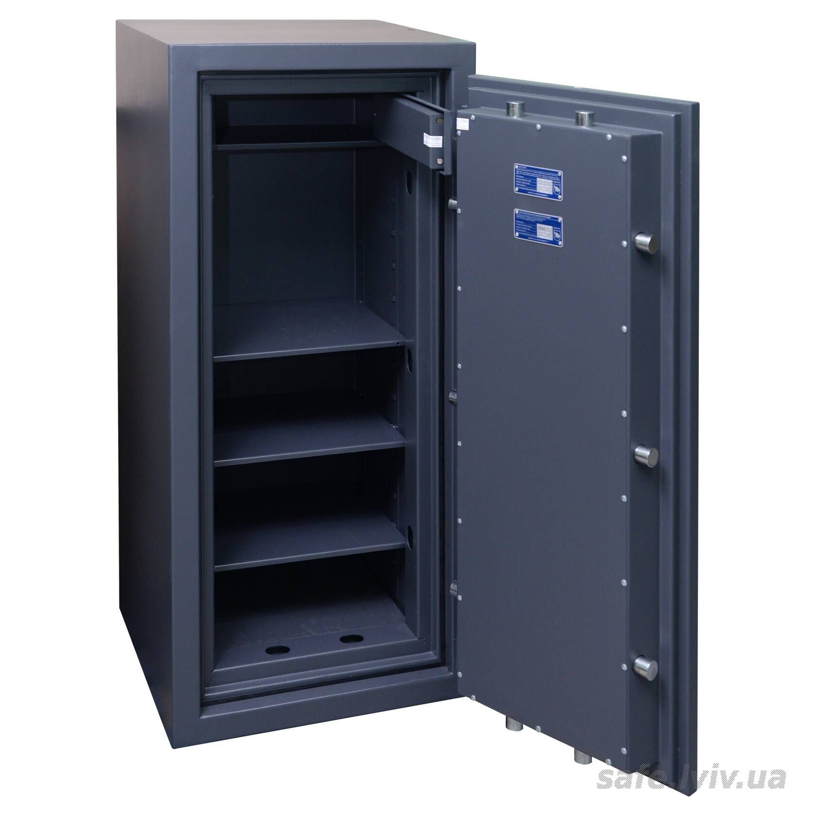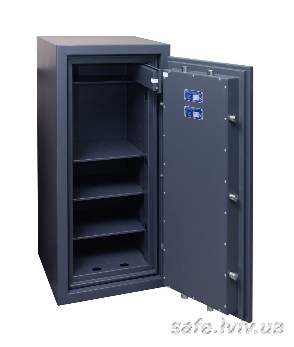 - Конструкція: корпус 80 мм (сталь - зламостійкий бетон - сталь), двері 80 мм (сталь - зламостійкий бетон - сталь); ригельна система чотиристороння, 10 ригелів Ø 25 мм.