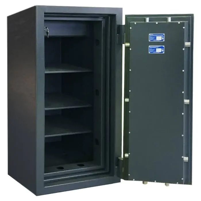- Конструкція: корпус 100 мм (сталь - зламостійкий бетон - сталь), двері 100 мм (сталь - зламостійкий бетон - сталь); ригельна система тристороння, 5 ригелів Ø 25 мм.