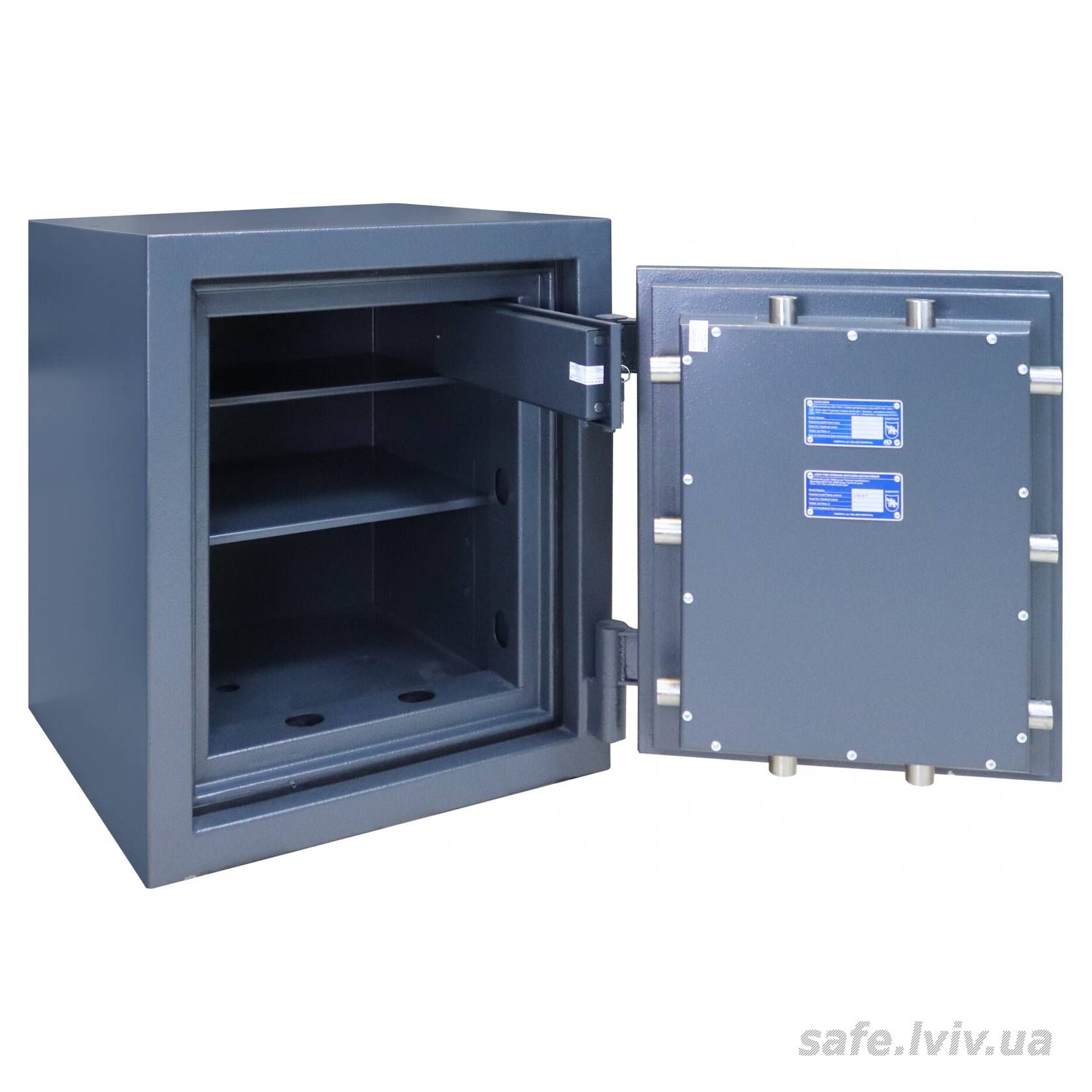 - Конструкція: корпус 80 мм (сталь - зламостійкий бетон - сталь), двері 80 мм (сталь - зламостійкий бетон - сталь); ригельна система чотиристороння, 10 ригелів Ø 25 мм.