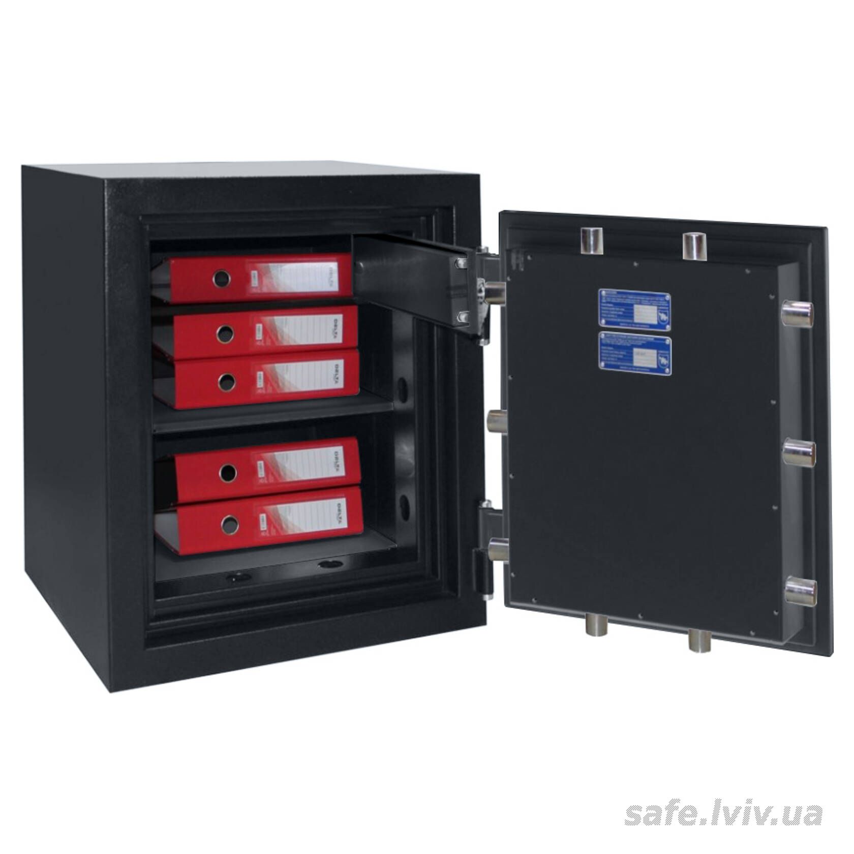 - Конструкція: корпус 80 мм (сталь - зламостійкий бетон - сталь), двері 80 мм (сталь - зламостійкий бетон - сталь); ригельна система чотиристороння, 10 ригелів Ø 25 мм.