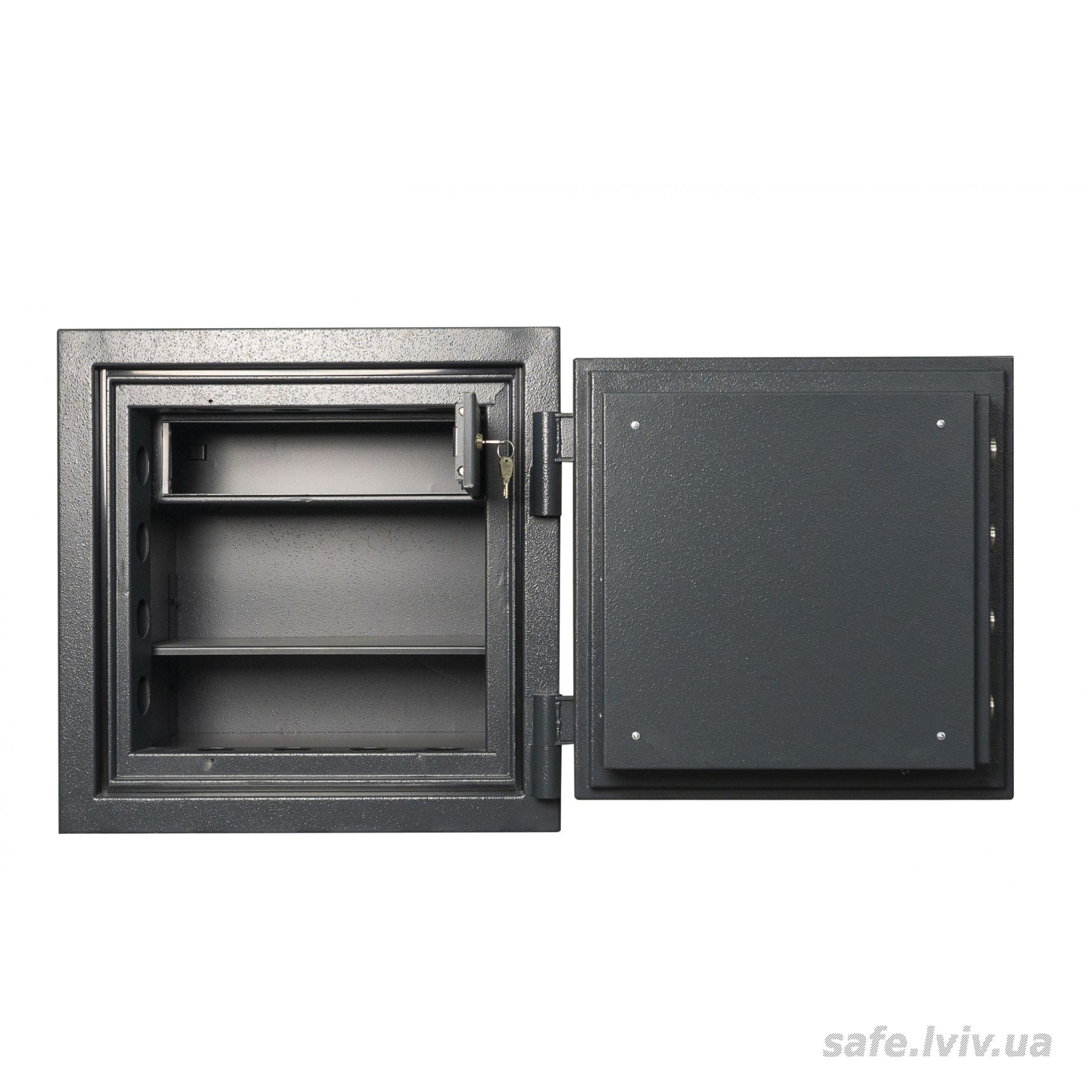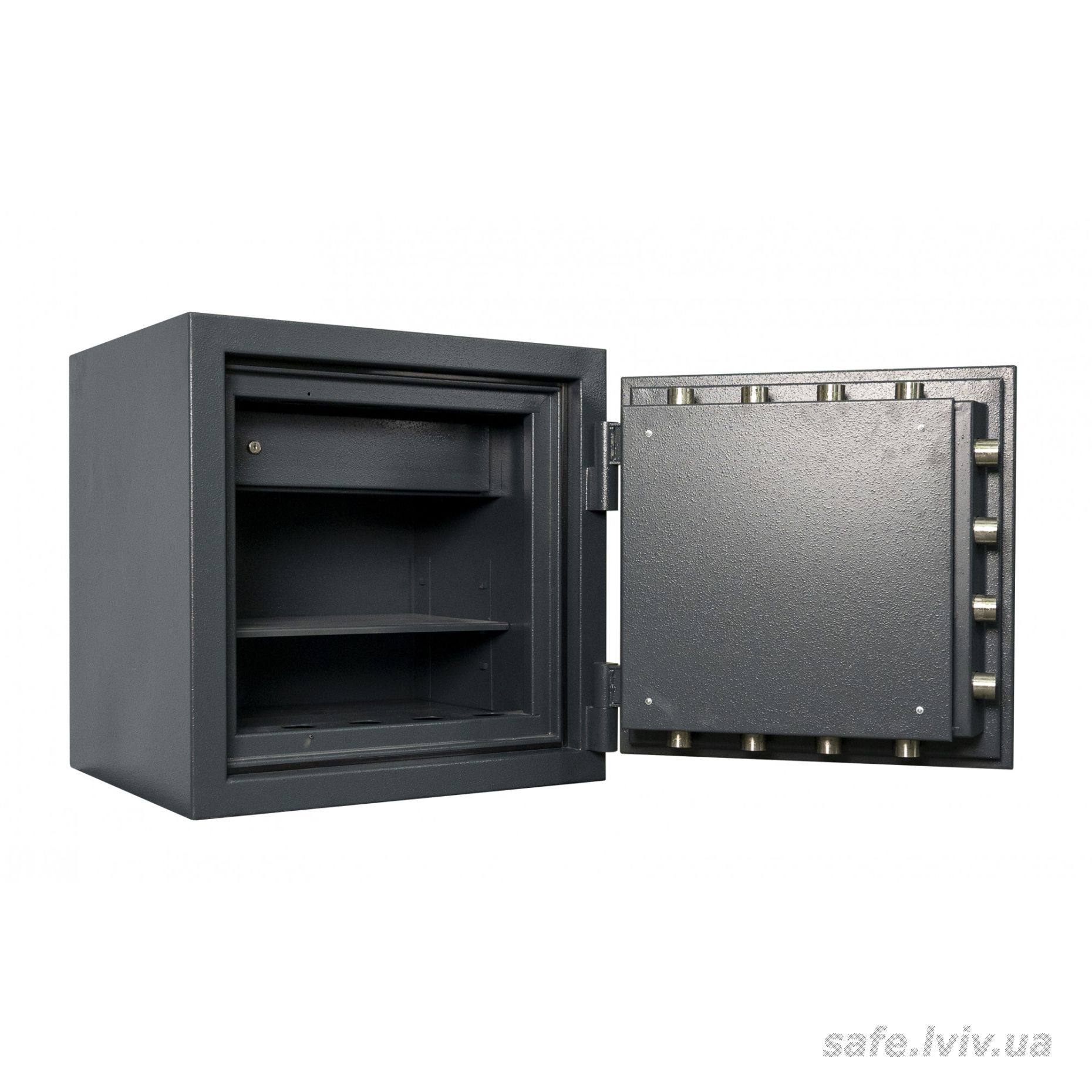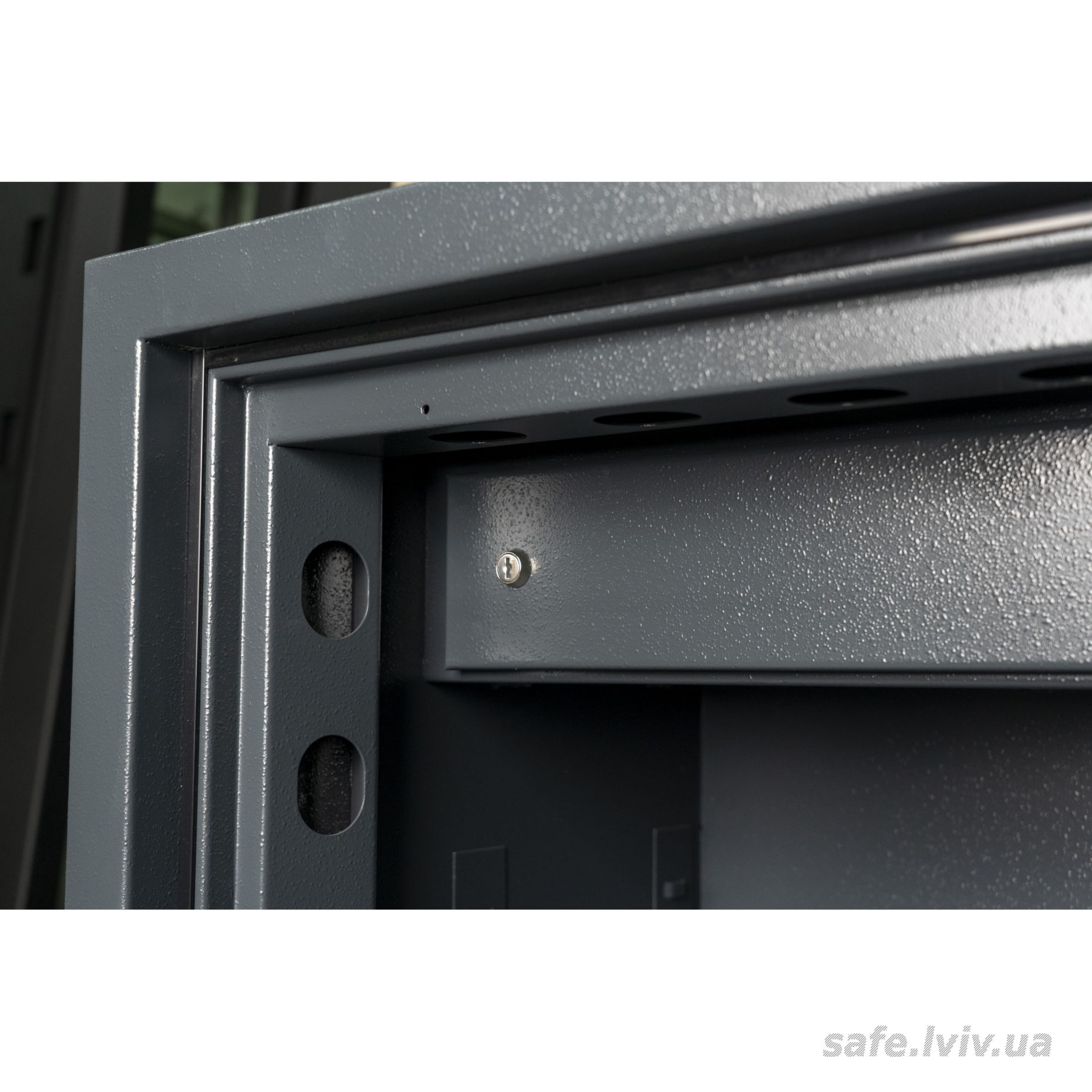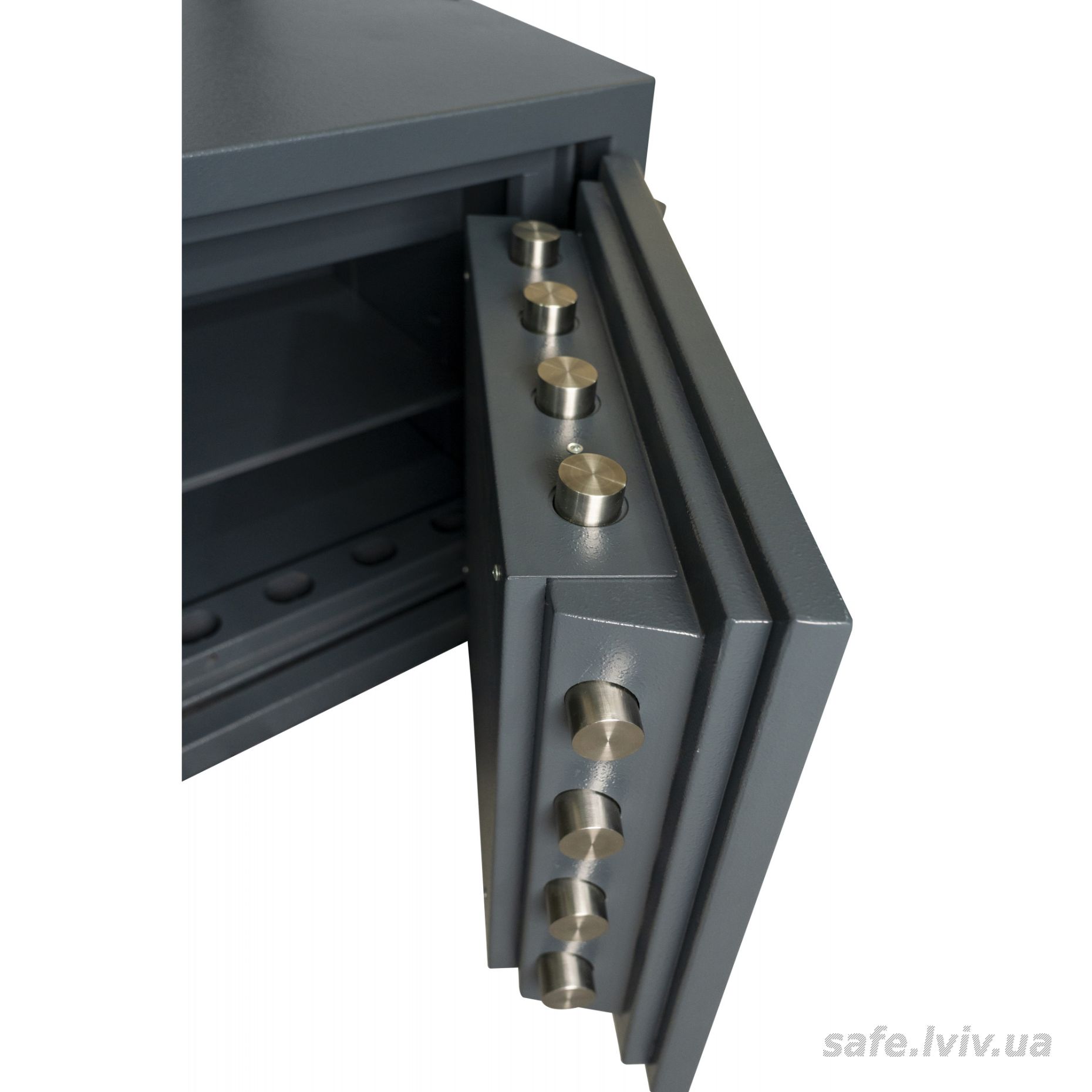 - Конструкція: корпус 80 мм (сталь - зламостійкий бетон - сталь), двері 80 мм (сталь - зламостійкий бетон - сталь); ригельна система тристороння, 12 ригелів Ø 40 мм.