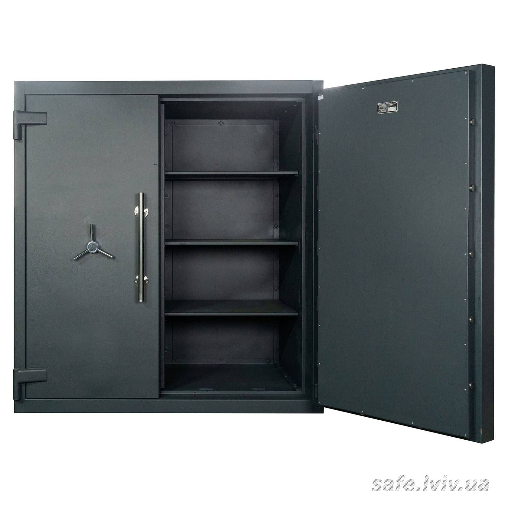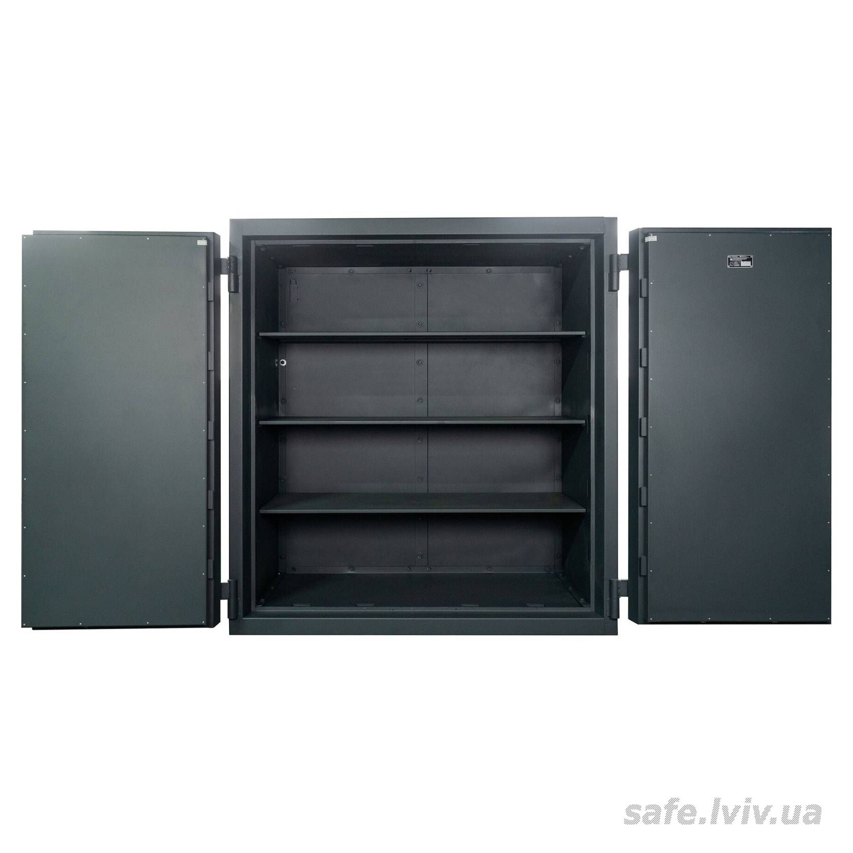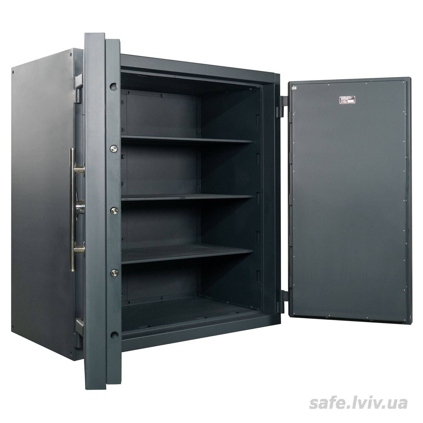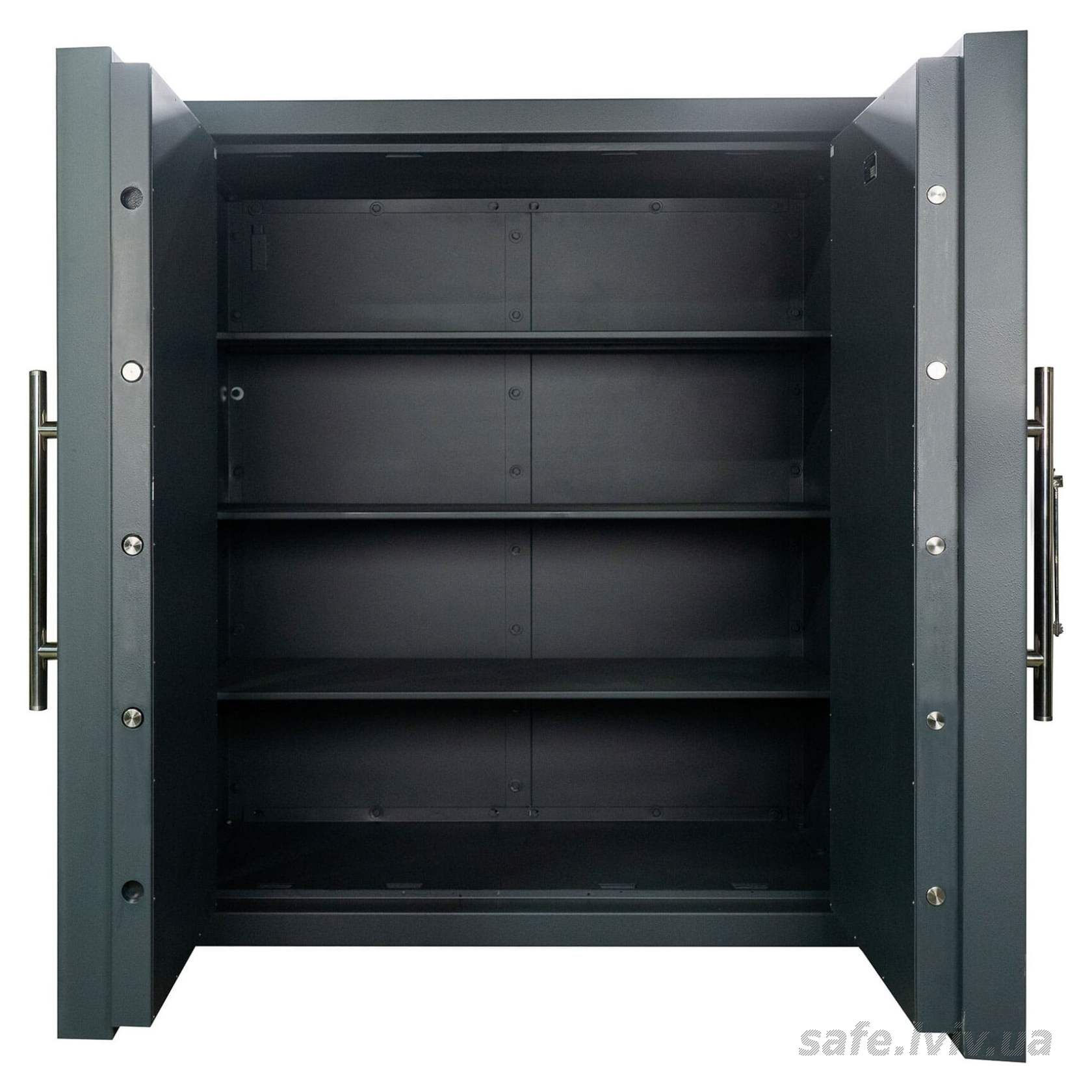- Конструкція: корпус 100 мм (сталь - зламостійкий бетон - сталь), двері 175 мм (сталь - зламостійкий бетон - сталь); ригельна система тристороння.