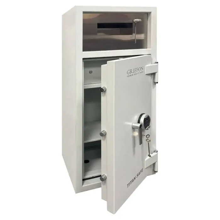 Griffon CLD.II.120.K.E це сертифікований депозитний сейф клас II за EN 1143-1, призначений для безпечного приймання та зберігання готівки без відкривання основного відділення. Приймальний блок дозволяє швидко внести гроші або документи всередину сейфа, що мінімізує ризик пограбування та підходить для банків, обмінних пунктів, магазинів, готелів, АЗС та інших підприємств із великим обігом готівки. Зламостійкість забезпечує конструкція корпусу 40 мм (сталь - зламостійкий бетон - сталь), дверей 104 мм (сталь - зламостійкий бетон - сталь), ригельна система тристороння, 5 ригелів Ø 25 мм та замок - електронний SMARTLOCK (Італія) VdS Class 1 (A), ключовий WITTKOPP (Німеччина) VDS 1 (A).