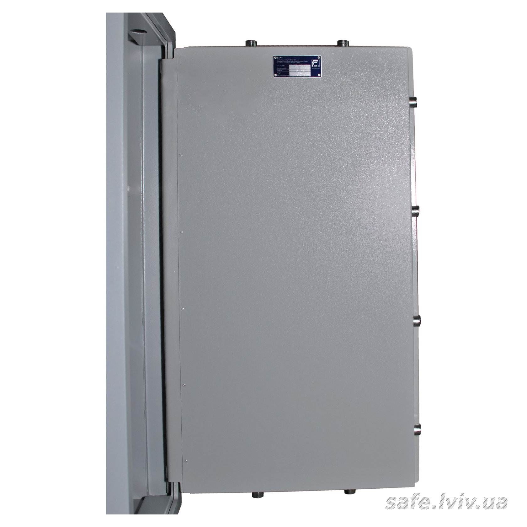 - Конструкція: корпус 25 мм (сталь - зламостійкий бетон - сталь) 25 мм, двері 10 мм (сталь) 10 мм; ригельна система тристороння, 8 ригелів Ø 25 мм.