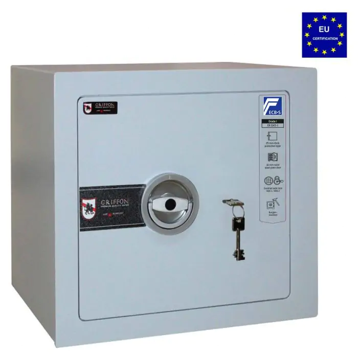 Griffon CLE.I.40.K це сертифікований сейф клас I за EN 1143-1 з європейською сертифікацією ECB-S (Німеччина), призначений для надійного зберігання грошей, документів і коштовностей у домі та офісі. Зламостійкість забезпечує конструкція корпусу 25 мм (сталь - зламостійкий бетон - сталь) загальною товщиною 25 мм, дверей 10 мм (сталь) 10 мм, ригельна система тристороння, 8 ригелів Ø 25 мм з антизрізами та замок - ключовий STUV (Німеччина) VdS Class 1 (A). Рекомендовані ліміти зберігання - до 2000 мінімальних зарплат для особистого користування та до 1000 для комерційного.