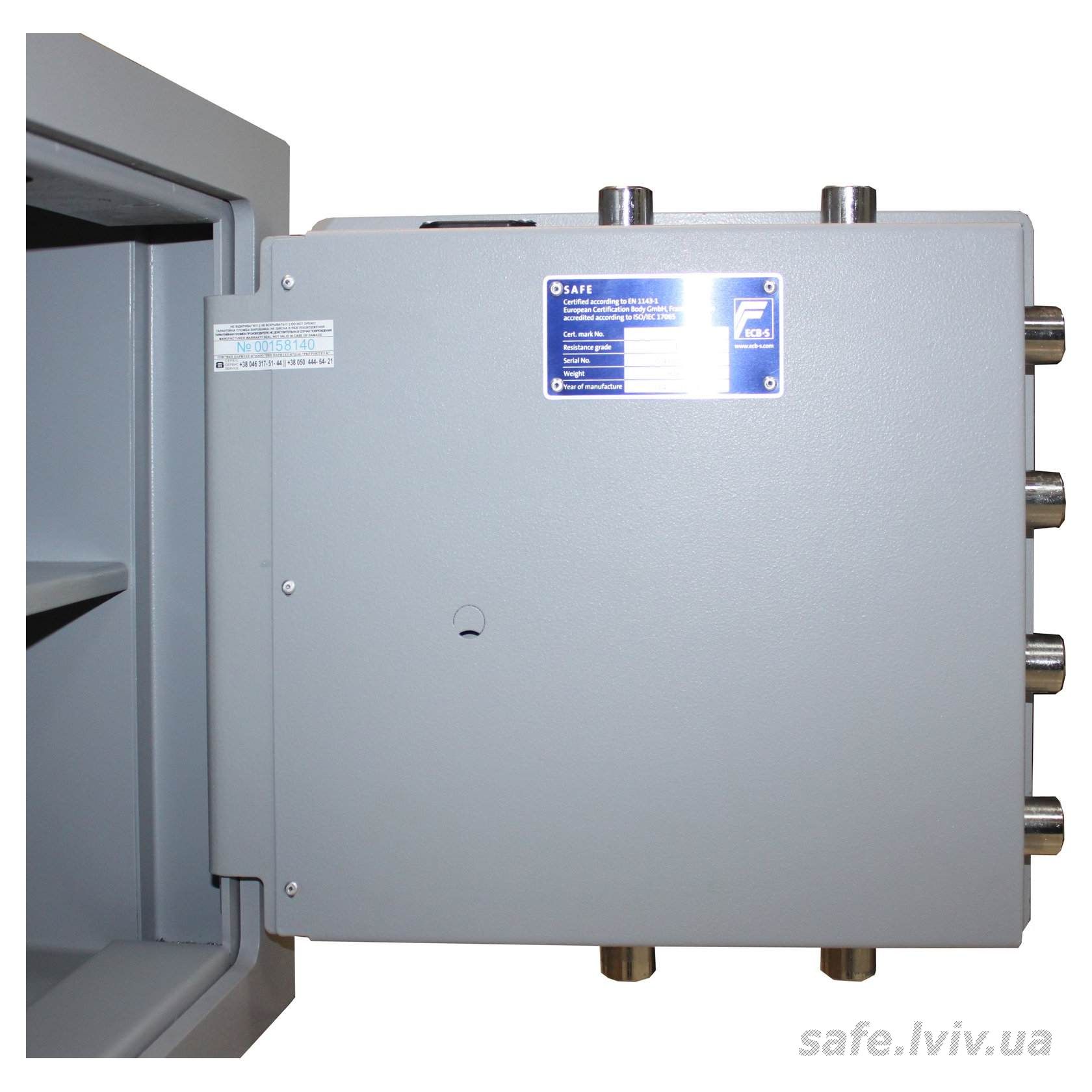 - Конструкція: корпус 25 мм (сталь - зламостійкий бетон - сталь) 25 мм, двері 10 мм (сталь) 10 мм; ригельна система тристороння, 8 ригелів Ø 25 мм.