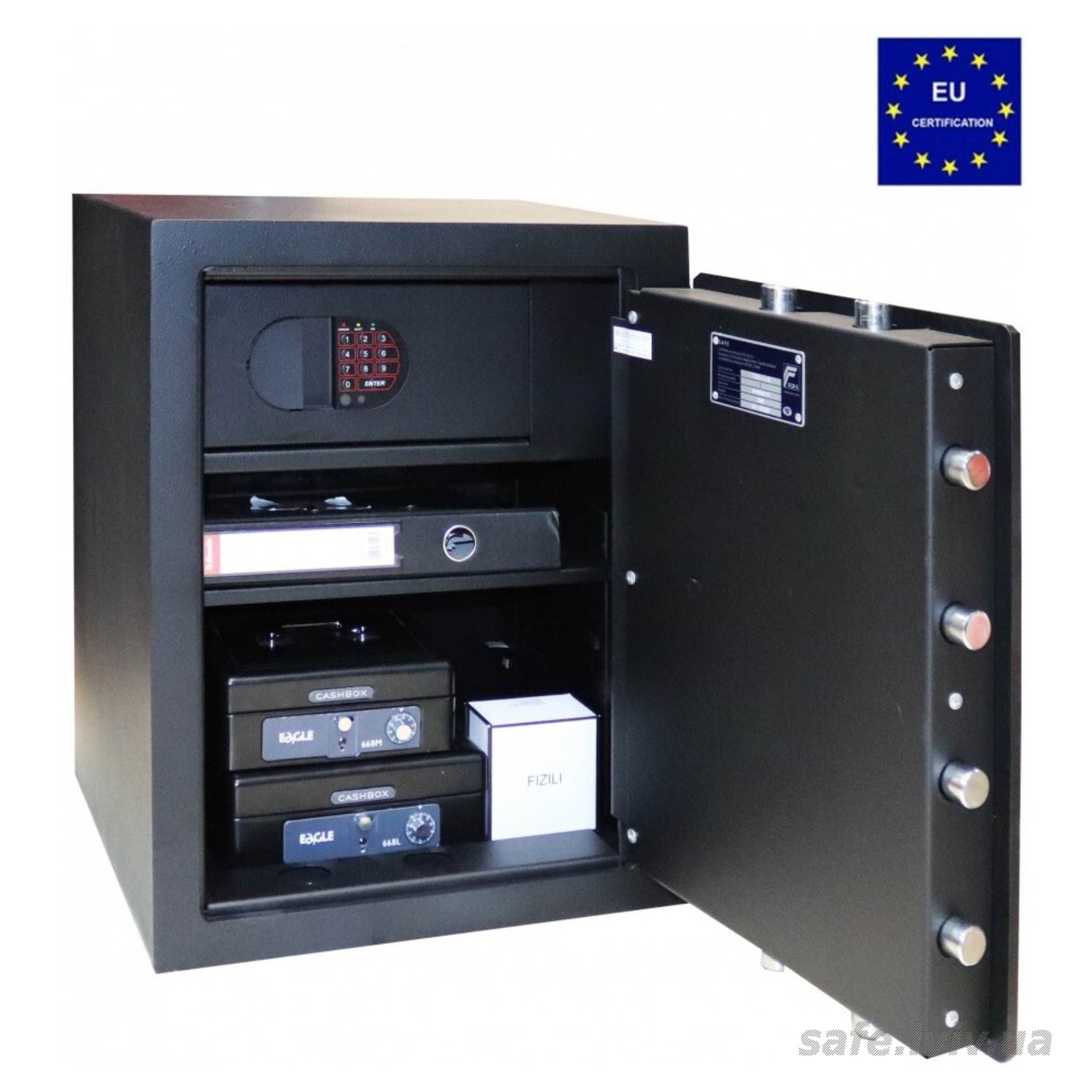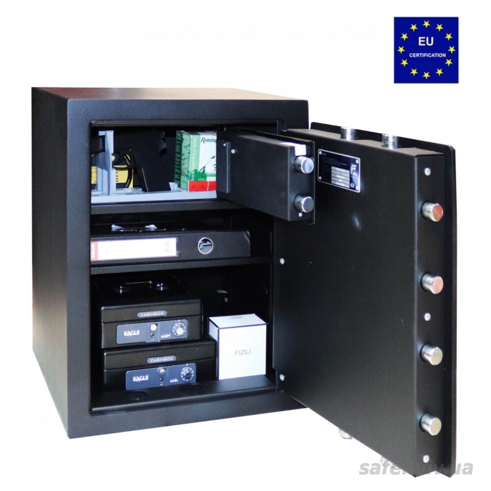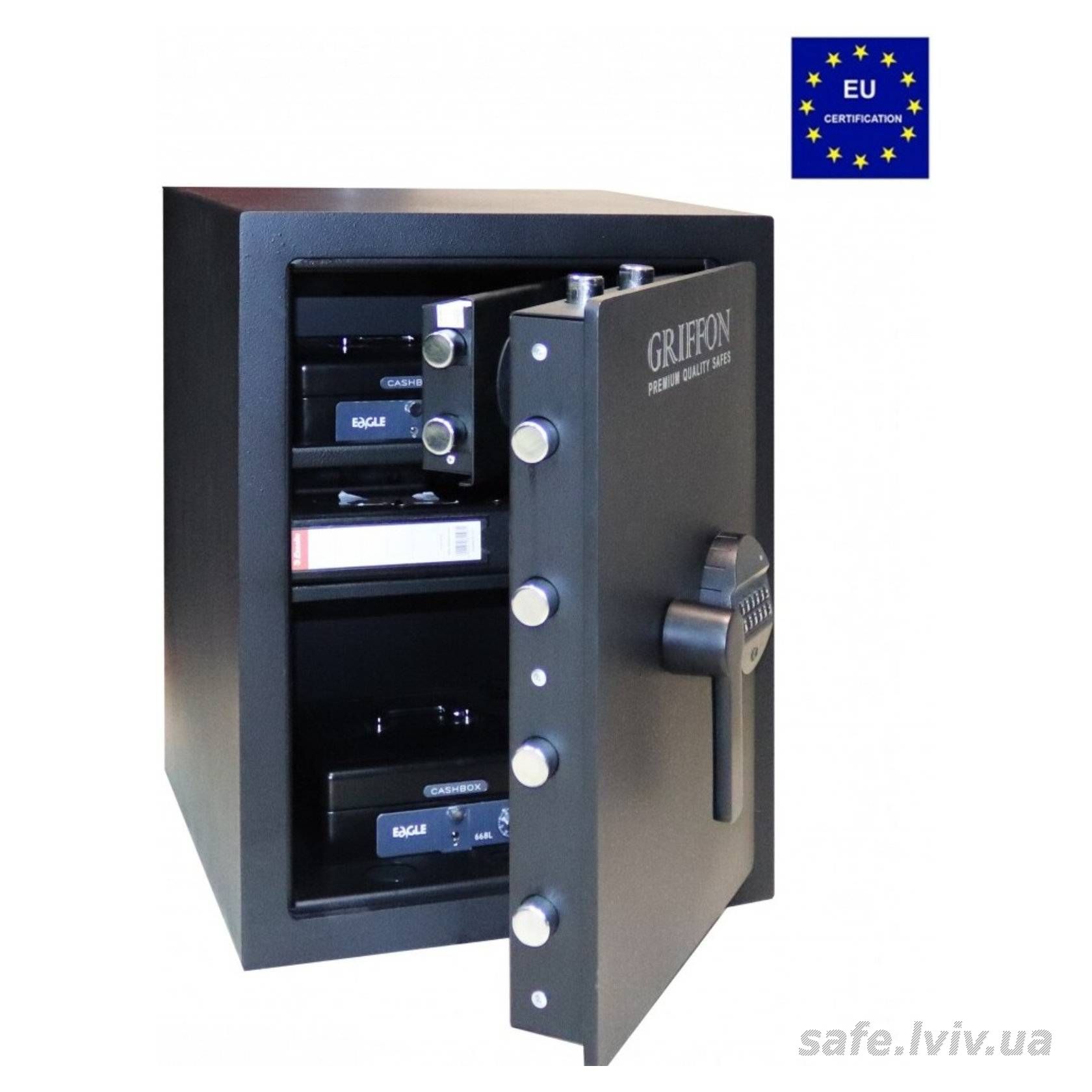 Griffon CLE.I.55.E.T Black це сертифікований сейф клас I за EN 1143-1 з європейською сертифікацією ECB-S (Німеччина), призначений для надійного зберігання грошей, документів і коштовностей у домі та офісі. Зламостійкість забезпечує конструкція корпусу 25 мм (сталь - зламостійкий бетон - сталь) загальною товщиною 25 мм, дверей 10 мм (сталь) 10 мм, ригельна система тристороння, 8 ригелів Ø 25 мм з антизрізами та замок - електронний M-LOCKS (Нідерланди) VdS Class 2 (B). Рекомендовані ліміти зберігання - до 2000 мінімальних зарплат для особистого користування та до 1000 для комерційного.