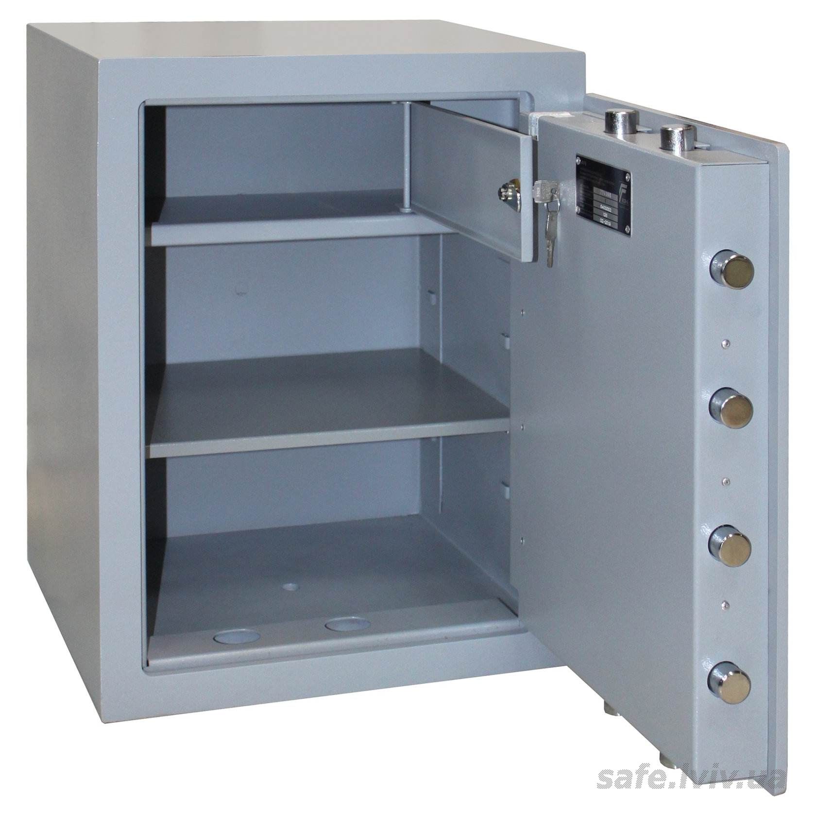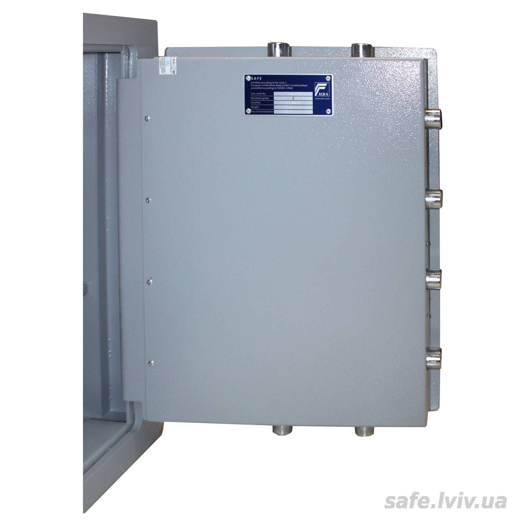 - Конструкція: корпус 25 мм (сталь - зламостійкий бетон - сталь) 25 мм, двері 10 мм (сталь) 10 мм; ригельна система тристороння, 8 ригелів Ø 25 мм.