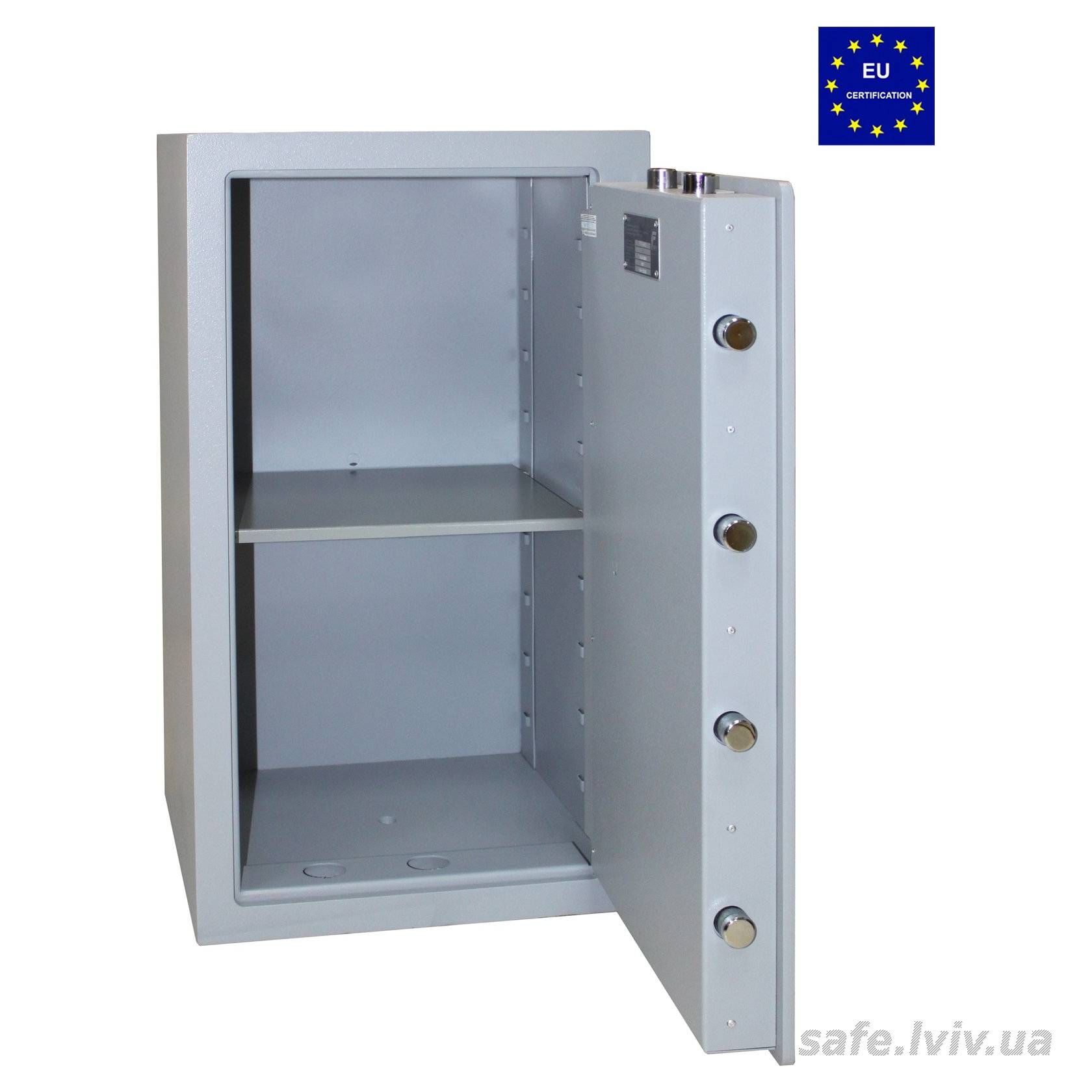 - Конструкція: корпус 25 мм (сталь - зламостійкий бетон - сталь) 25 мм, двері 10 мм (сталь) 10 мм; ригельна система тристороння, 8 ригелів Ø 25 мм.