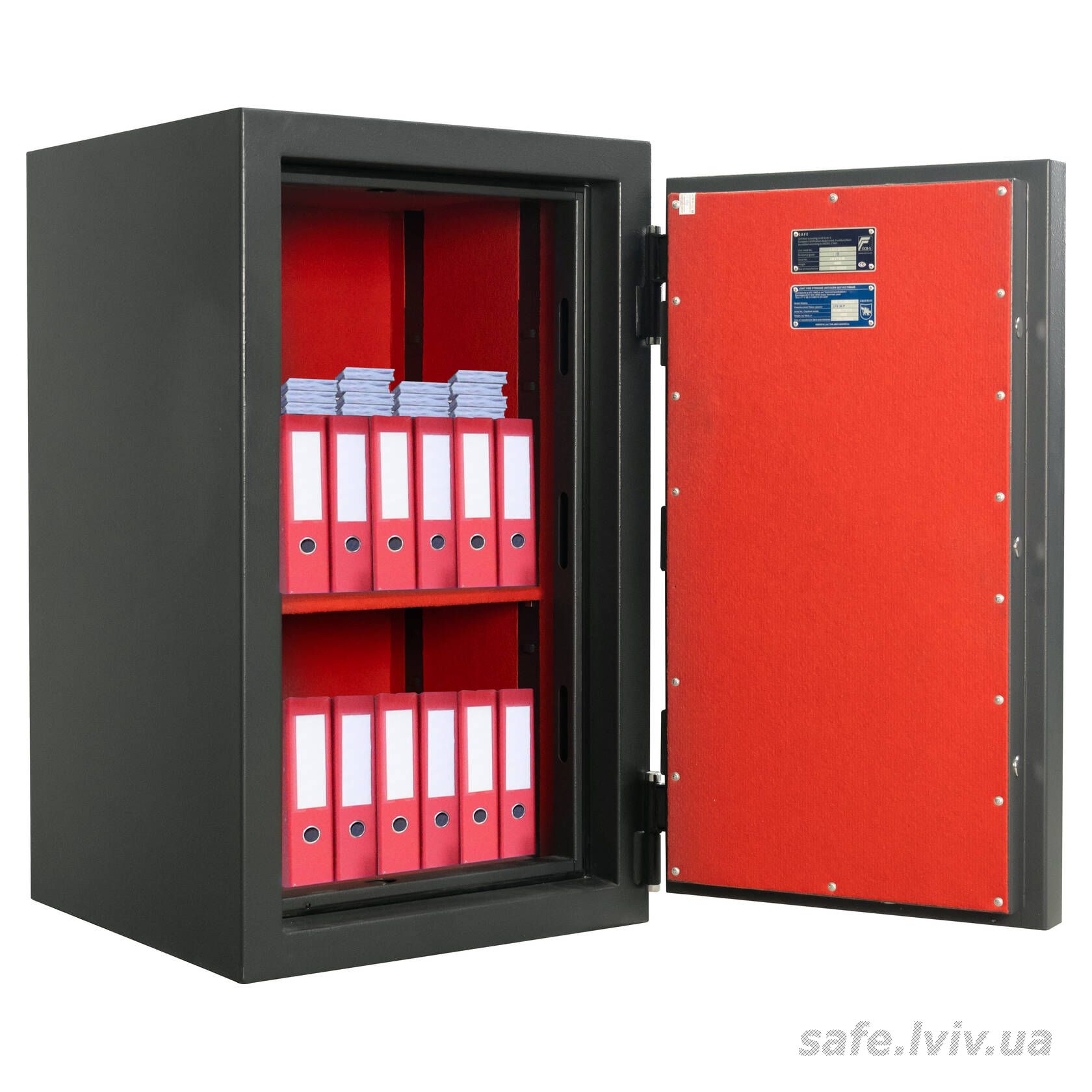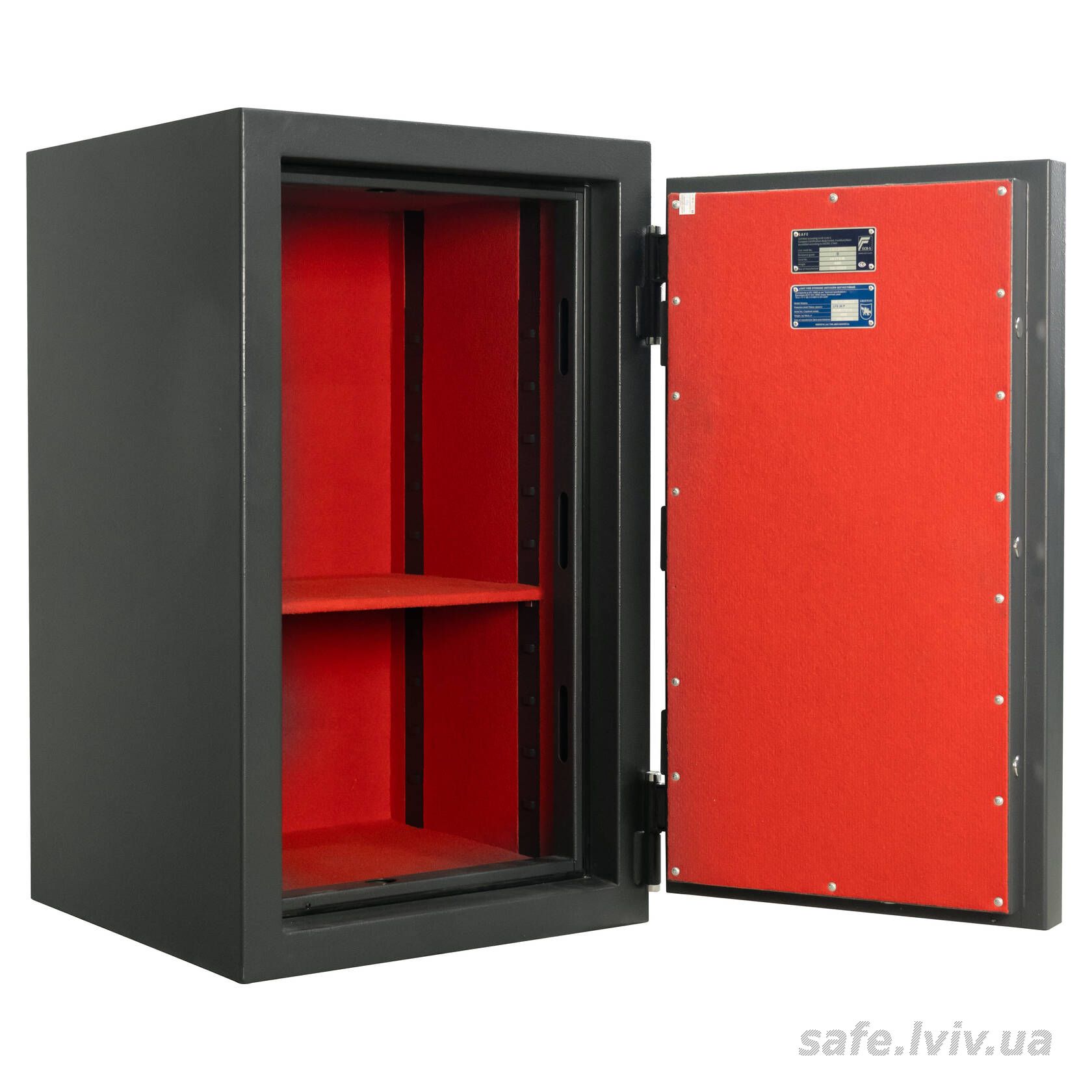 - Комплектація: внутрішнє оздоблення, 2 полиці; отвори для анкерування до підлоги.