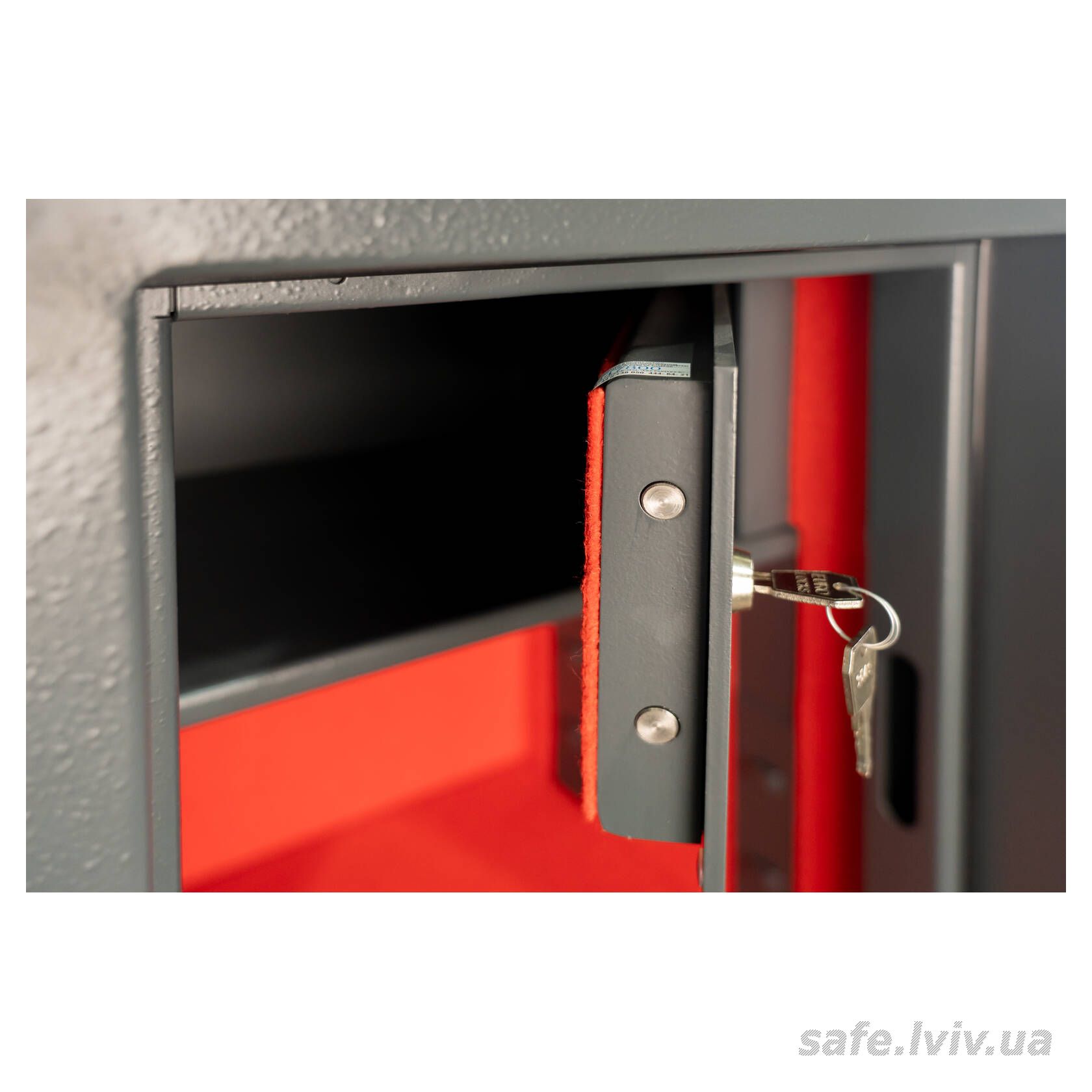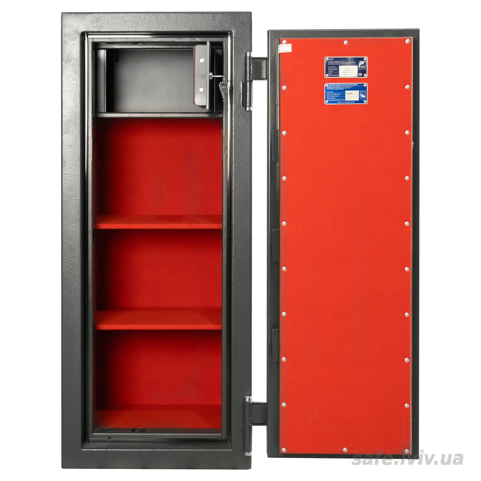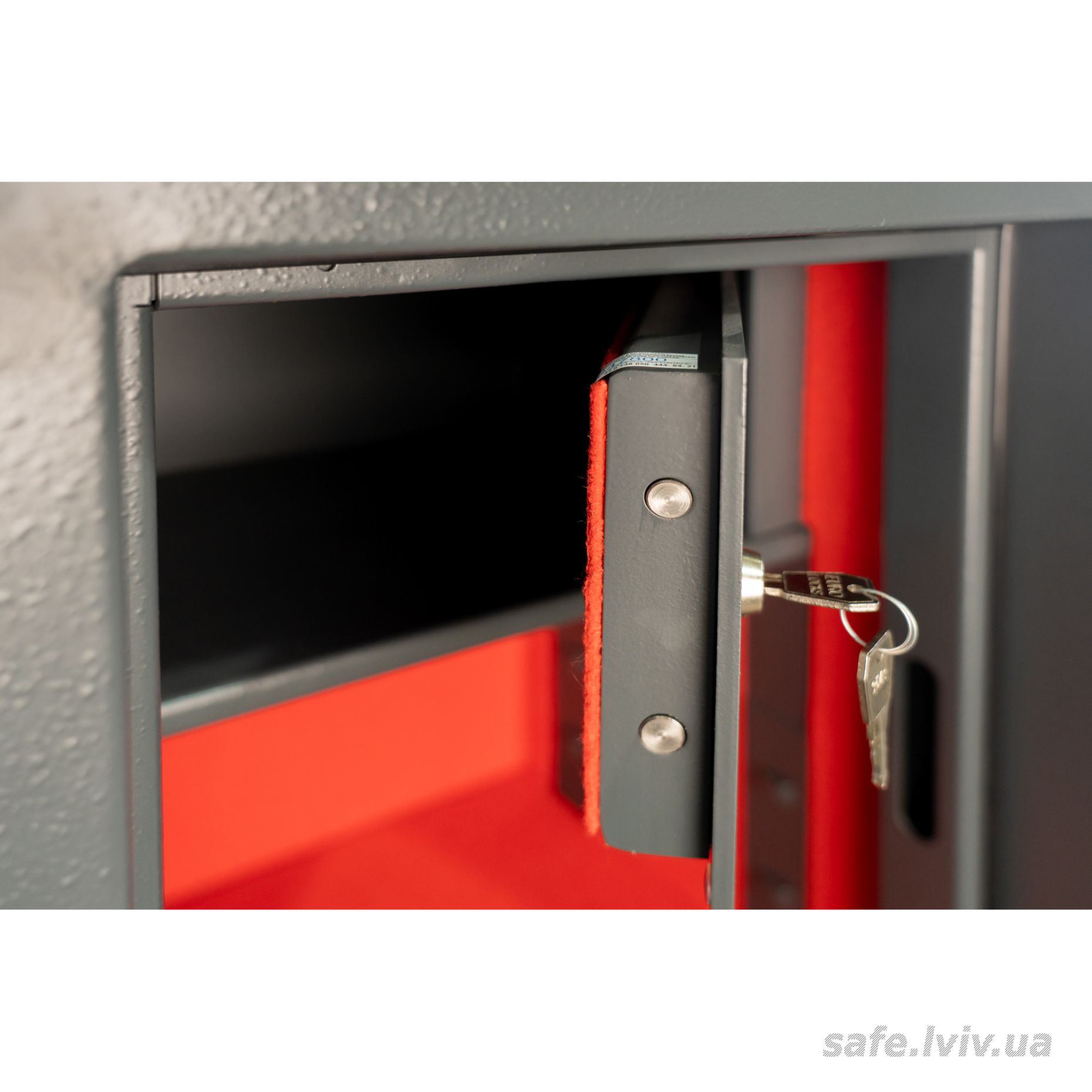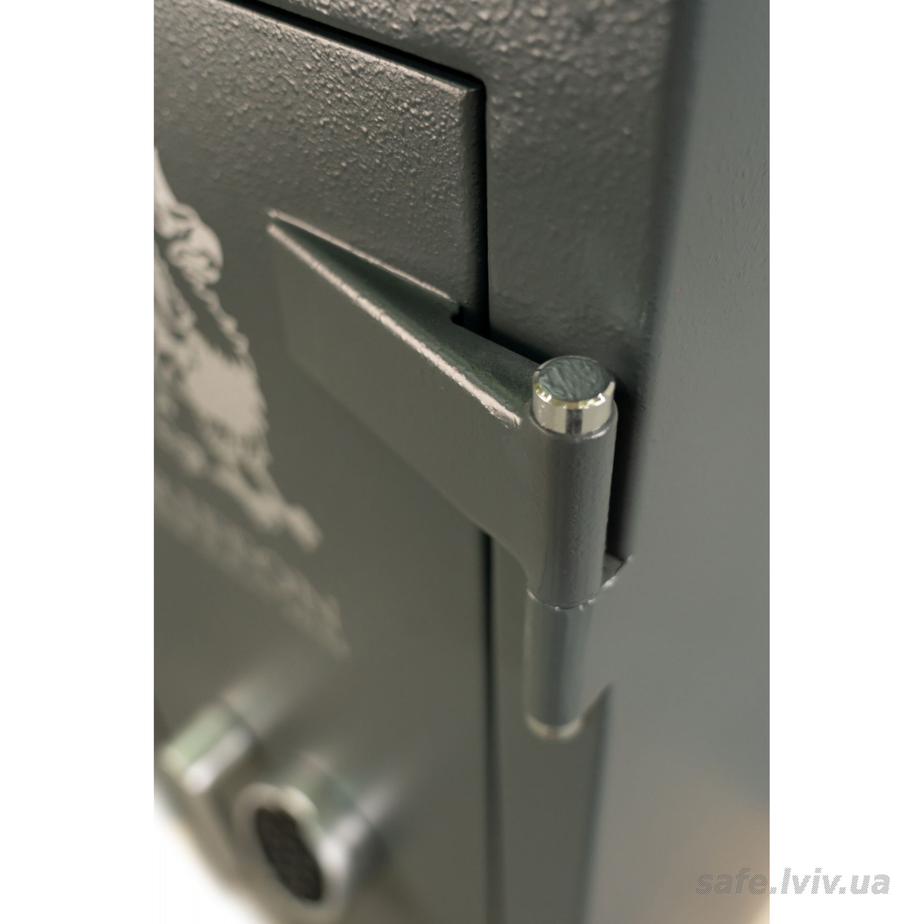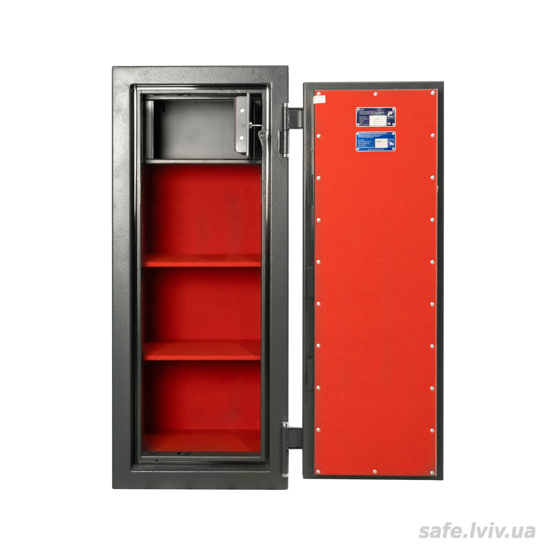 - Конструкція: корпус 55 мм (сталь - зламостійкий бетон - сталь), двері 10 мм (сталь); ригельна система тристороння, 5 ригелів Ø 25 мм.