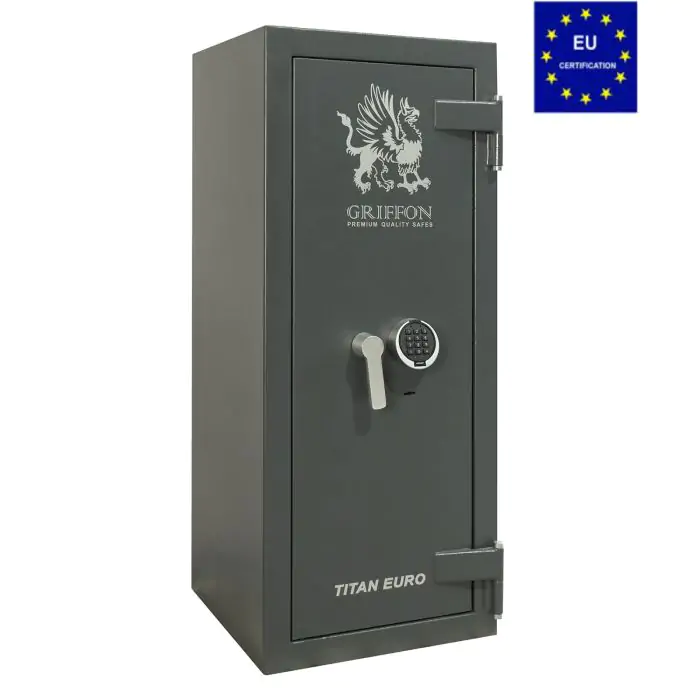 Griffon CLE.II.120.K.E WKP це сертифікований сейф клас II за EN 1143-1 та вогнестійкість LFS 30P за EN 15659, випробуваний в Німеччині Європейським органом сертифікації ECB-S. Призначений для надійного зберігання грошей, коштовностей і документів у банках, офісах та приватних будинках. Конструкція корпусу 55 мм (сталь - зламостійкий бетон - сталь), дверей 10 мм (сталь) та ригельна система тристороння, 5 ригелів Ø 25 мм поєднують захист від злому і пожежі. Замок - ключовий STUV (Німеччина) VdS Class 1 (A), електронний Carl Wittkopp (Німеччина) VdS Class 2 (B). Рекомендовані ліміти зберігання - до 4 000 мінімальних зарплат для особистого користування та до 2 000 для комерційного.