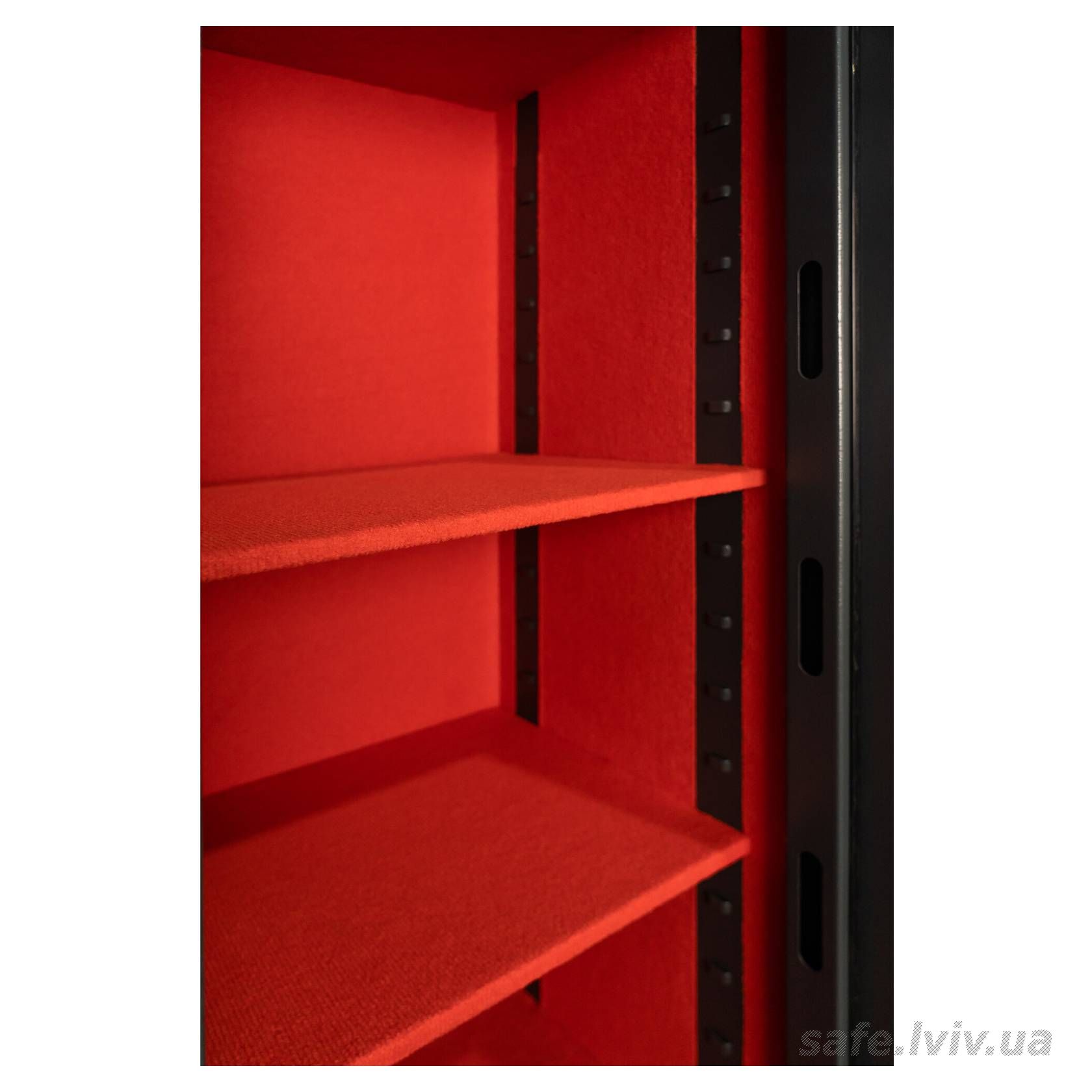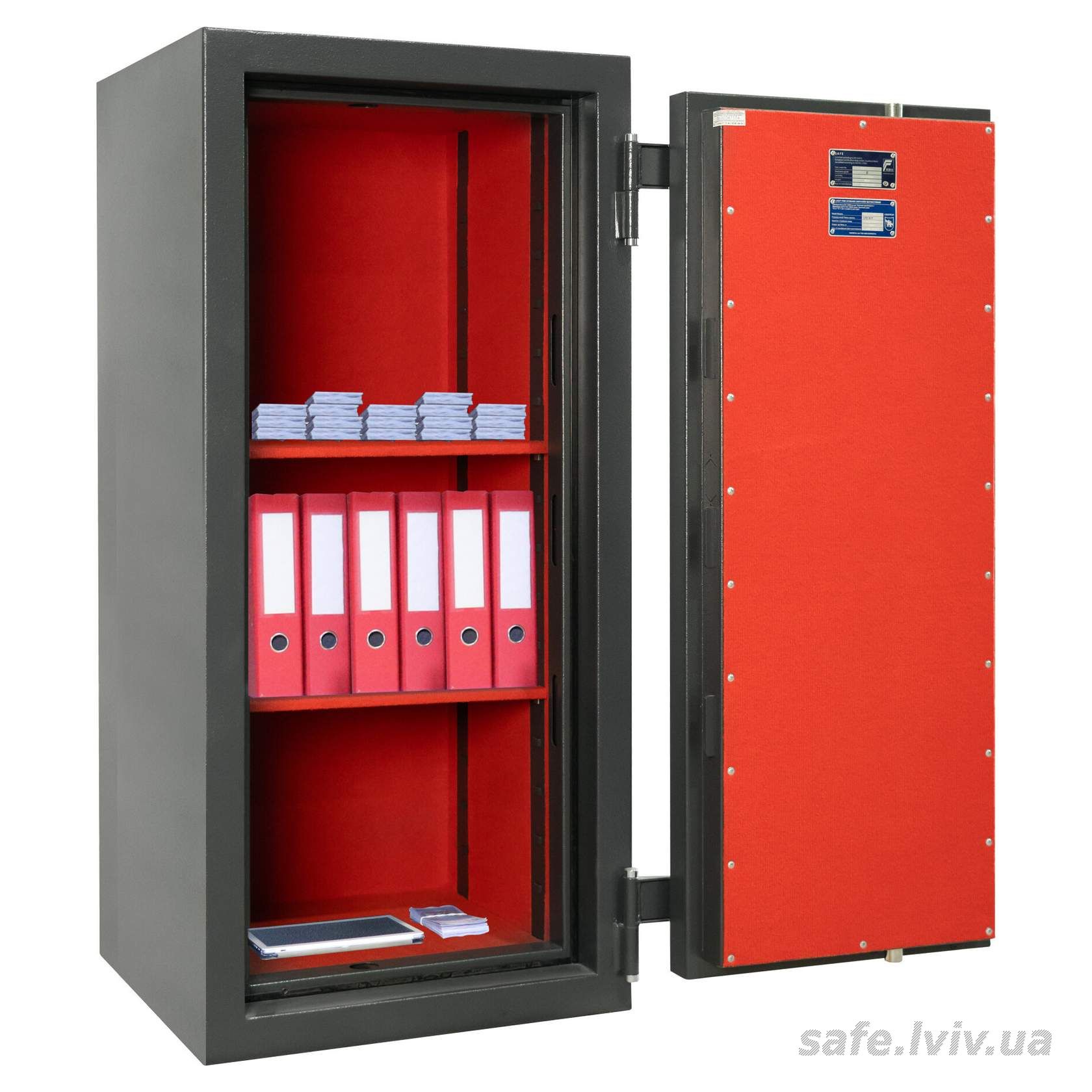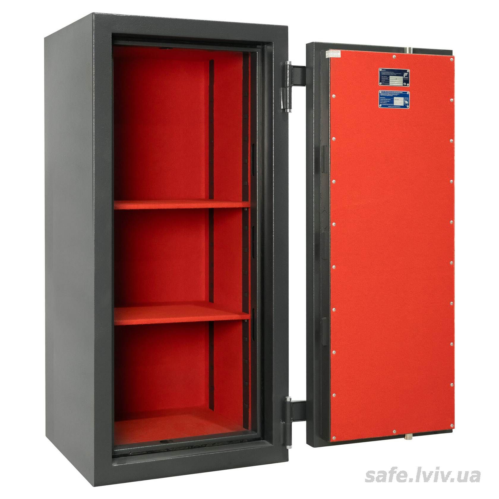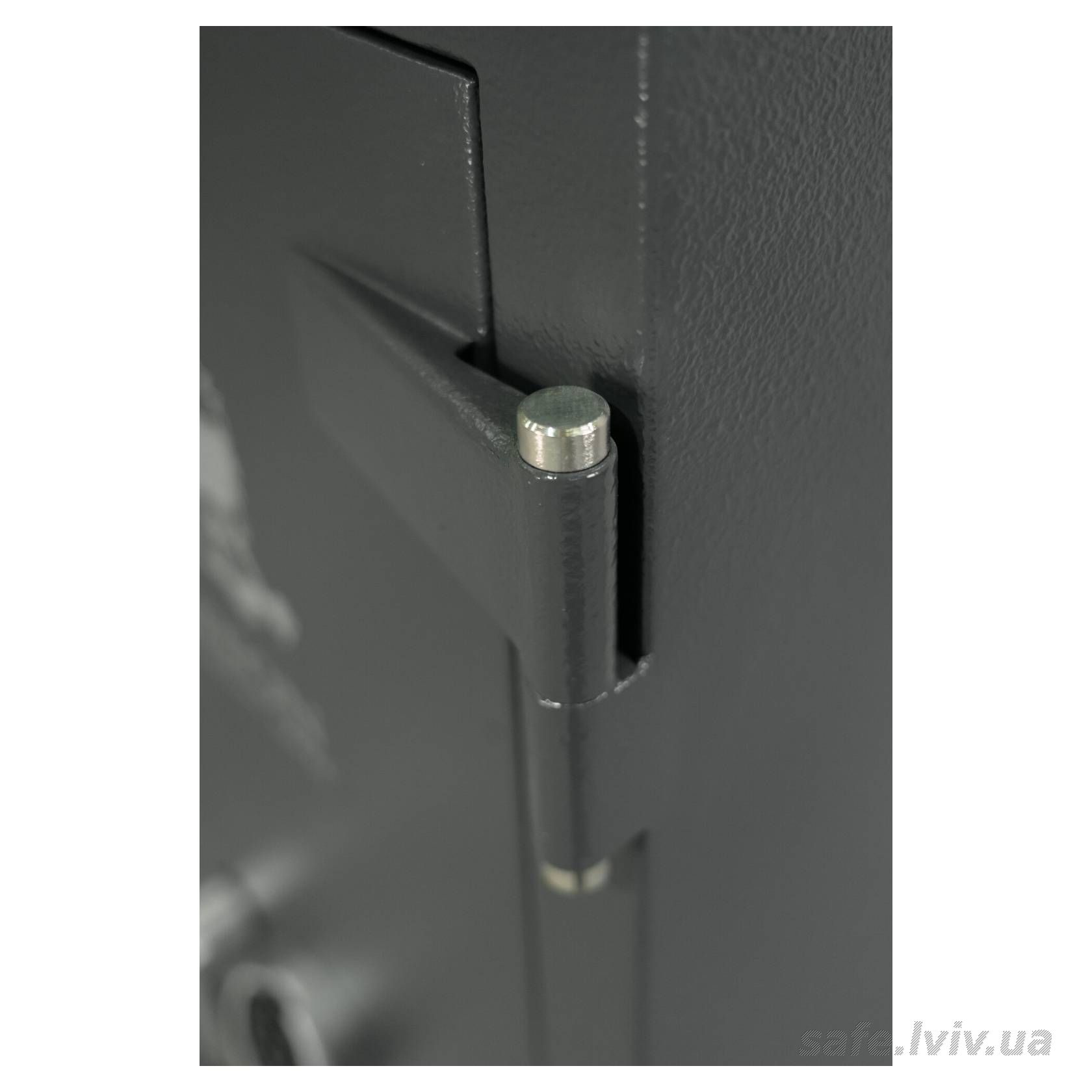 - Конструкція: корпус 55 мм (сталь - зламостійкий бетон - сталь), двері 10 мм (сталь); ригельна система тристороння, 5 ригелів Ø 25 мм.