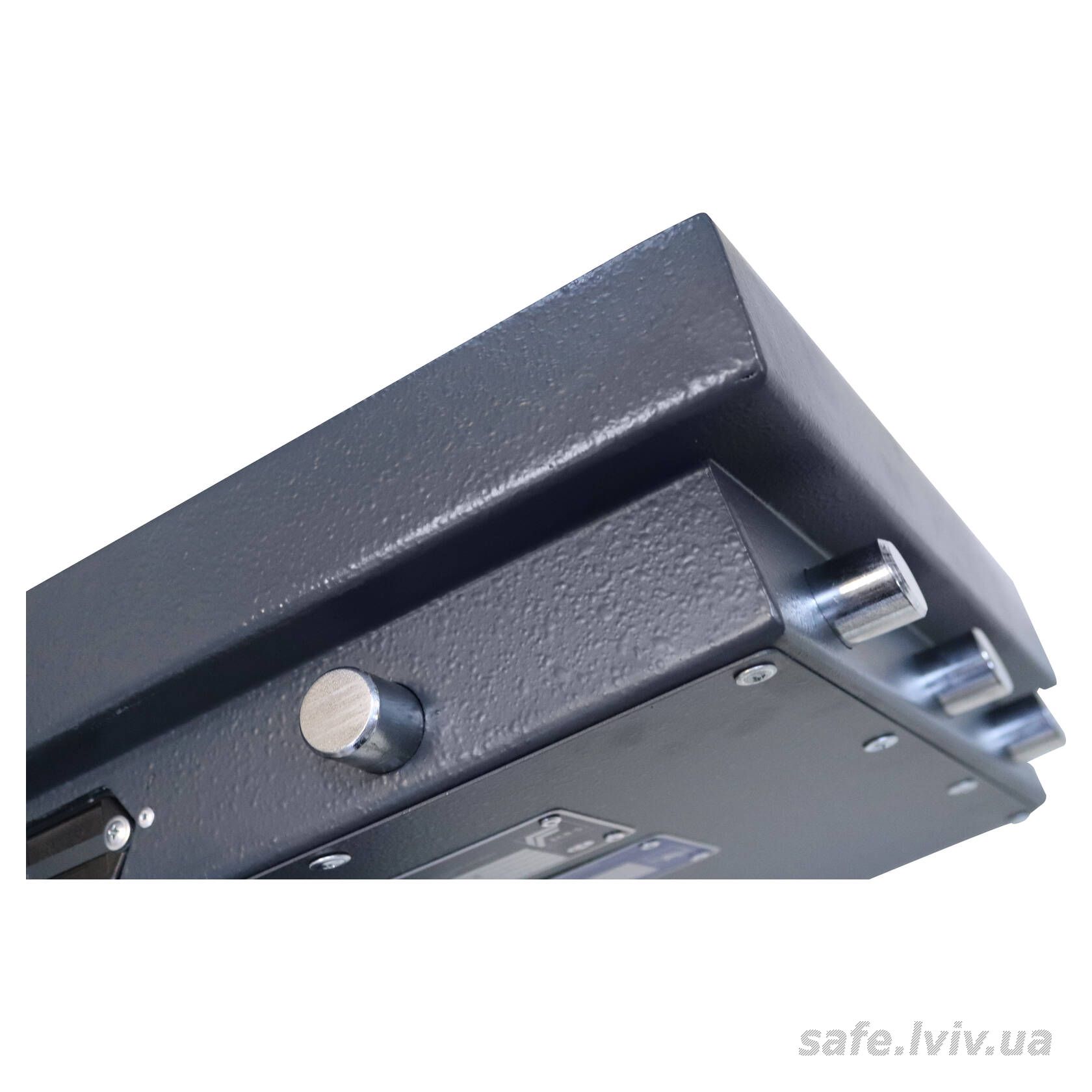 - Конструкція: корпус 55 мм (сталь - зламостійкий бетон - сталь), двері 10 мм (сталь); ригельна система тристороння, 5 ригелів Ø 25 мм.