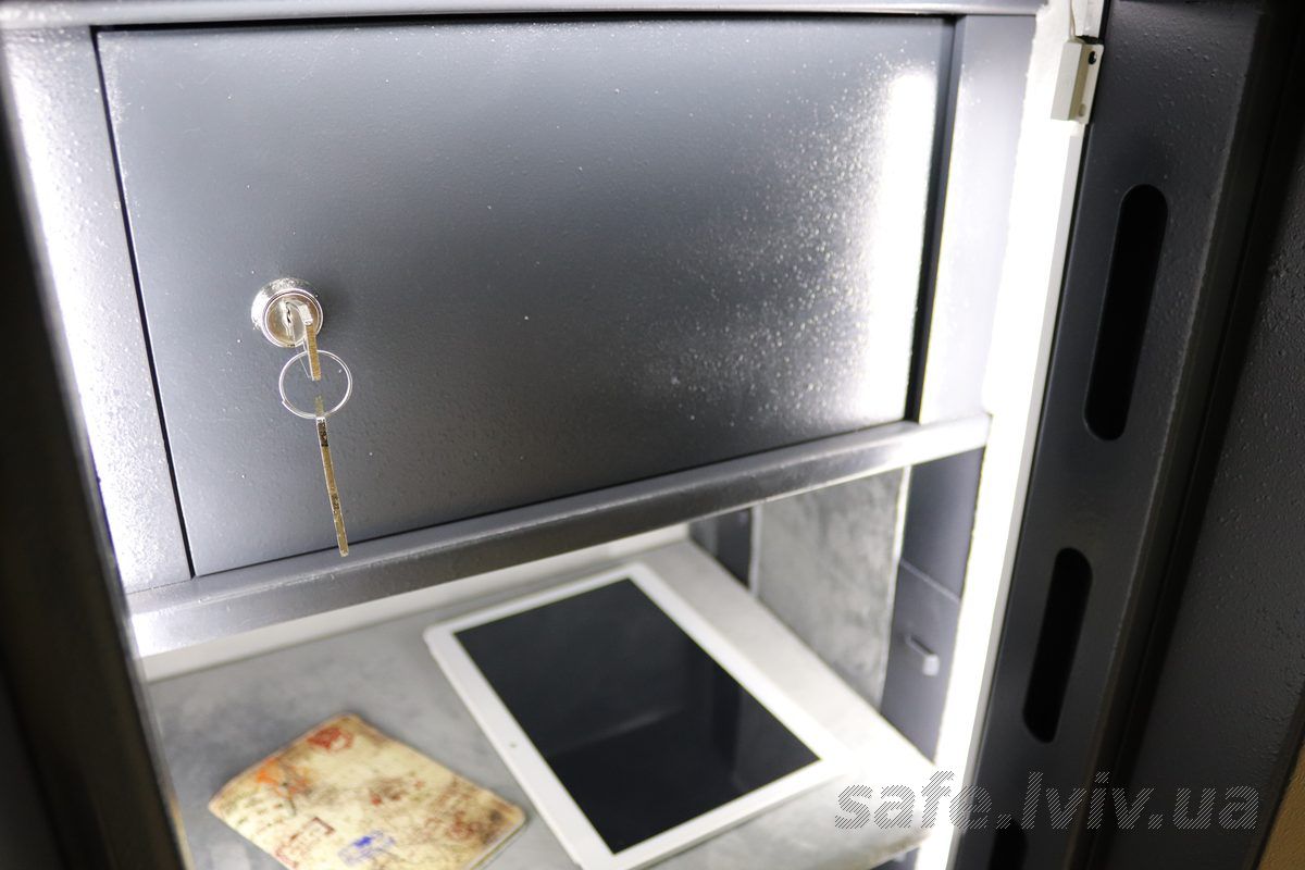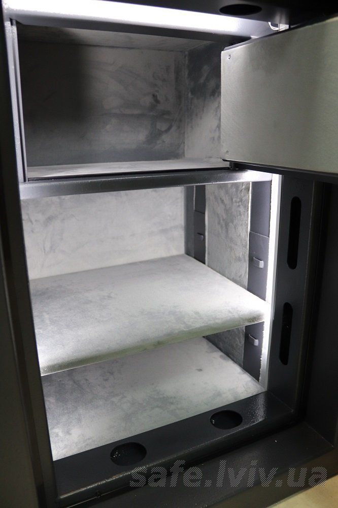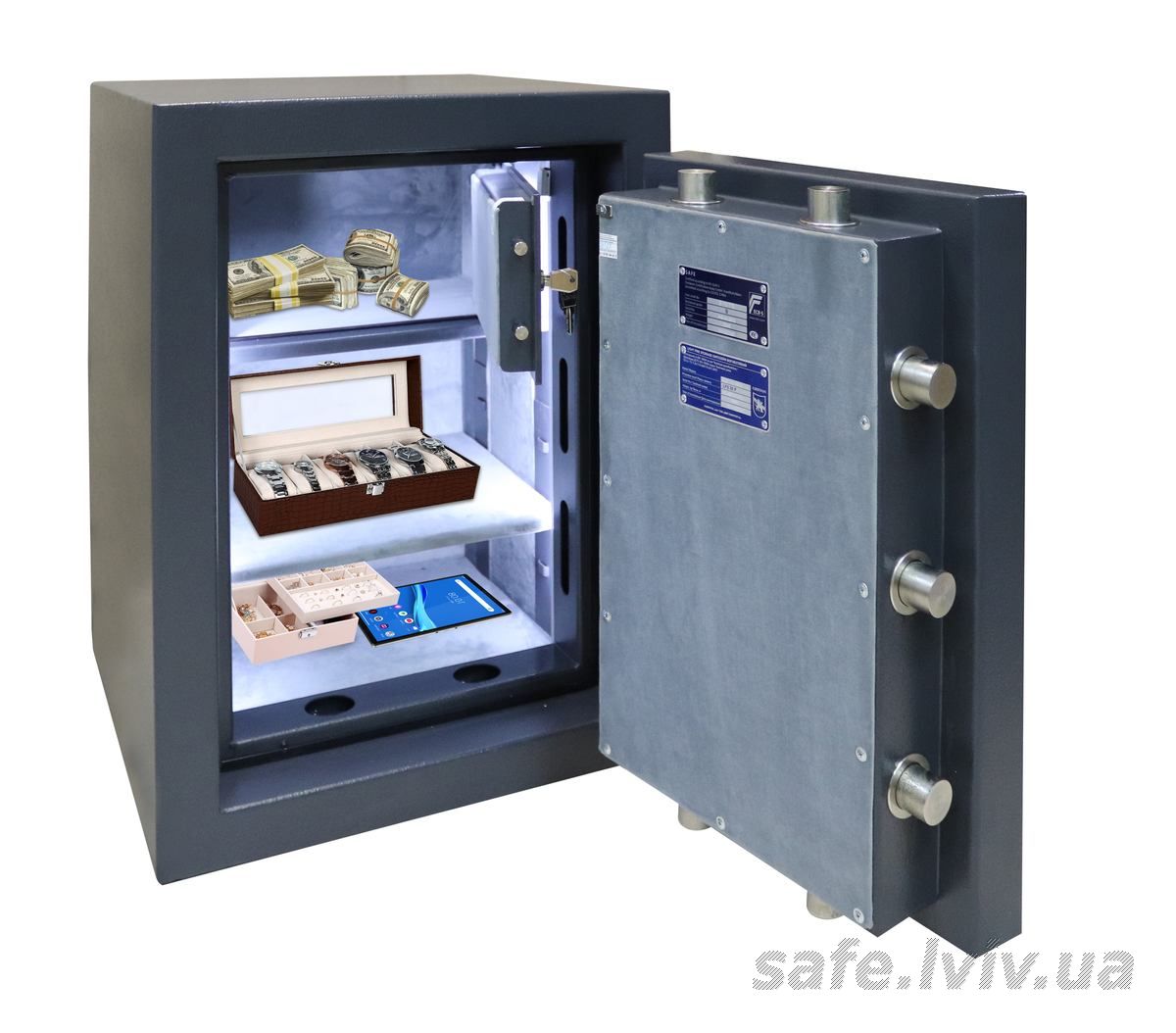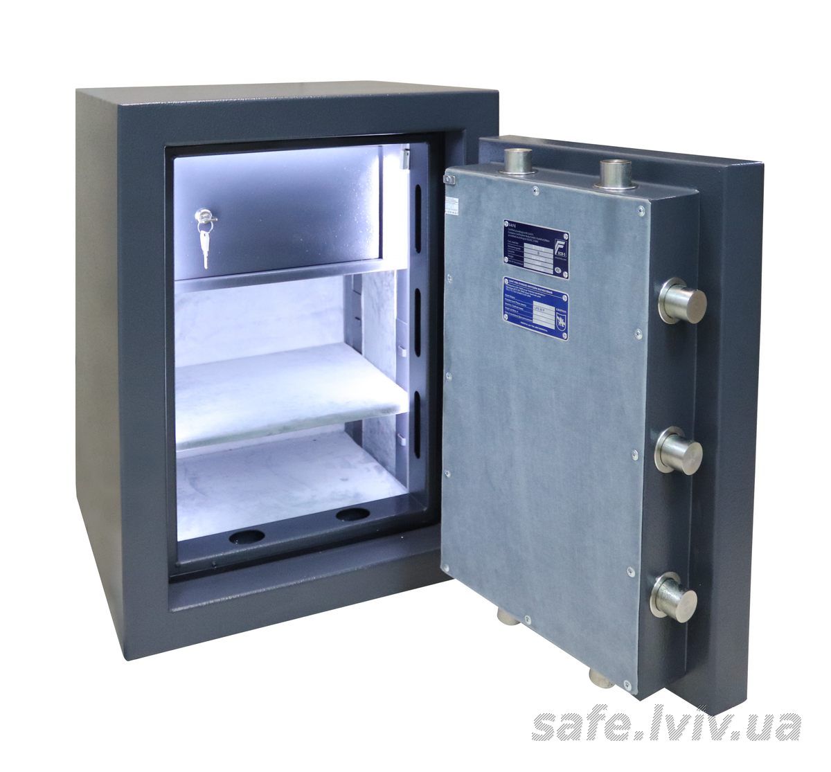 - Конструкція: корпус 55 мм (сталь - зламостійкий бетон - сталь), двері 10 мм (сталь); ригельна система тристороння, 5 ригелів Ø 25 мм.