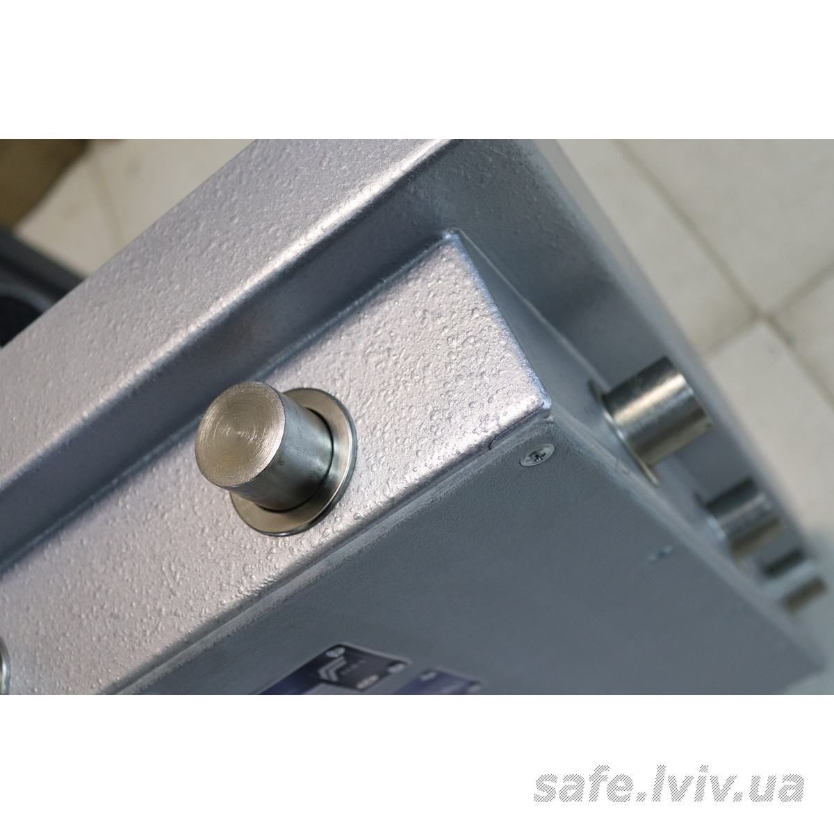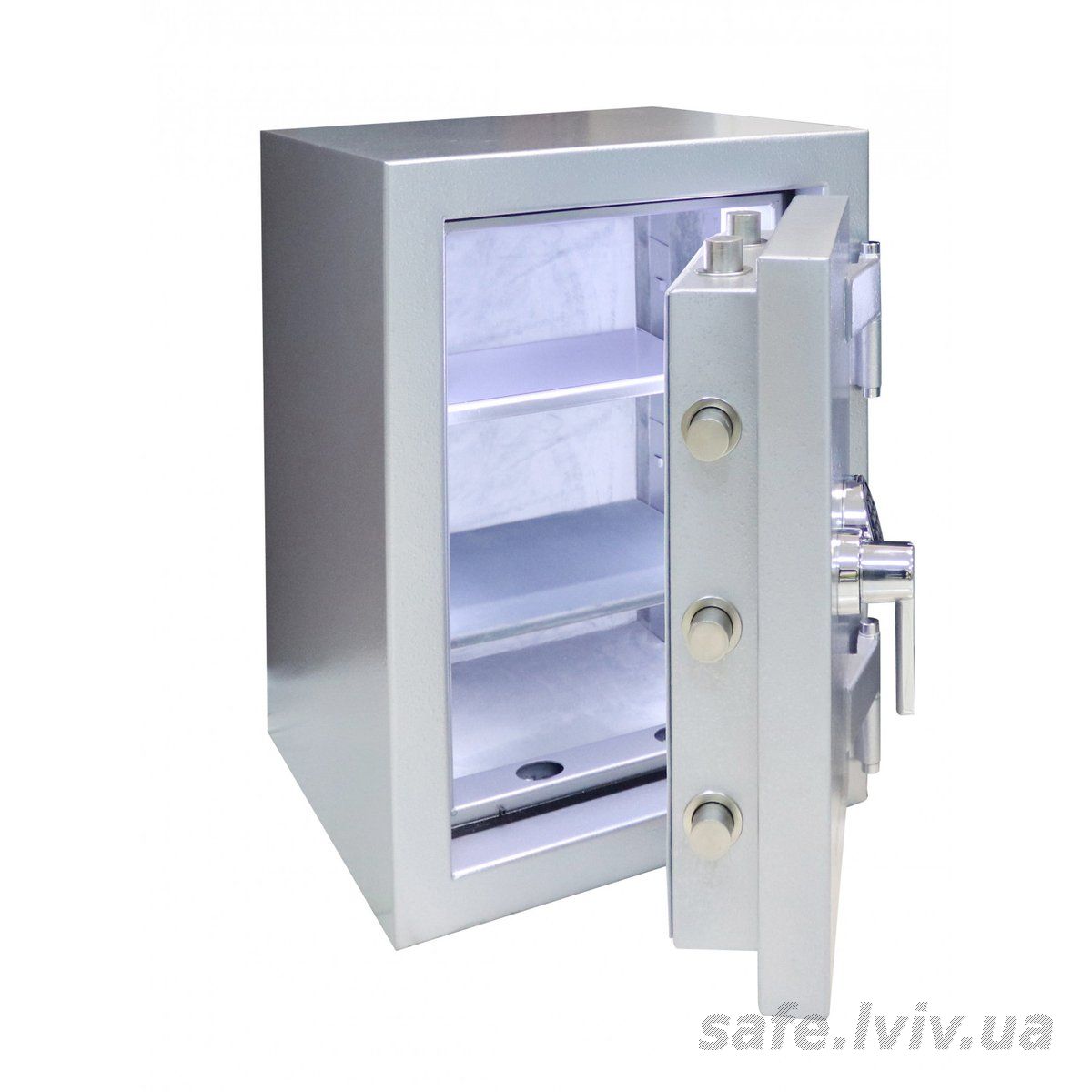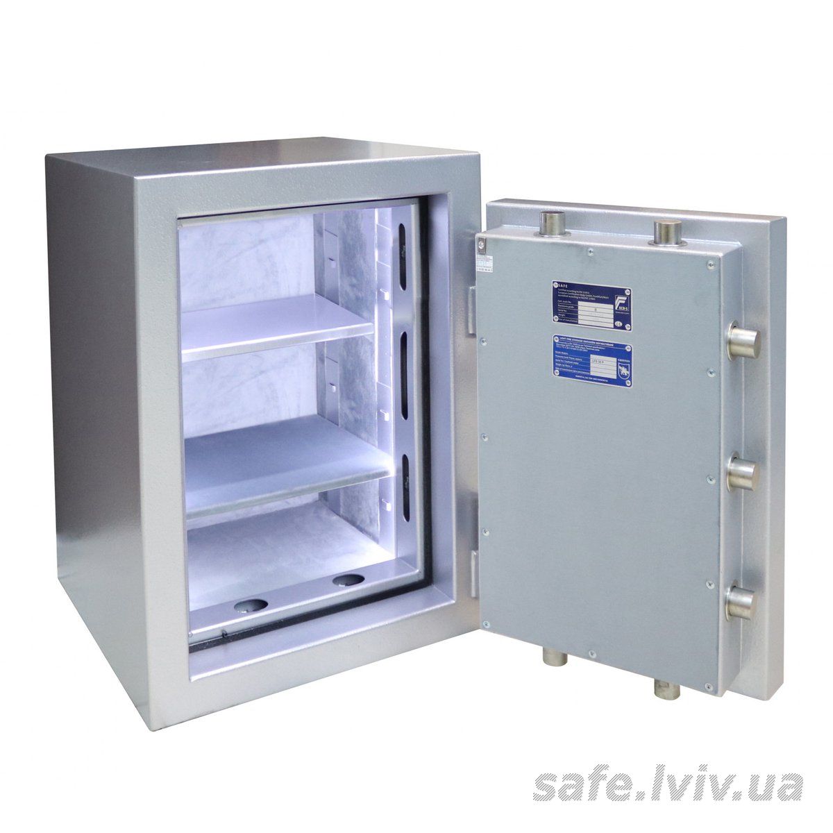 - Конструкція: корпус 55 мм (сталь - зламостійкий бетон - сталь), двері 10 мм (сталь); ригельна система тристороння, 5 ригелів Ø 25 мм.