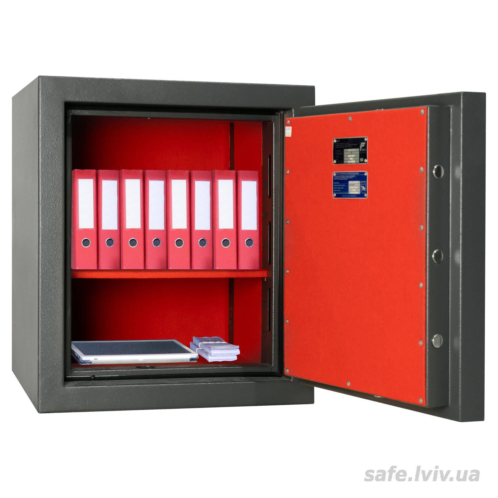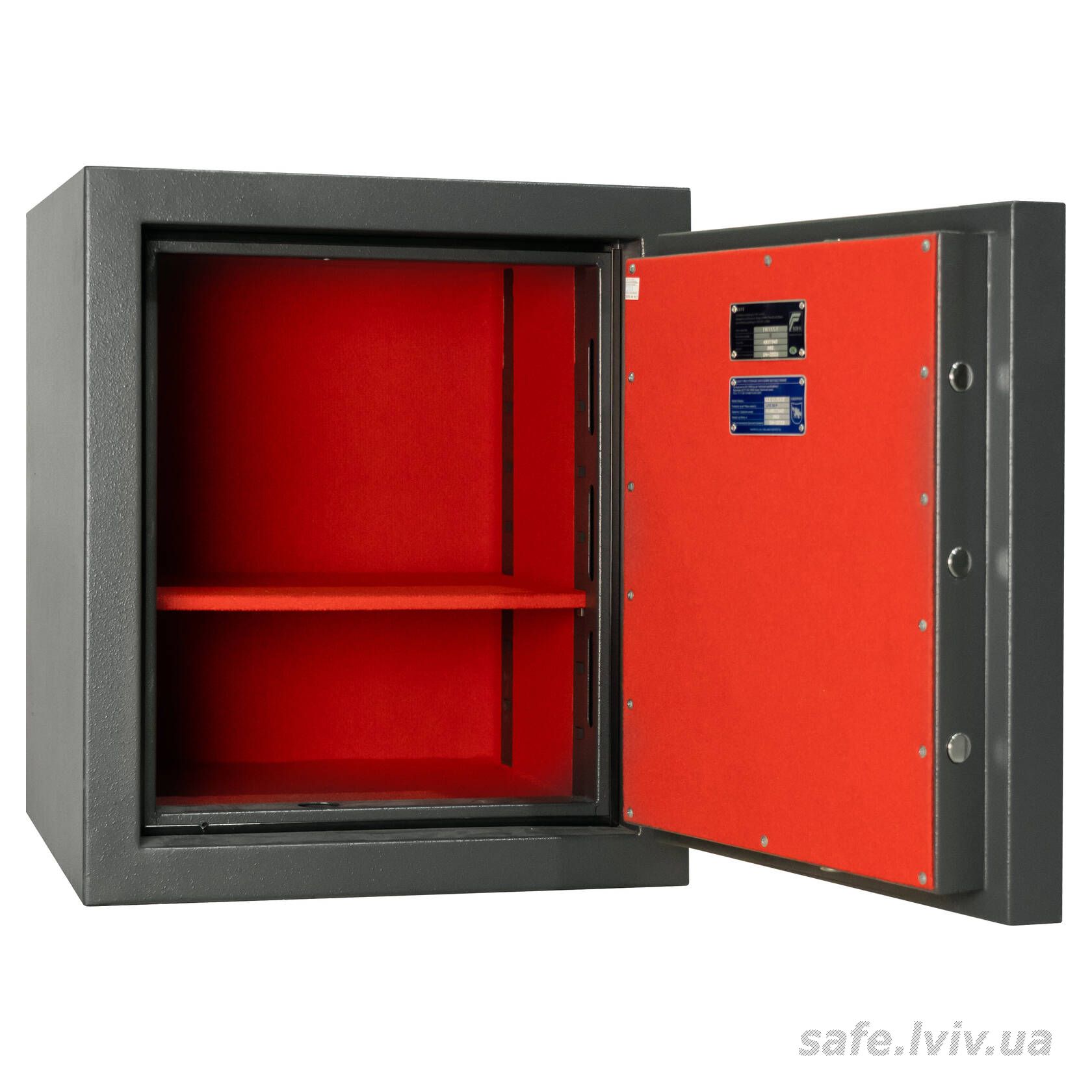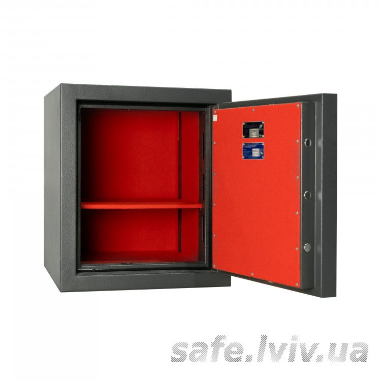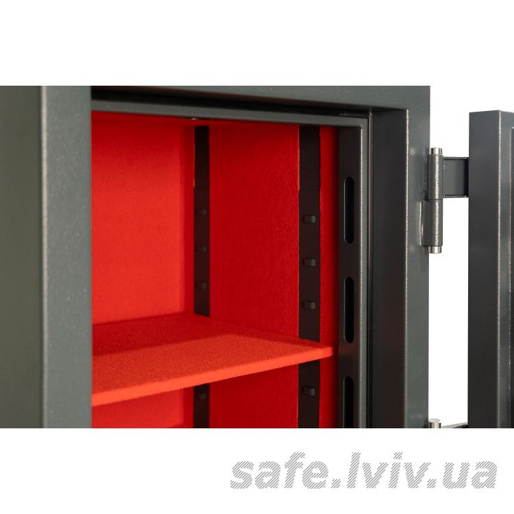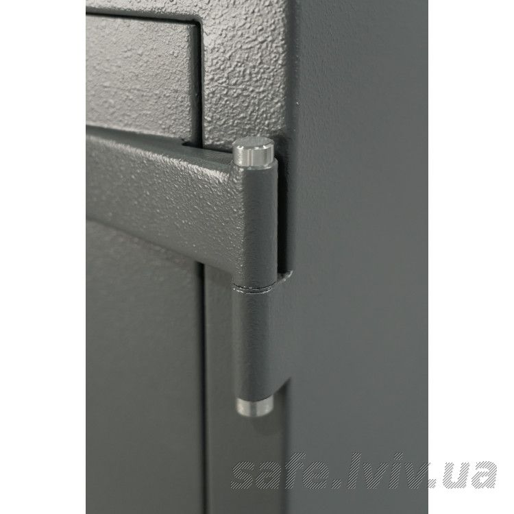 - Конструкція: корпус 55 мм (сталь - зламостійкий бетон - сталь), двері 10 мм (сталь); ригельна система тристороння, 5 ригелів Ø 25 мм.