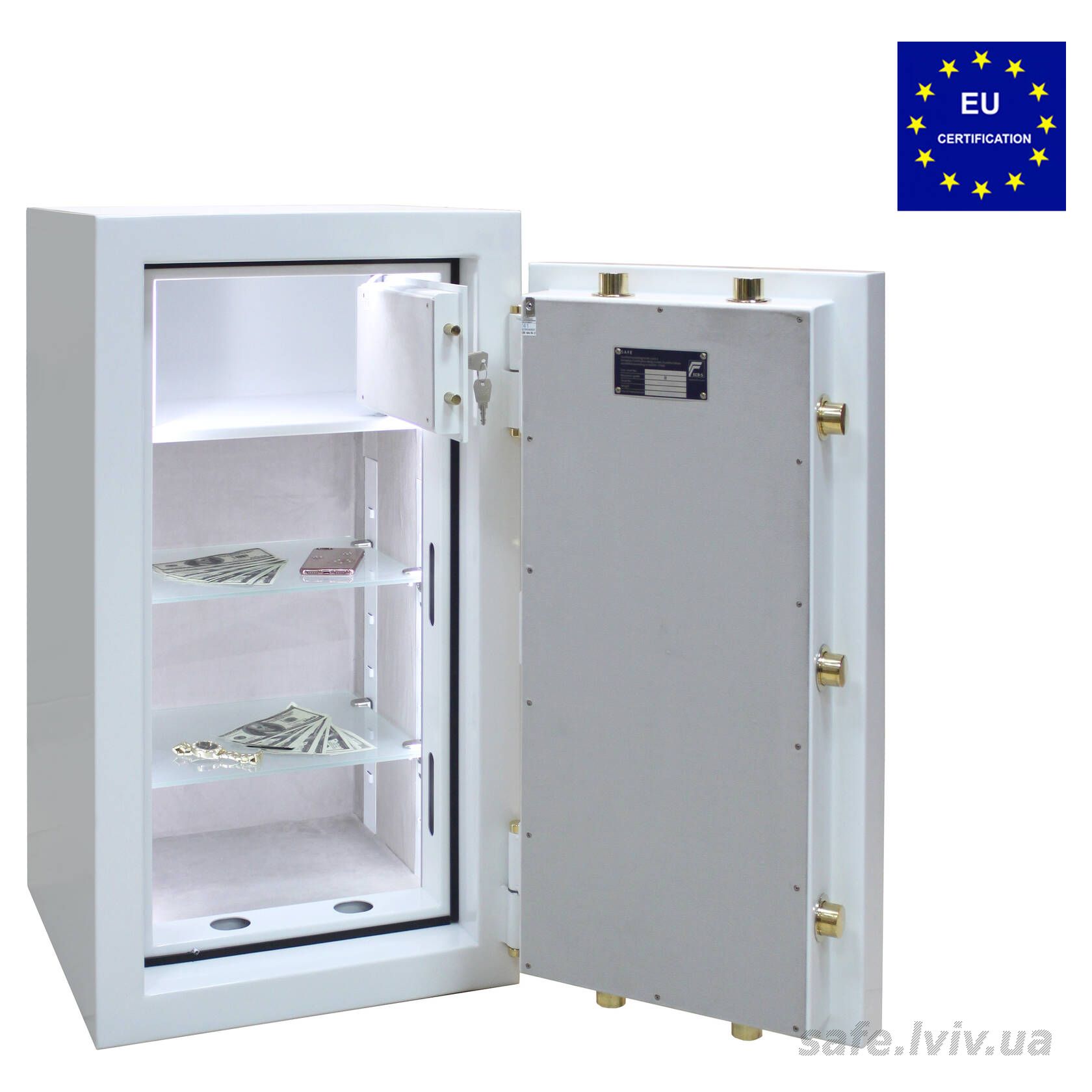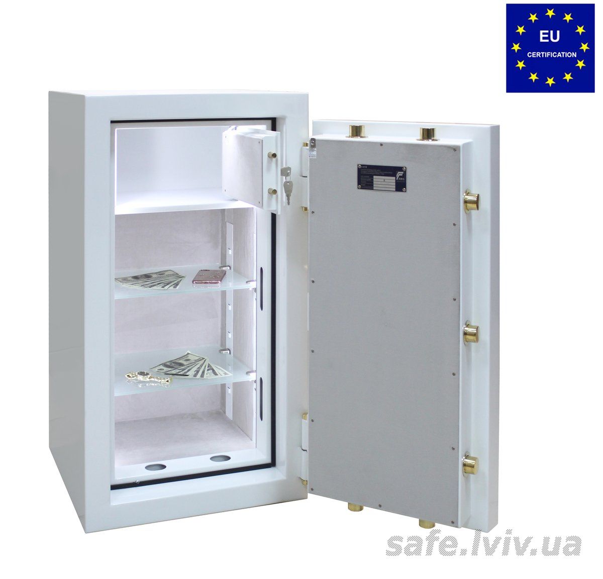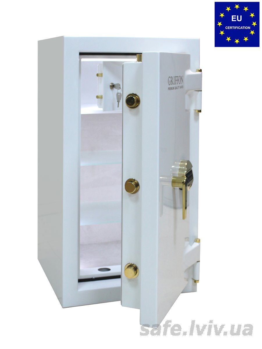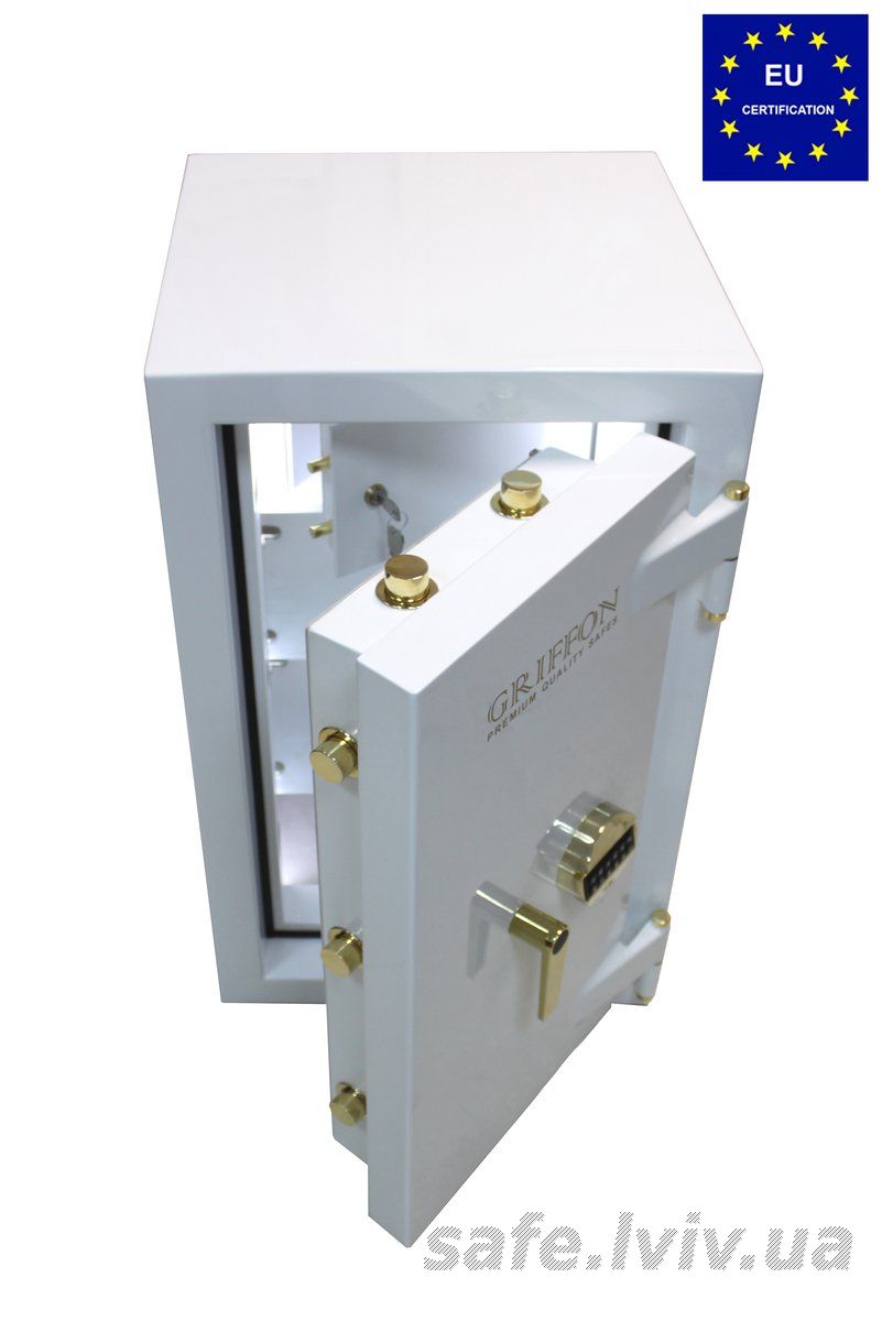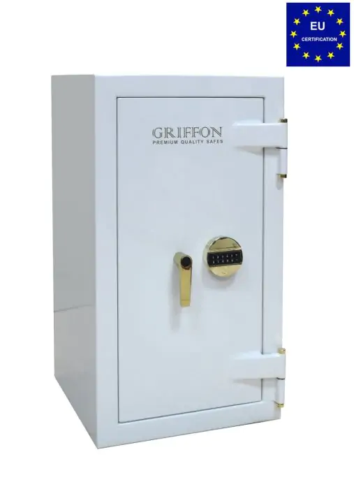 Griffon CLE.II.90.E White Gold це сертифікований сейф клас II за EN 1143-1 та вогнестійкість LFS 30P за EN 15659, випробуваний в Німеччині Європейським органом сертифікації ECB-S. Призначений для надійного зберігання грошей, коштовностей і документів у банках, офісах та приватних будинках. Конструкція корпусу 55 мм (сталь - зламостійкий бетон - сталь), дверей 10 мм (сталь) та ригельна система тристороння, 7 ригелів Ø 25 мм поєднують захист від злому і пожежі. Замок - електронний M-LOCKS (Нідерланди) VdS Class 2 (B). Рекомендовані ліміти зберігання - до 4 000 мінімальних зарплат для особистого користування та до 2 000 для комерційного.