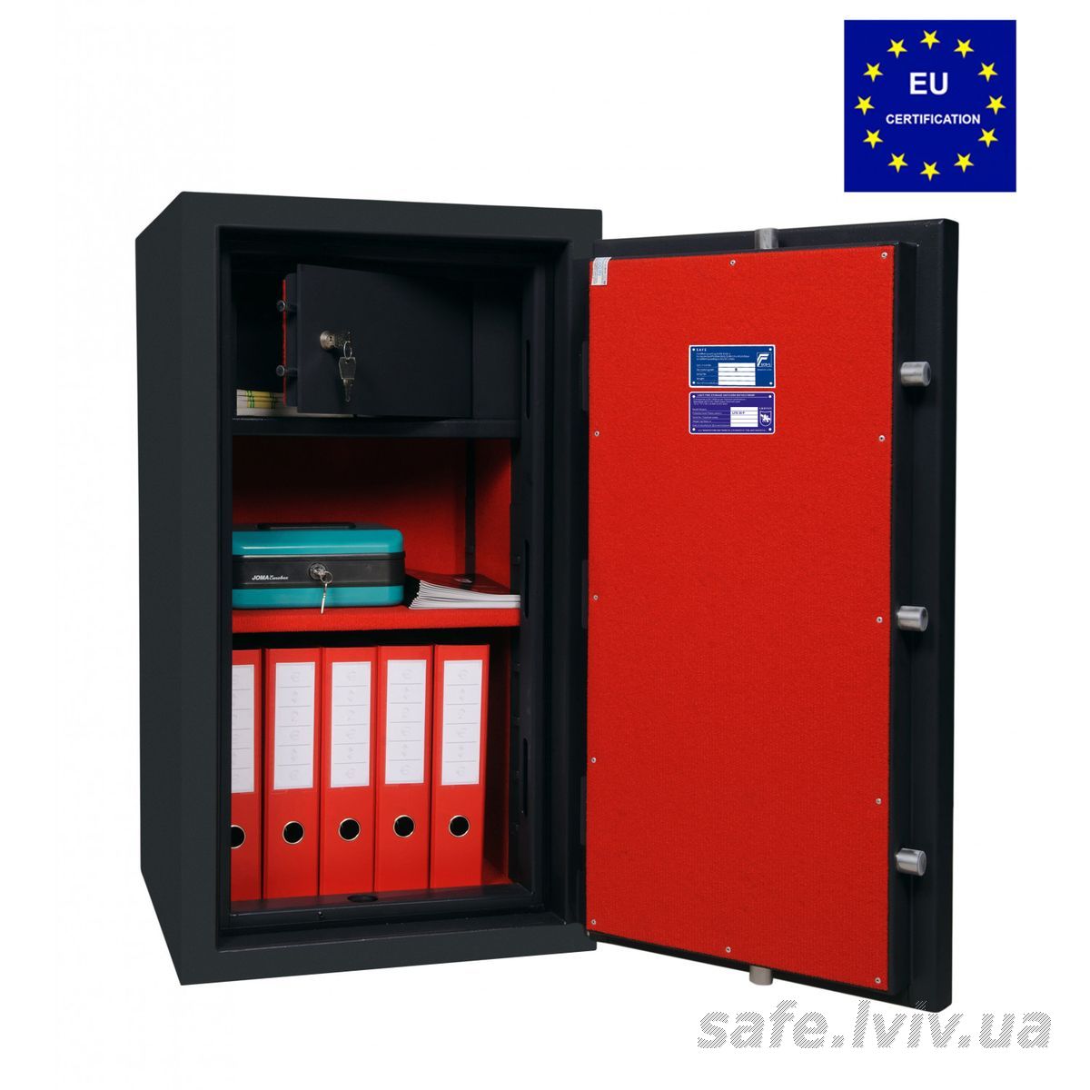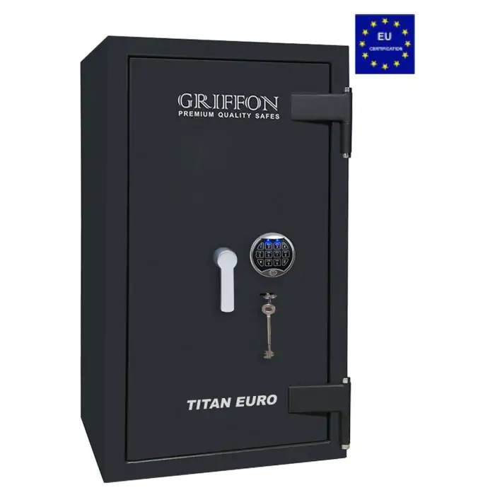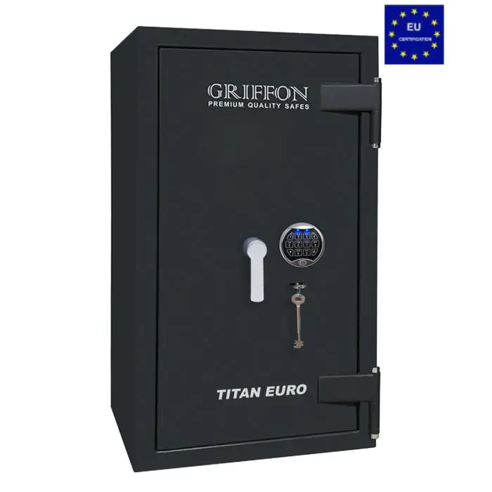 Griffon CLE.II.90.K.E це сертифікований сейф клас II за EN 1143-1 та вогнестійкість LFS 30P за EN 15659, випробуваний в Німеччині Європейським органом сертифікації ECB-S. Призначений для надійного зберігання грошей, коштовностей і документів у банках, офісах та приватних будинках. Конструкція корпусу 55 мм (сталь - зламостійкий бетон - сталь), дверей 10 мм (сталь) та ригельна система тристороння, 5 ригелів Ø 25 мм поєднують захист від злому і пожежі. Замок - ключовий STUV (Німеччина) VdS Class 1 (A), електронний M-LOCKS (Нідерланди) VdS Class 2 (B). Рекомендовані ліміти зберігання - до 4 000 мінімальних зарплат для особистого користування та до 2 000 для комерційного.