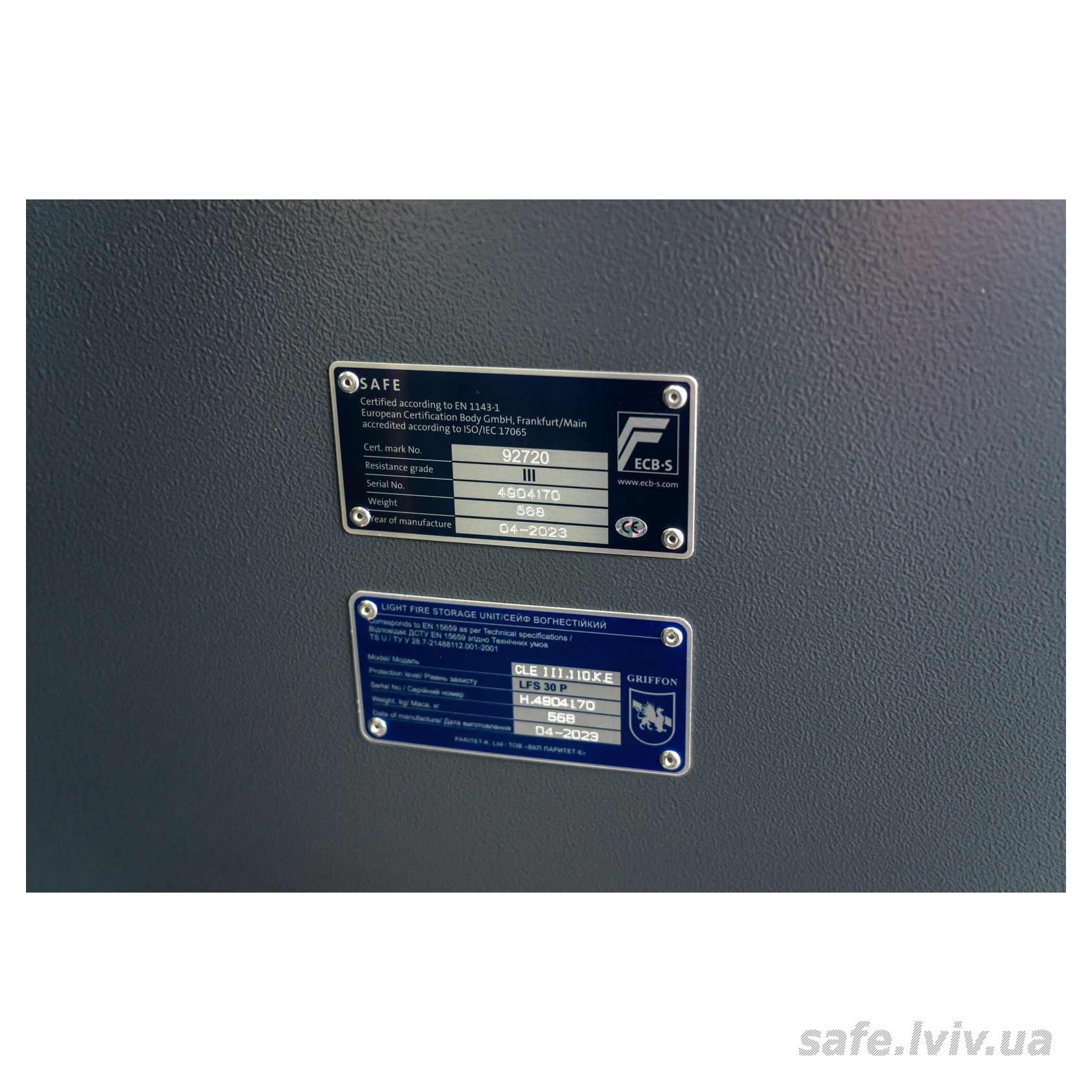 Griffon CLE.III.110.K.E Dark Grey це сертифікований сейф клас III за EN 1143-1 та вогнестійкість LFS 30P за EN 15659, випробуваний у Німеччині європейським органом сертифікації ECB-S. Призначений для надійного зберігання грошей, коштовностей і документів у банках, офісах та приватних будинках. Зламостійкість забезпечує конструкція корпусу 50 мм (сталь - зламостійкий бетон - сталь), дверей 110 мм (сталь - зламостійкий бетон - сталь), ригельна система тристороння, 8 ригелів Ø 25 мм, замок - ключовий STUV (Німеччина) VdS Class 1 (A), електронний Carl Wittkopp (Німеччина) VdS Class 2 (B). Товщина захисного шару 50 мм. Рекомендовані ліміти зберігання - до 8000 мінімальних зарплат для особистого користування та до 4000 для комерційного.