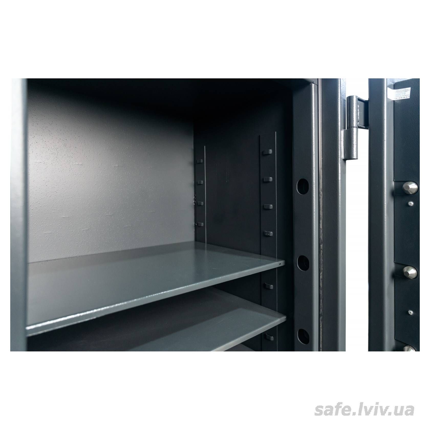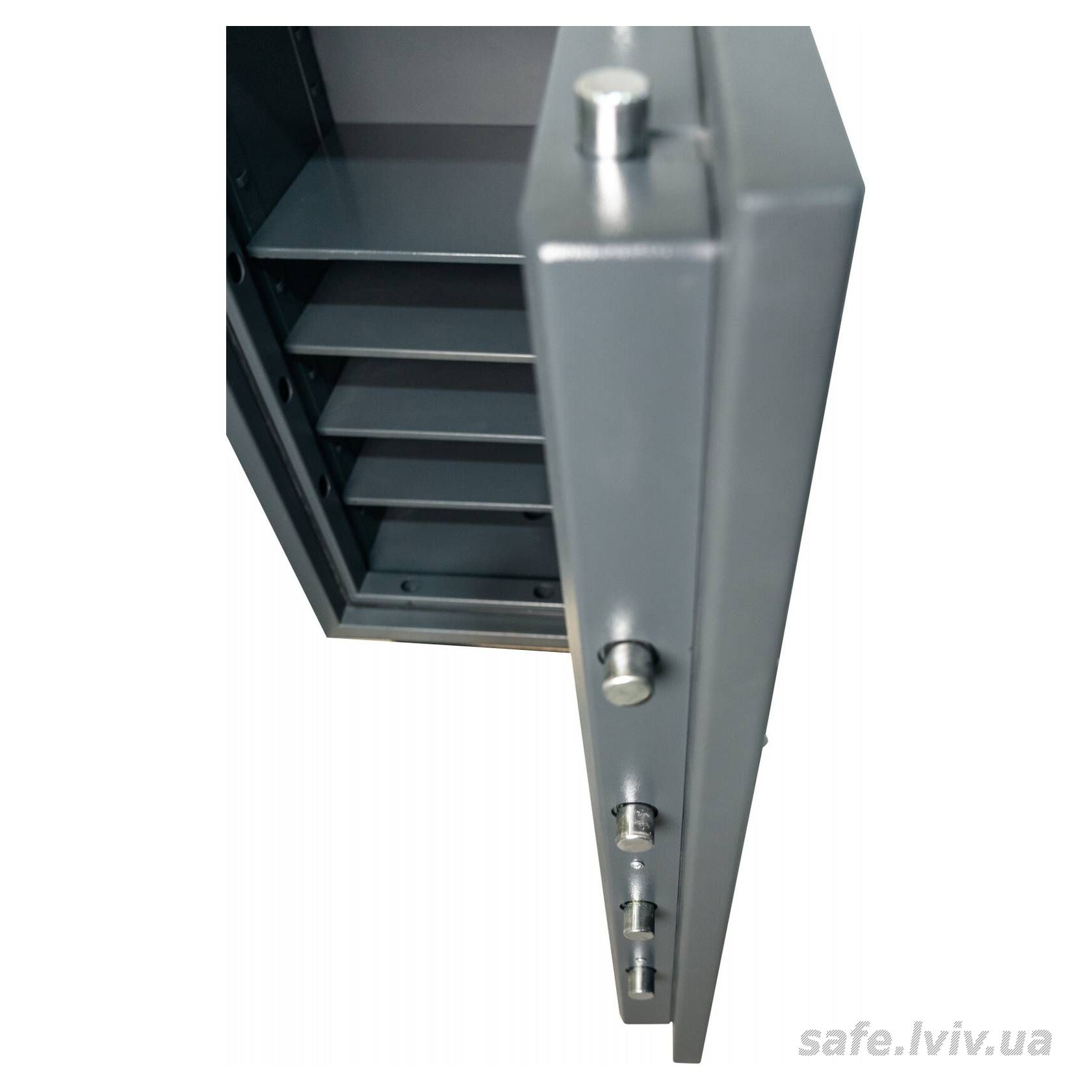 - Конструкція: корпус 50 мм (сталь - зламостійкий бетон - сталь), двері 110 мм (сталь - зламостійкий бетон - сталь); ригельна система тристороння, 8 ригелів Ø 25 мм.