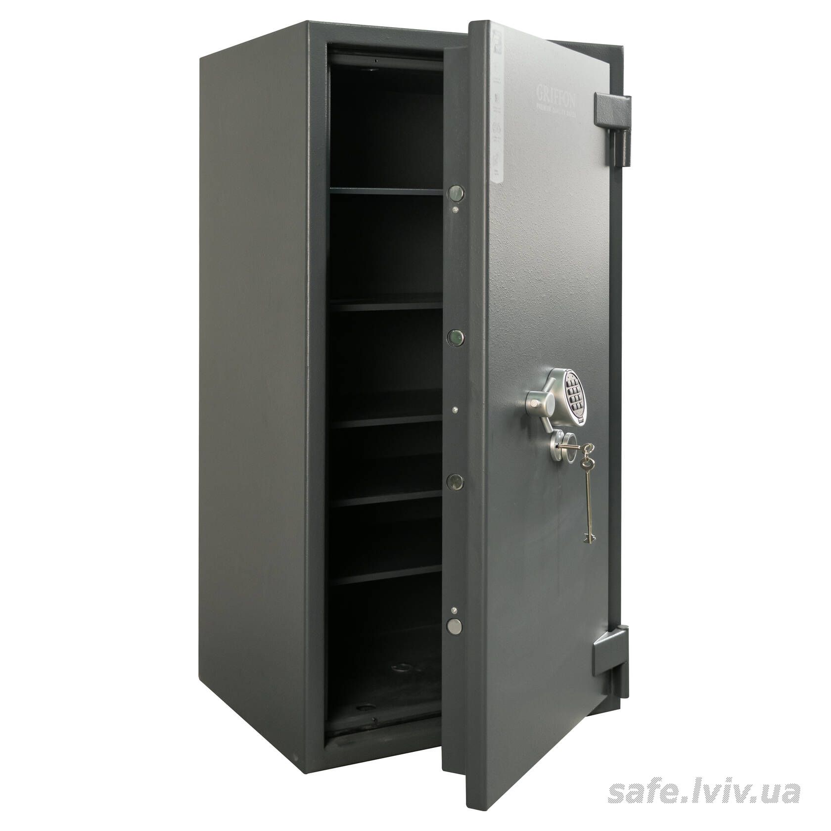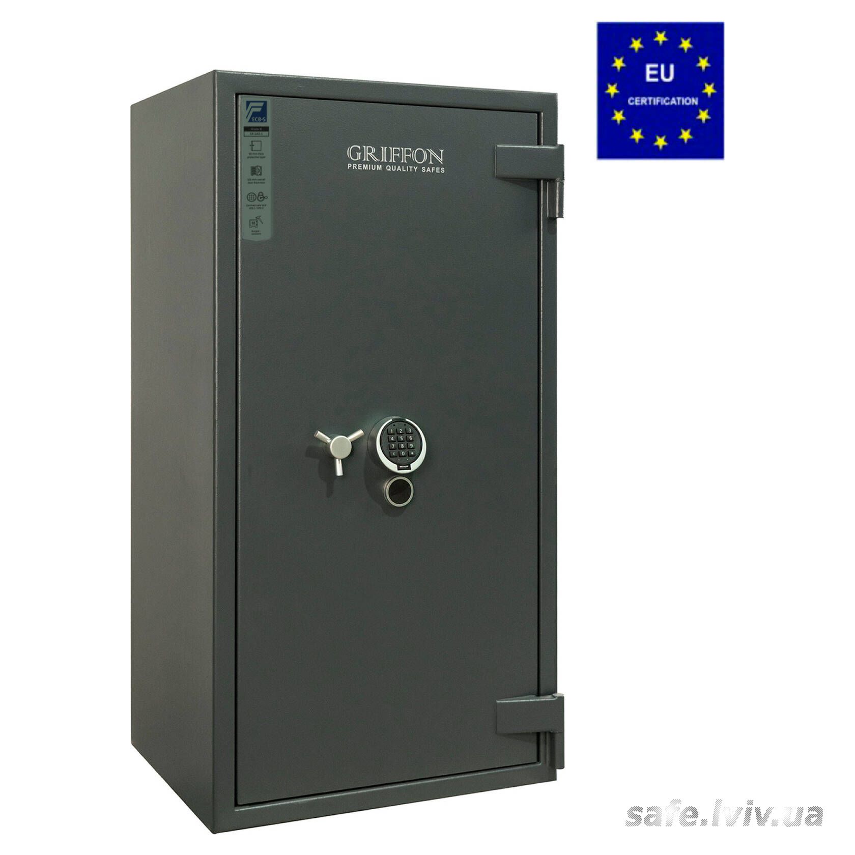 Griffon CLE.III.140.K.E це сертифікований сейф клас III за EN 1143-1 та вогнестійкість LFS 30P за EN 15659, випробуваний у Німеччині європейським органом сертифікації ECB-S. Призначений для надійного зберігання грошей, коштовностей і документів у банках, офісах та приватних будинках. Зламостійкість забезпечує конструкція корпусу 50 мм (сталь - зламостійкий бетон - сталь), дверей 110 мм (сталь - зламостійкий бетон - сталь), ригельна система тристороння, 8 ригелів Ø 25 мм, замок - ключовий STUV (Німеччина) VdS Class 1 (A), електронний STUV SWINGLOX (Німеччина) VdS Class 2. Товщина захисного шару 50 мм. Рекомендовані ліміти зберігання - до 8000 мінімальних зарплат для особистого користування та до 4000 для комерційного.