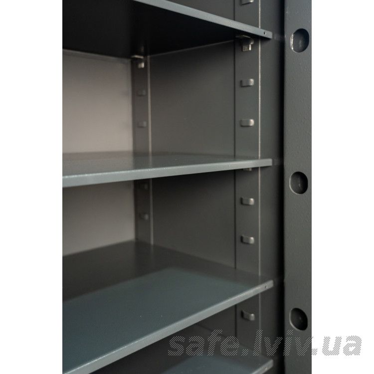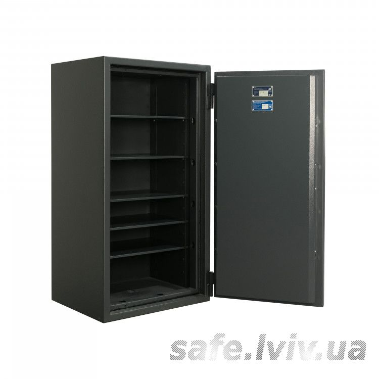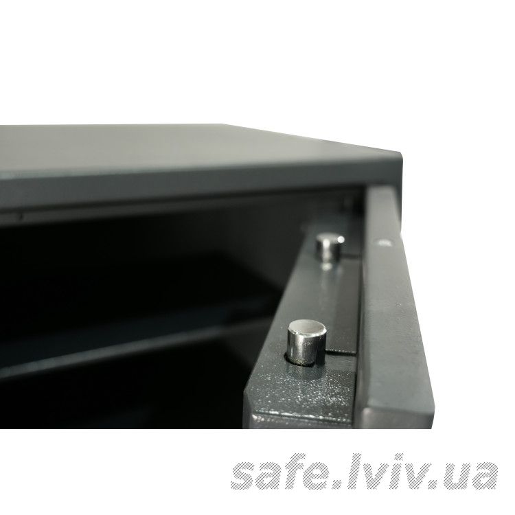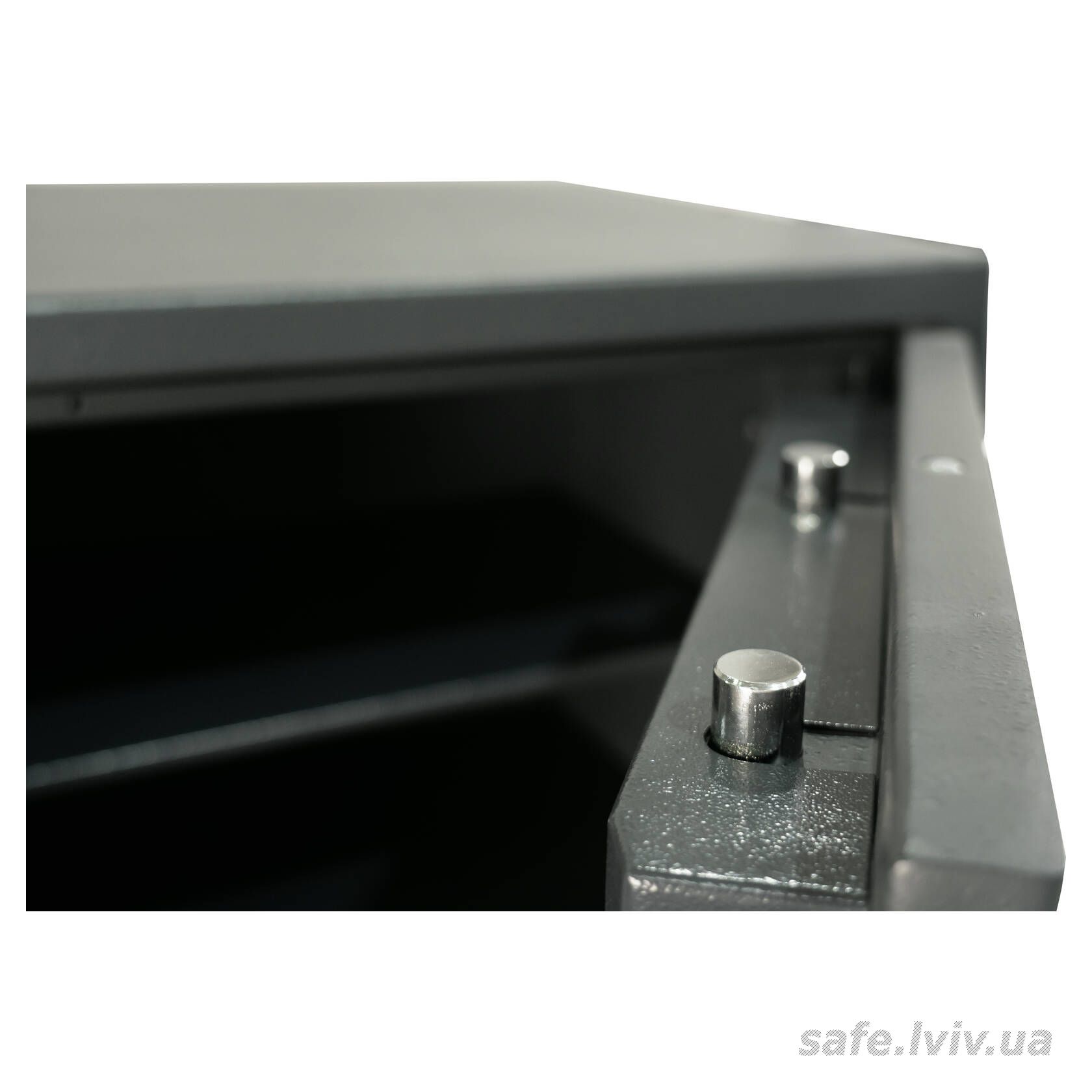 - Конструкція: корпус 50 мм (сталь - зламостійкий бетон - сталь), двері 110 мм (сталь - зламостійкий бетон - сталь); ригельна система тристороння, 8 ригелів Ø 25 мм.