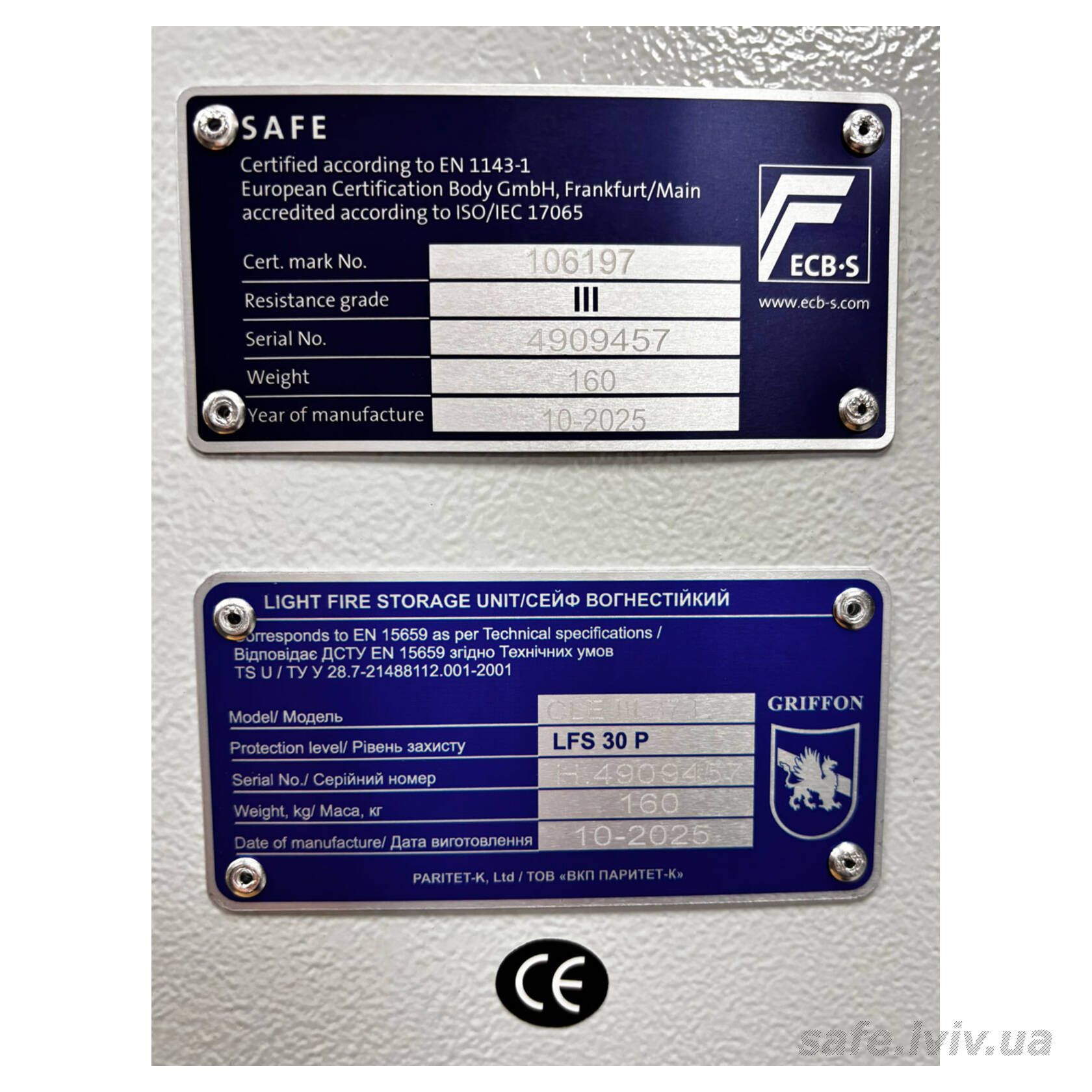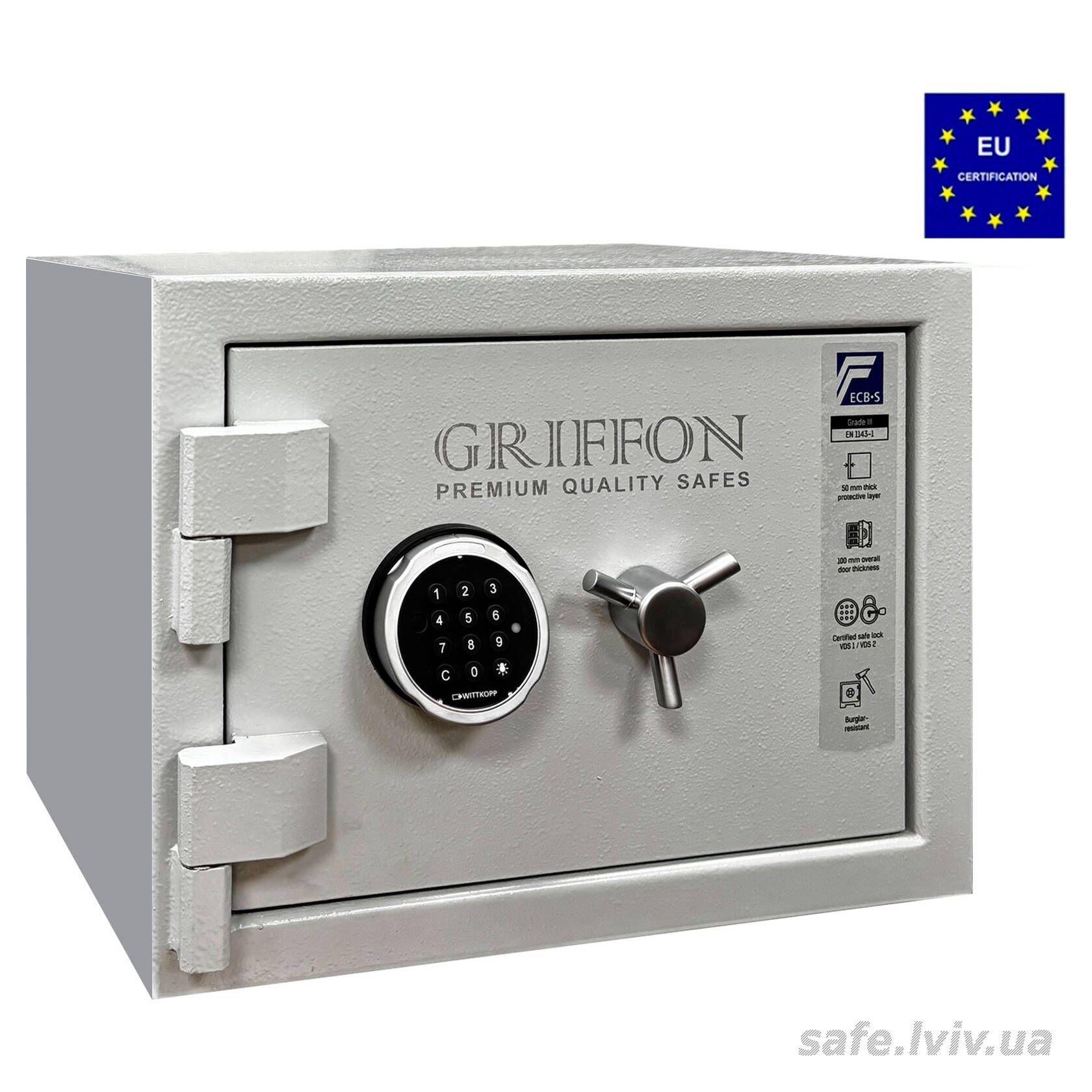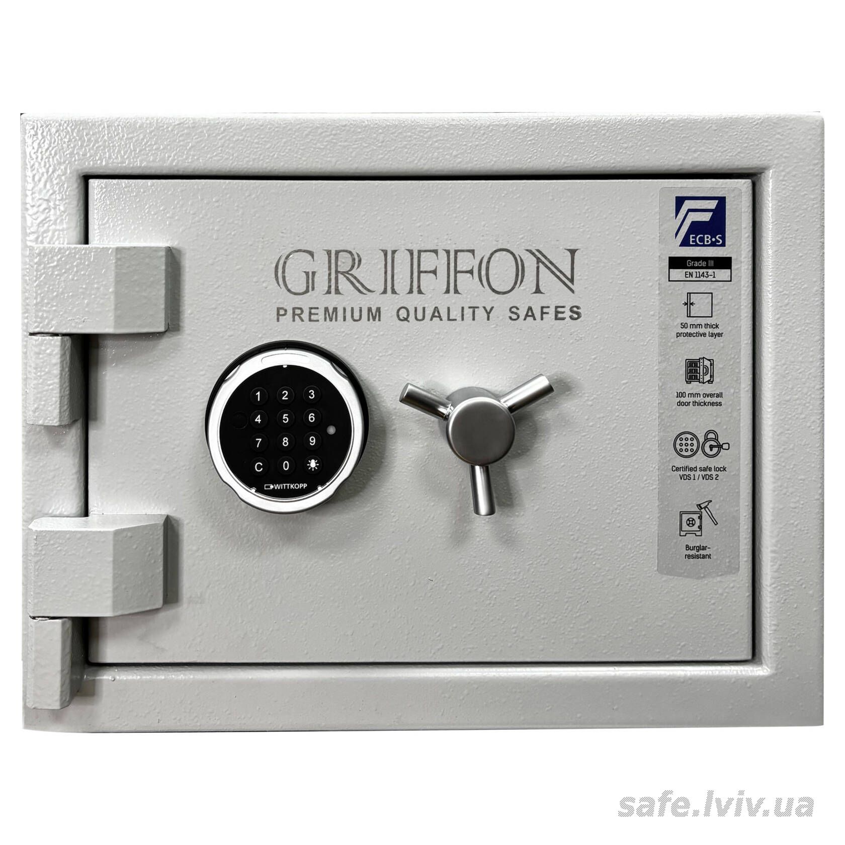 Griffon CLE.III.37.E Grey Left Side це сертифікований сейф клас III за EN 1143-1 та вогнестійкість LFS 30P за EN 15659, випробуваний у Німеччині європейським органом сертифікації ECB-S. Призначений для надійного зберігання грошей, коштовностей і документів у банках, офісах та приватних будинках. Зламостійкість забезпечує конструкція корпусу 50 мм (сталь - зламостійкий бетон - сталь), дверей 110 мм (сталь - зламостійкий бетон - сталь), ригельна система тристороння, 8 ригелів Ø 25 мм, замок - електронний STUV SWINGLOX (Німеччина) VdS Class 2. Товщина захисного шару 50 мм. Рекомендовані ліміти зберігання - до 8000 мінімальних зарплат для особистого користування та до 4000 для комерційного.