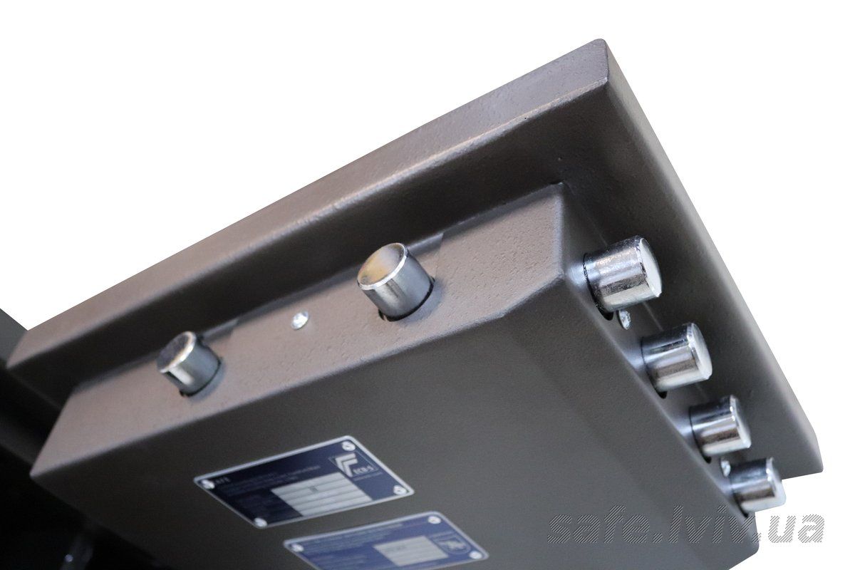 - Конструкція: корпус 50 мм (сталь - зламостійкий бетон - сталь), двері 110 мм (сталь - зламостійкий бетон - сталь); ригельна система тристороння, 8 ригелів Ø 25 мм.