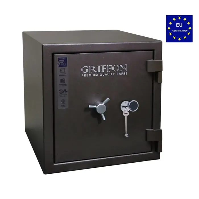 Griffon CLE.III.50.K це сертифікований сейф клас III за EN 1143-1 та вогнестійкість LFS 30P за EN 15659, випробуваний у Німеччині європейським органом сертифікації ECB-S. Призначений для надійного зберігання грошей, коштовностей і документів у банках, офісах та приватних будинках. Зламостійкість забезпечує конструкція корпусу 50 мм (сталь - зламостійкий бетон - сталь), дверей 110 мм (сталь - зламостійкий бетон - сталь), ригельна система тристороння, 8 ригелів Ø 25 мм, замок - ключовий STUV (Німеччина) VdS Class 1 (A). Товщина захисного шару 50 мм. Рекомендовані ліміти зберігання - до 8000 мінімальних зарплат для особистого користування та до 4000 для комерційного.