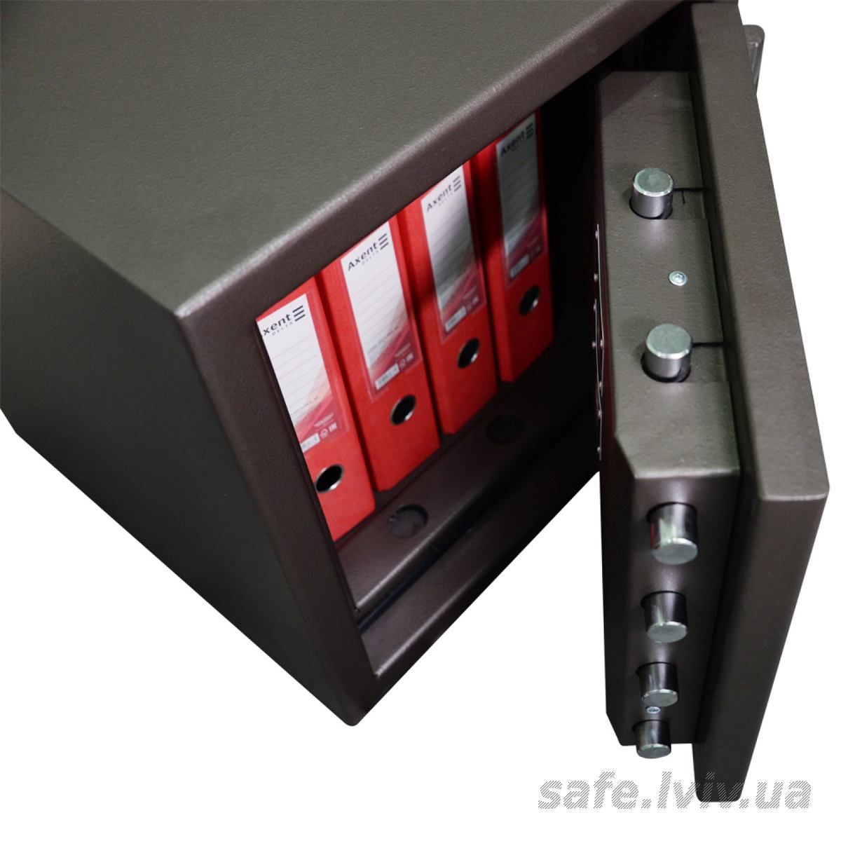 - Конструкція: корпус 50 мм (сталь - зламостійкий бетон - сталь), двері 110 мм (сталь - зламостійкий бетон - сталь); ригельна система тристороння, 8 ригелів Ø 25 мм.