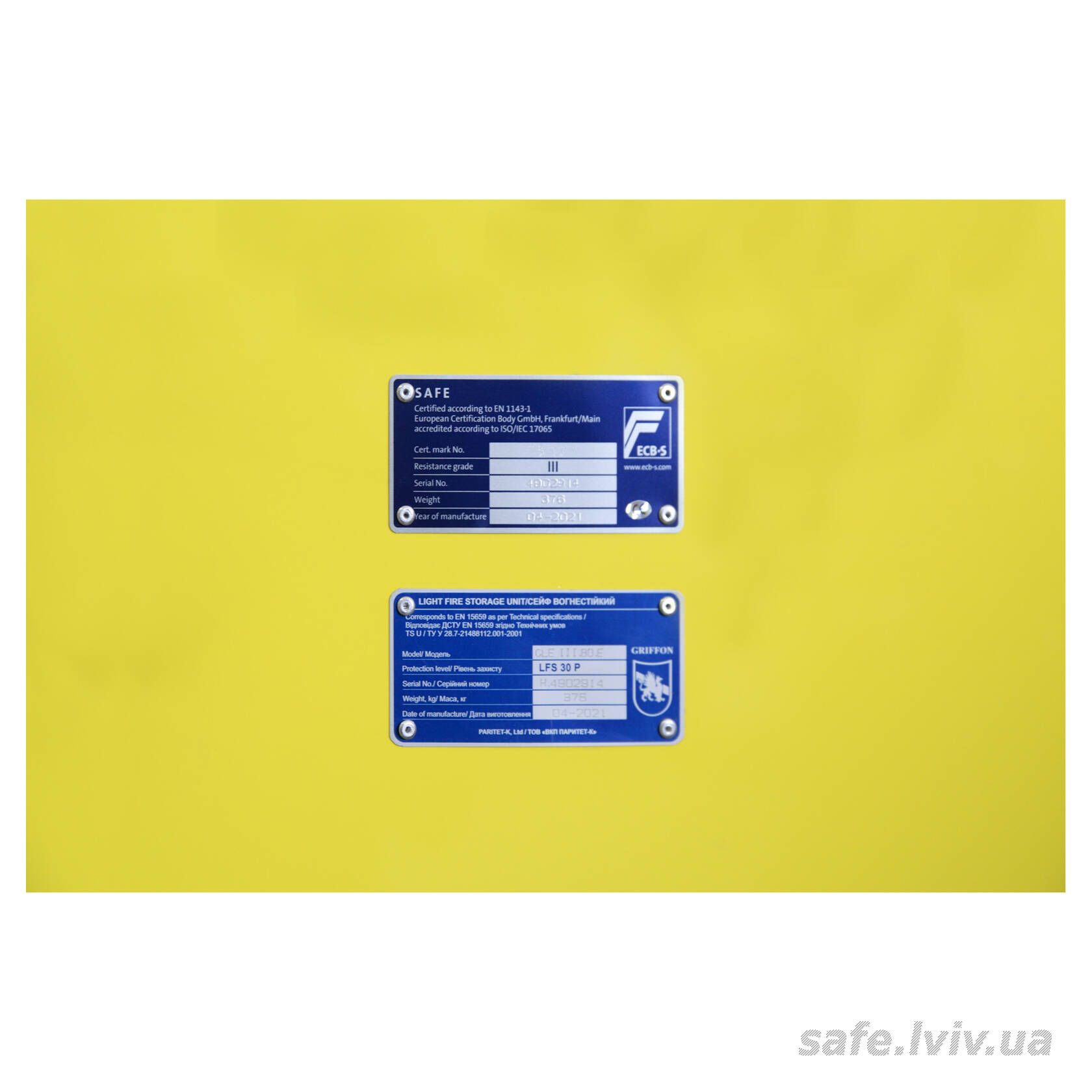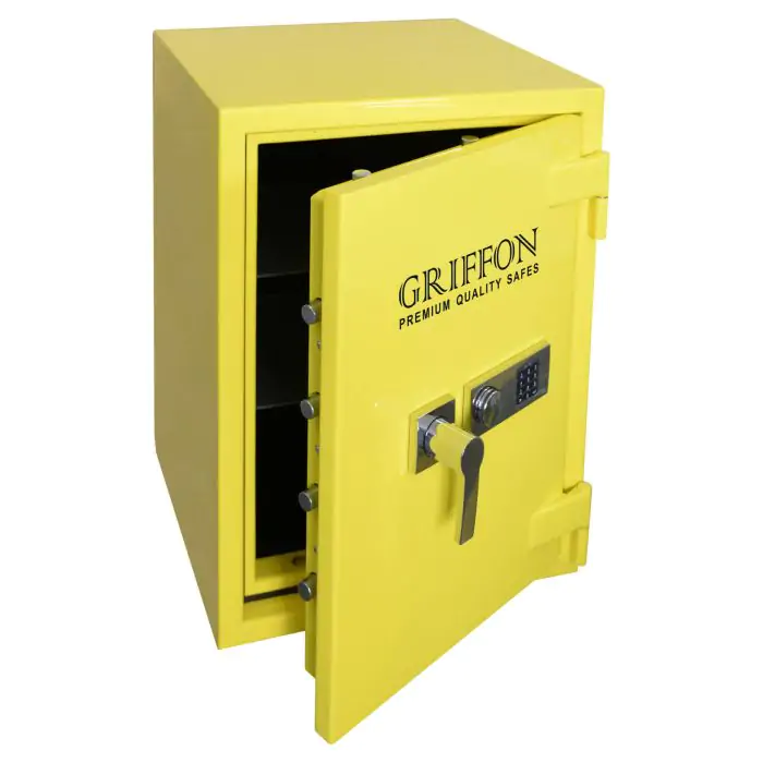 Griffon CLE.III.80.E Combi Gloss Yellow це сертифікований сейф клас III за EN 1143-1 та вогнестійкість LFS 30P за EN 15659, випробуваний у Німеччині європейським органом сертифікації ECB-S. Призначений для надійного зберігання грошей, коштовностей і документів у банках, офісах та приватних будинках. Зламостійкість забезпечує конструкція корпусу 50 мм (сталь - зламостійкий бетон - сталь), дверей 110 мм (сталь - зламостійкий бетон - сталь), ригельна система тристороння, 7 ригелів Ø 25 мм, замок - електронний Kaba Combi (Німеччина) VdS Class 2 (B). Товщина захисного шару 50 мм. Рекомендовані ліміти зберігання - до 8000 мінімальних зарплат для особистого користування та до 4000 для комерційного.