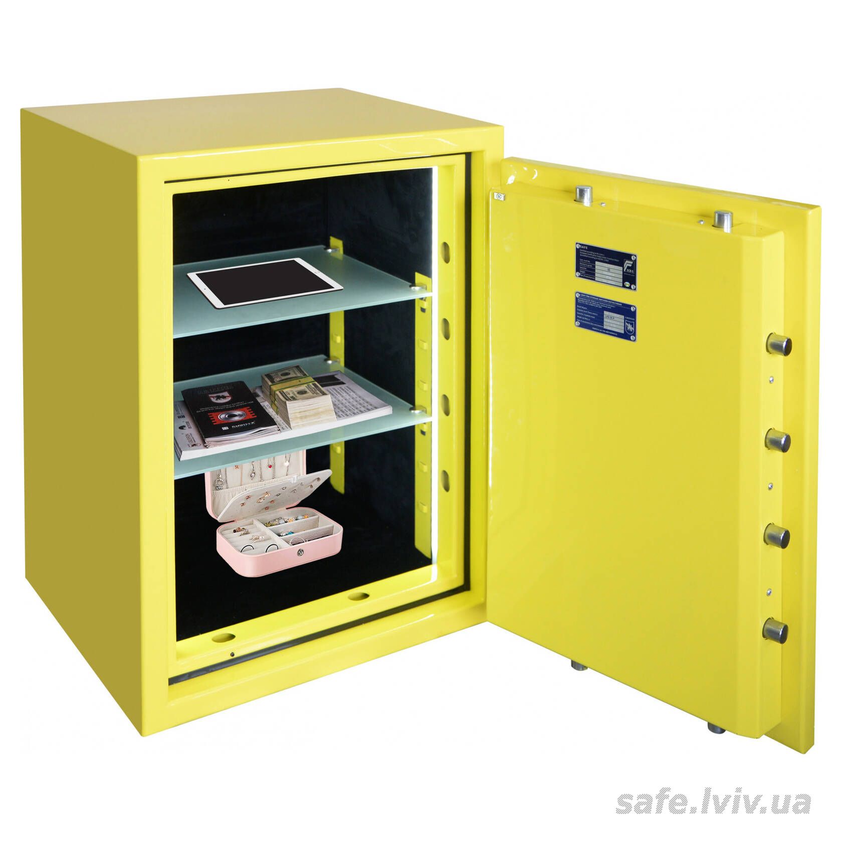 - Замок: електронний Kaba Combi (Німеччина) VdS Class 2 (B); мінімум один сертифікований сейфовий замок класу B (VdS2).