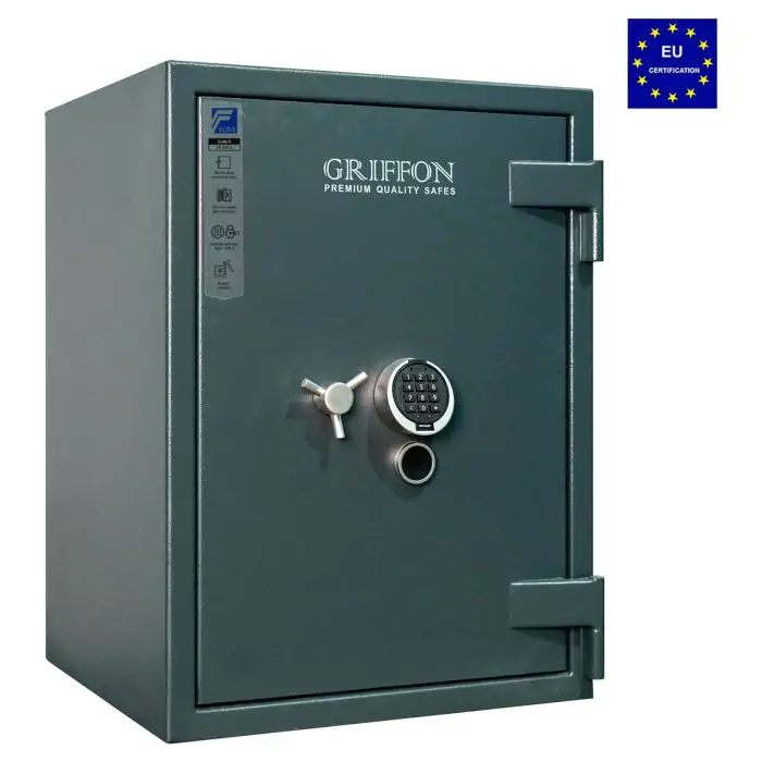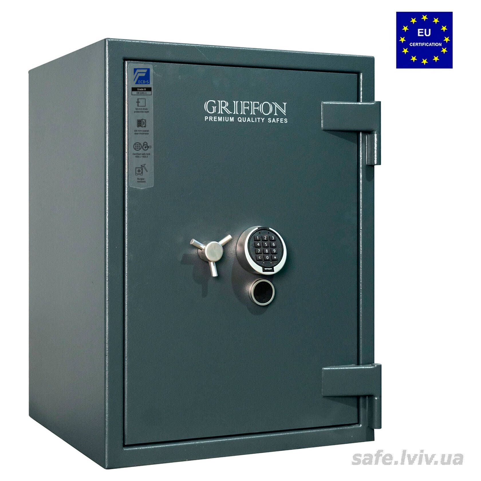 Griffon CLE.III.80.K.E це сертифікований сейф клас III за EN 1143-1 та вогнестійкість LFS 30P за EN 15659, випробуваний у Німеччині європейським органом сертифікації ECB-S. Призначений для надійного зберігання грошей, коштовностей і документів у банках, офісах та приватних будинках. Зламостійкість забезпечує конструкція корпусу 50 мм (сталь - зламостійкий бетон - сталь), дверей 110 мм (сталь - зламостійкий бетон - сталь), ригельна система тристороння, 8 ригелів Ø 25 мм, замок - ключовий STUV (Німеччина) VdS Class 1 (A), електронний Carl Wittkopp (Німеччина) VdS Class 2 (B). Товщина захисного шару 50 мм. Рекомендовані ліміти зберігання - до 8000 мінімальних зарплат для особистого користування та до 4000 для комерційного.
