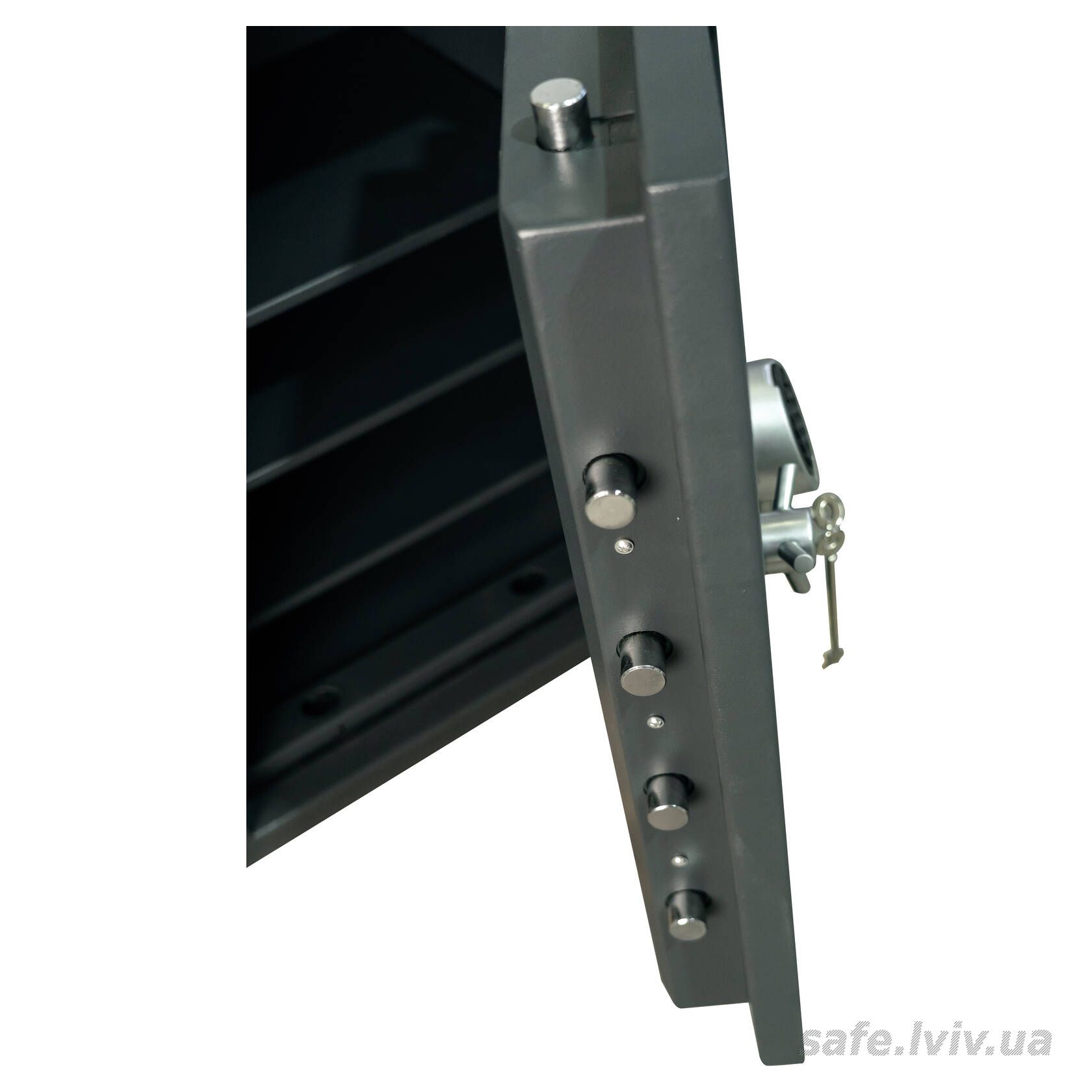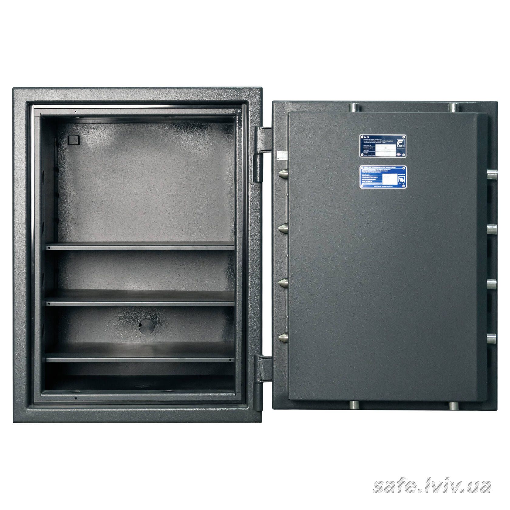 - Конструкція: корпус 50 мм (сталь - зламостійкий бетон - сталь), двері 110 мм (сталь - зламостійкий бетон - сталь); ригельна система тристороння, 8 ригелів Ø 25 мм.