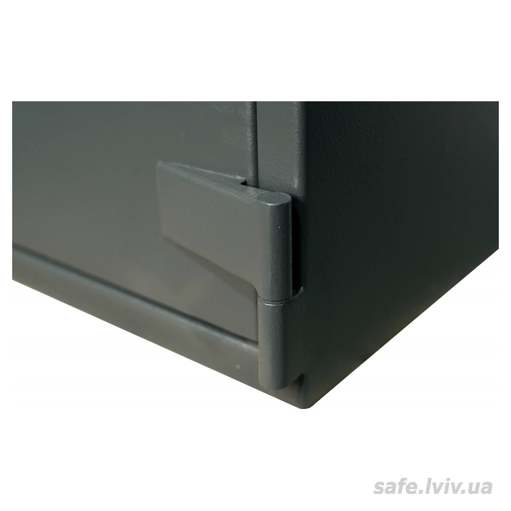 - Конструкція: корпус 50 мм (сталь - зламостійкий бетон - сталь), двері 110 мм (сталь - зламостійкий бетон - сталь); ригельна система тристороння, 8 ригелів Ø 25 мм.