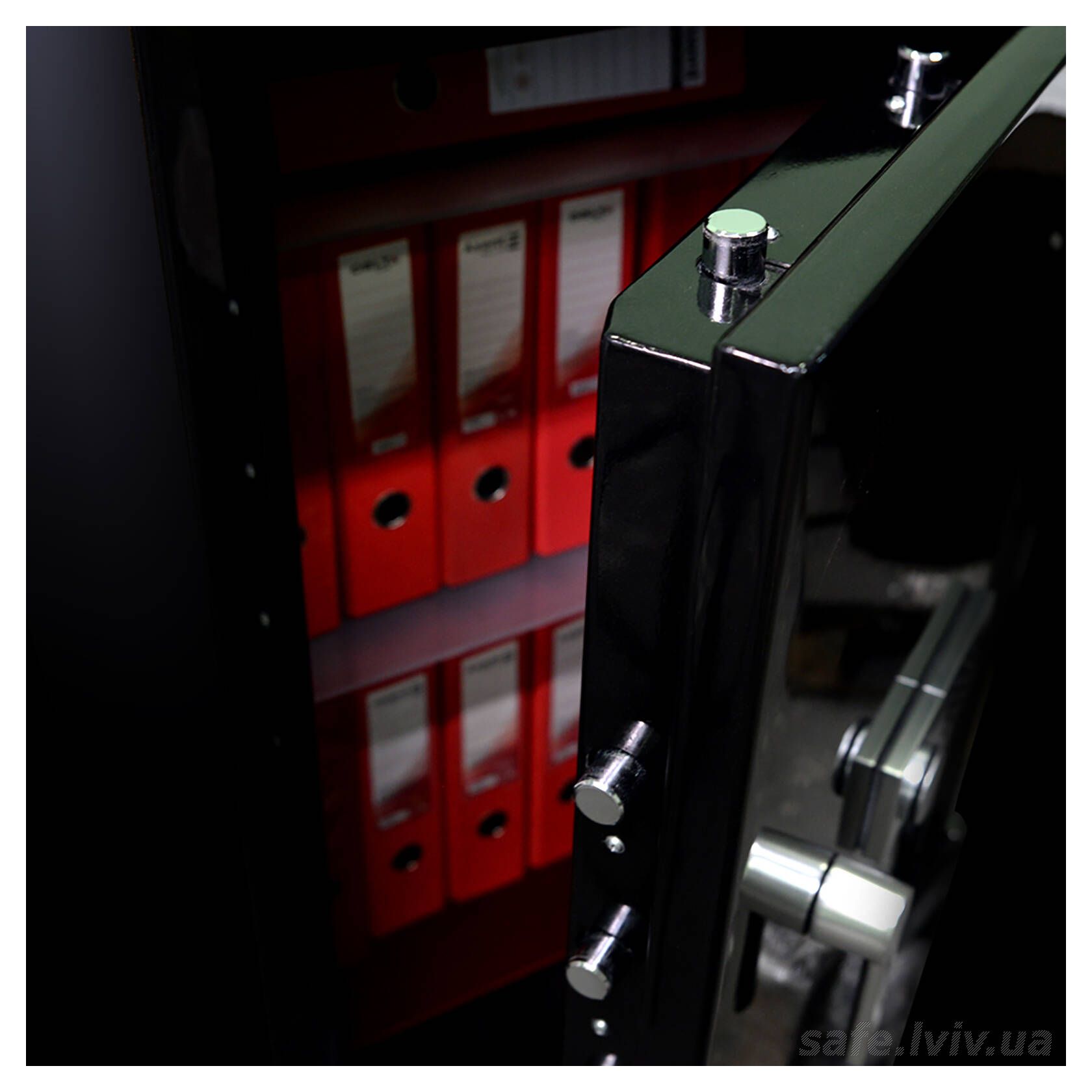 - Конструкція: корпус 50 мм (сталь - зламостійкий бетон - сталь), двері 110 мм (сталь - зламостійкий бетон - сталь); ригельна система тристороння, 8 ригелів Ø 25 мм.