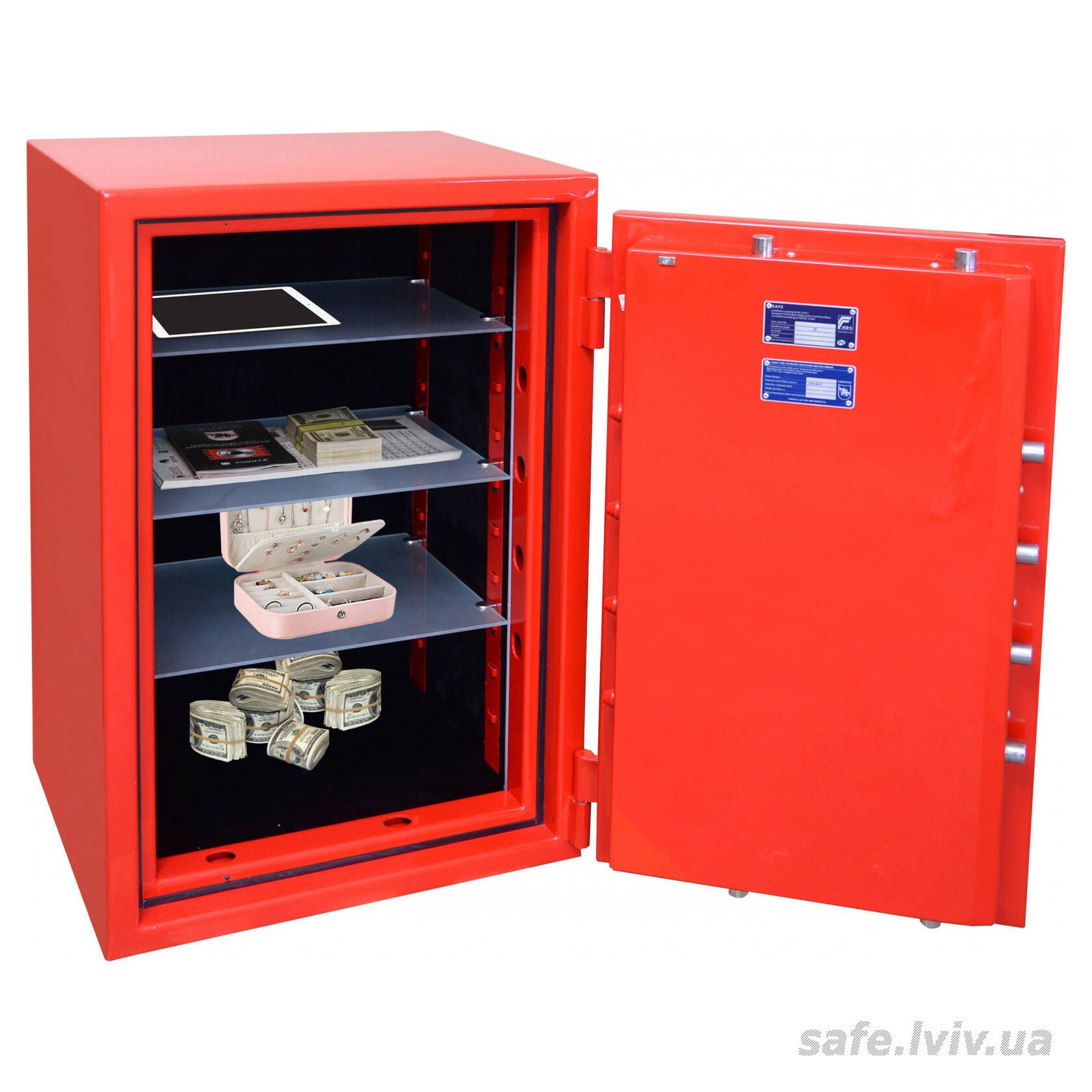 - Замок: електронний Kaba Combi (Німеччина) VdS Class 2 (B); мінімум один сертифікований сейфовий замок класу B (VdS2).