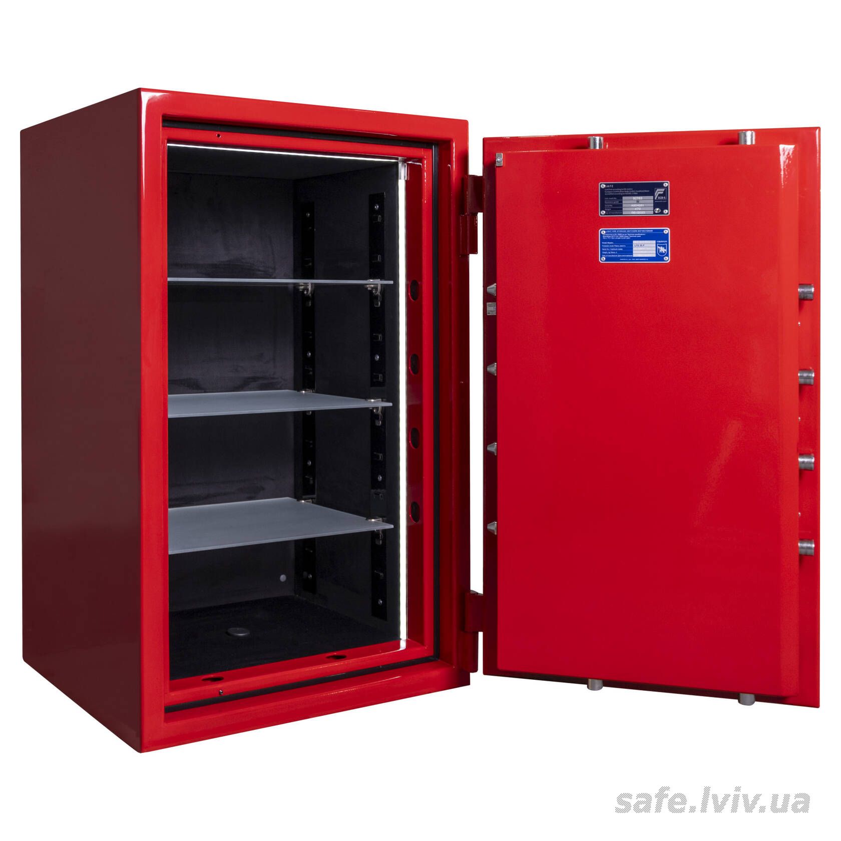 Griffon CLE.III.95.E Combi Gloss Red це сертифікований сейф клас III за EN 1143-1 та вогнестійкість LFS 30P за EN 15659, випробуваний у Німеччині європейським органом сертифікації ECB-S. Призначений для надійного зберігання грошей, коштовностей і документів у банках, офісах та приватних будинках. Зламостійкість забезпечує конструкція корпусу 50 мм (сталь - зламостійкий бетон - сталь), дверей 110 мм (сталь - зламостійкий бетон - сталь), ригельна система тристороння, 8 ригелів Ø 25 мм, замок - електронний Kaba Combi (Німеччина) VdS Class 2 (B). Товщина захисного шару 50 мм. Рекомендовані ліміти зберігання - до 8000 мінімальних зарплат для особистого користування та до 4000 для комерційного.