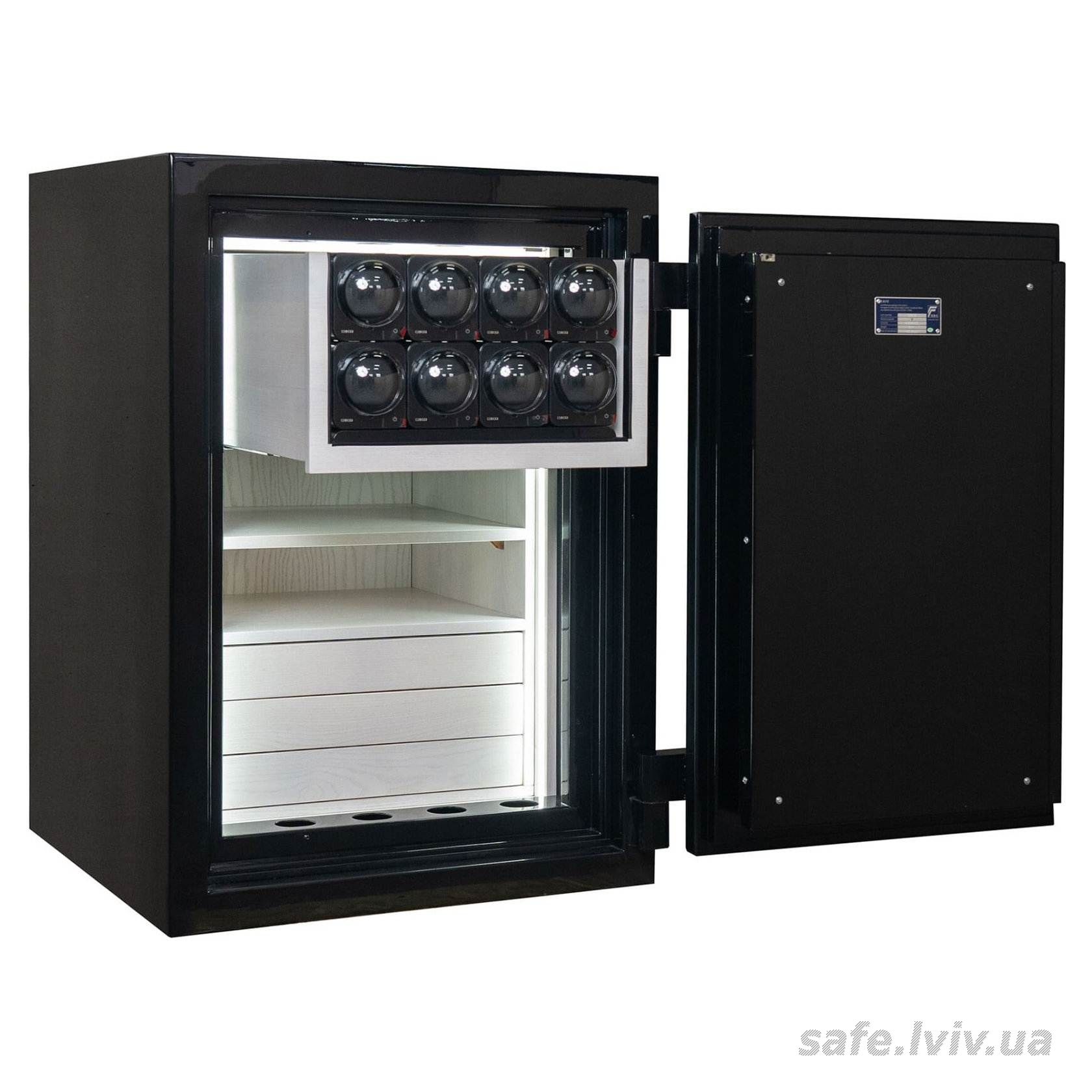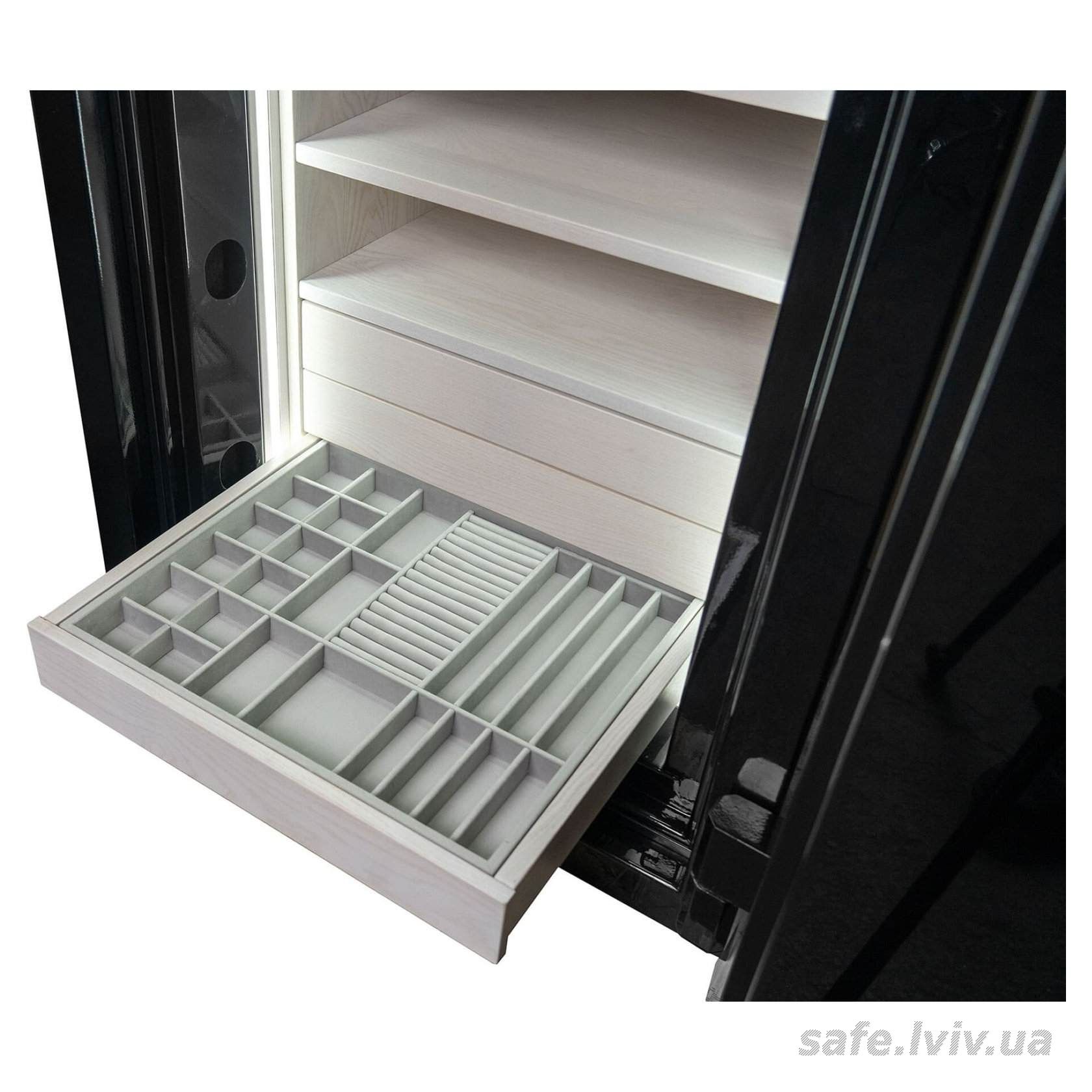- Комплектація: 3 шухляди, внутрішнє оздоблення, 1 полиця, підсвітка, скринька для підзаводу 6 годинників; отвори для анкерування до підлоги.
