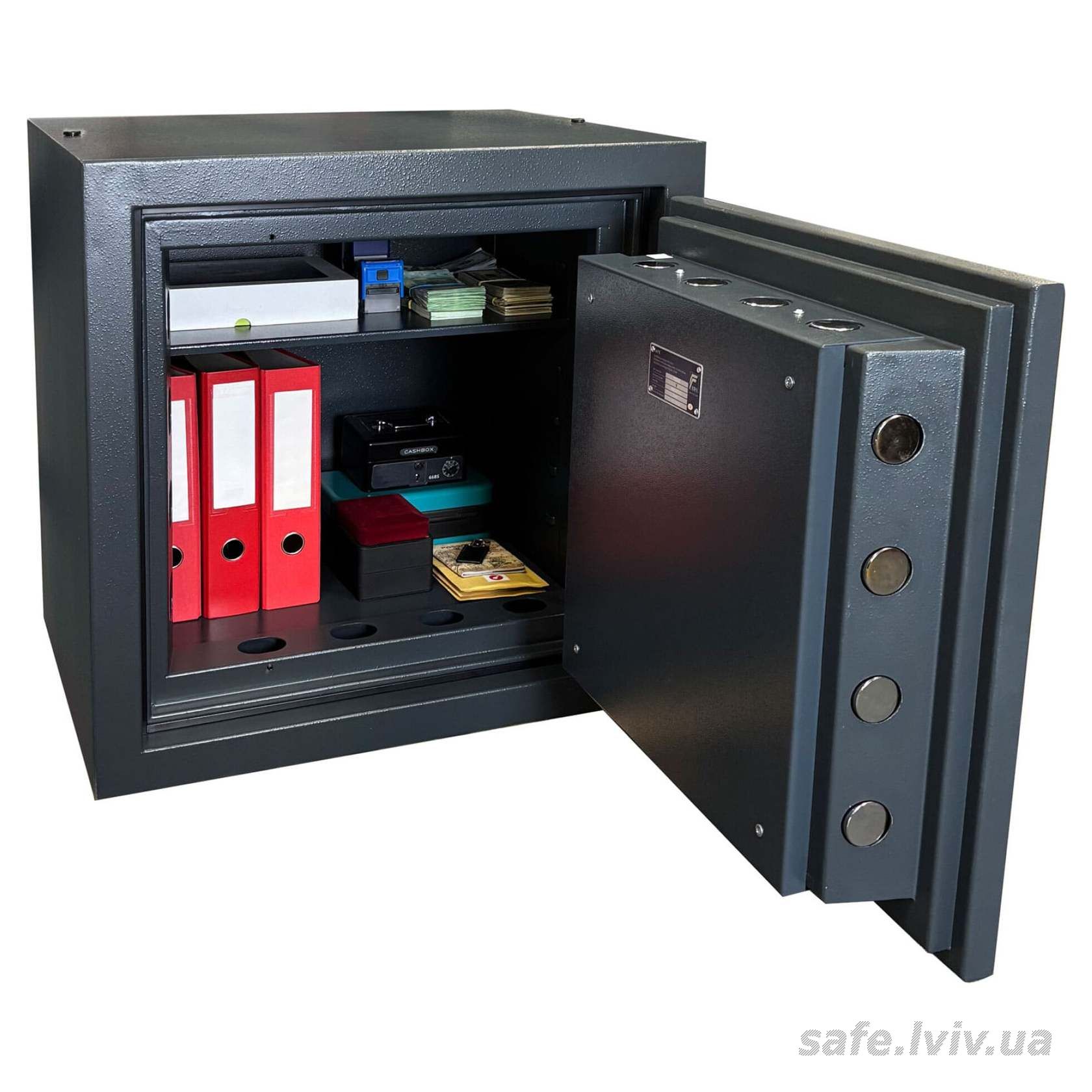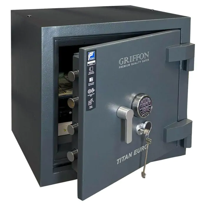 Griffon CLE.V.70.K.E це сертифікований сейф клас V за EN 1143-1 та вогнестійкість LFS 30P за EN 15659, призначений для надійного зберігання грошей, коштовностей і документів у банках, фінансових установах, офісах та приватних будинках. Зламостійкість забезпечує конструкція корпусу 80 мм (сталь - зламостійкий бетон - сталь), дверей , ригельна система тристороння, 12 ригелів Ø 40 мм та замок - ключовий WITTKOPP (Німеччина) VDS 2 (B), електронний Easthouse (Китай) VdS Class 2 (B). Рекомендовані ліміти зберігання - до 20 000 мінімальних зарплат для особистого користування та до 10 000 для комерційного.