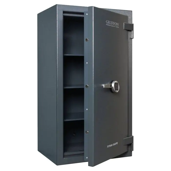 Griffon CLW.II.130.E це сертифікований сейф клас II за EN 1143-1, призначений для надійного зберігання грошей, документів і цінностей у банках, офісах і приватних помешканнях. Зламостійкість забезпечує конструкція корпусу 55 мм (сталь - зламостійкий бетон - сталь), дверей 10 мм (сталь), ригельна система тристороння, 7 ригелів Ø 25 мм, гартовані пластини у зоні замка та замок - електронний SMARTLOCK (Італія) VdS Class 1 (A). Рекомендовані ліміти зберігання - до 4 000 мінімальних зарплат для особистого користування та до 2 000 для комерційного.